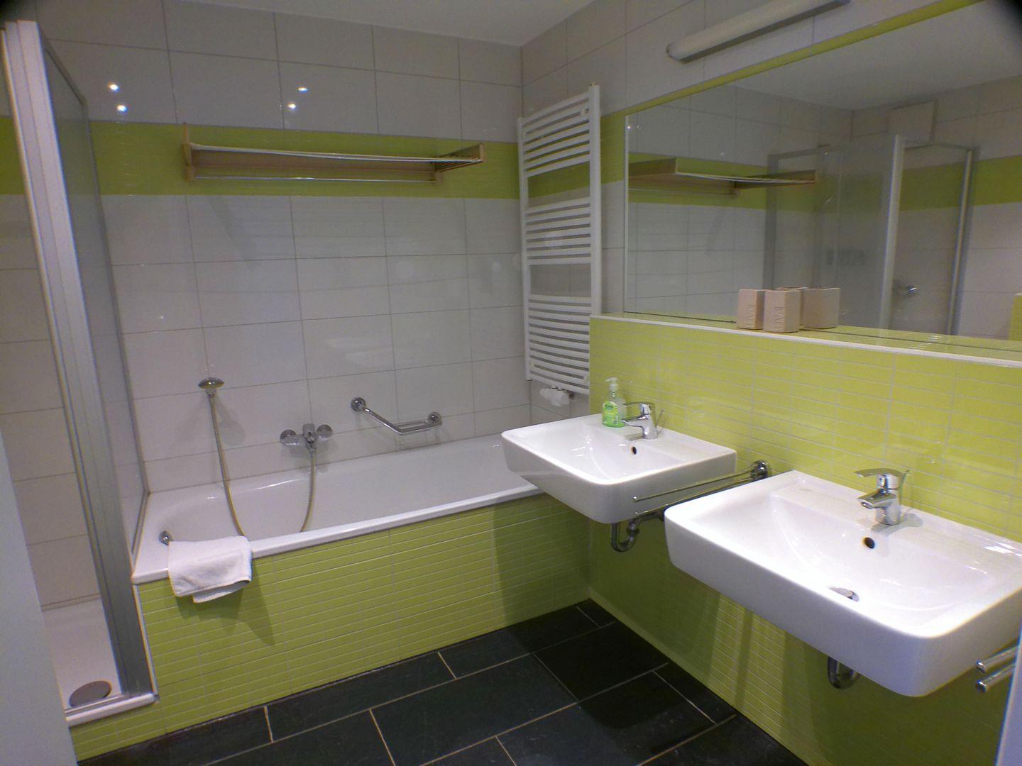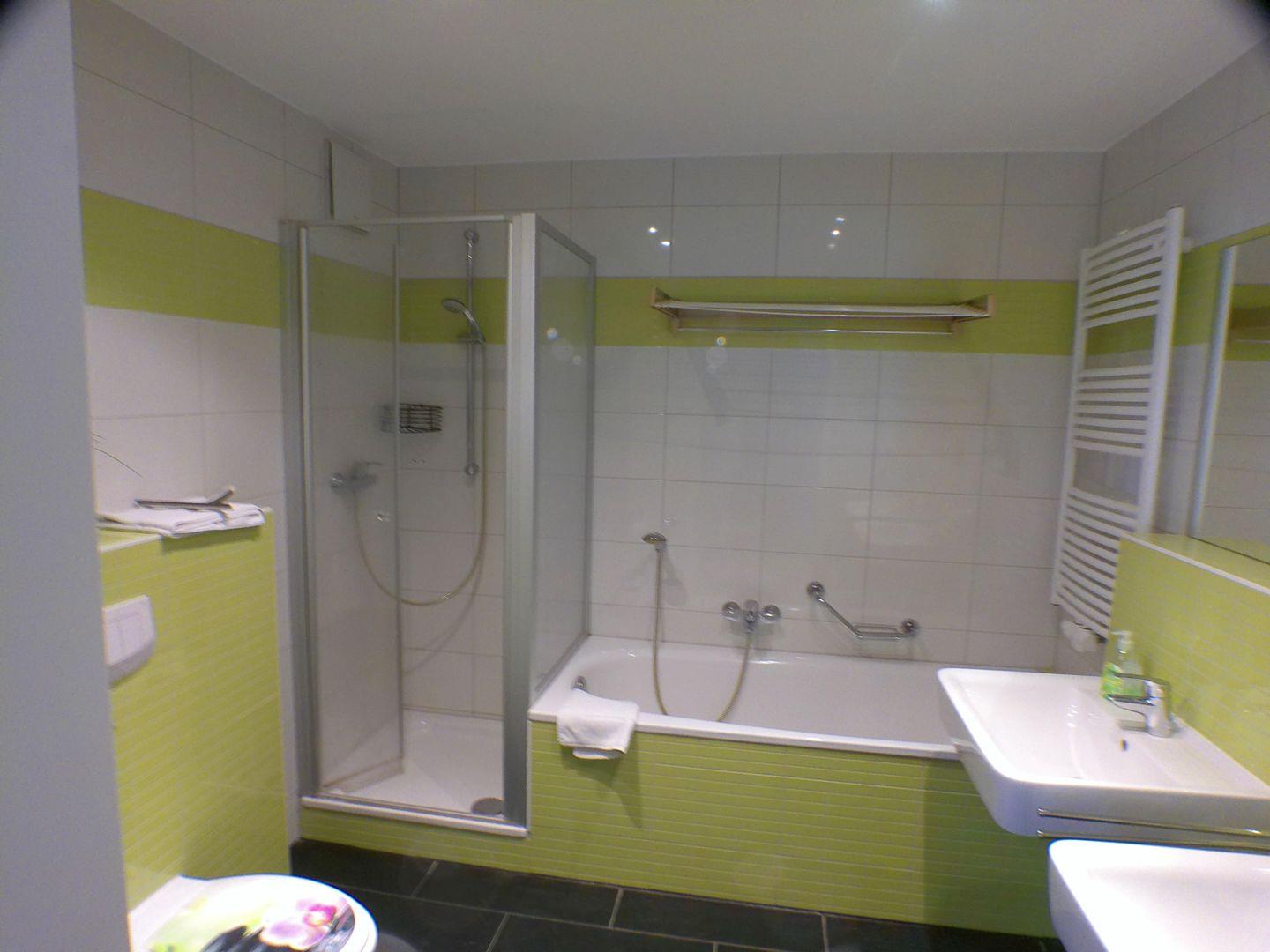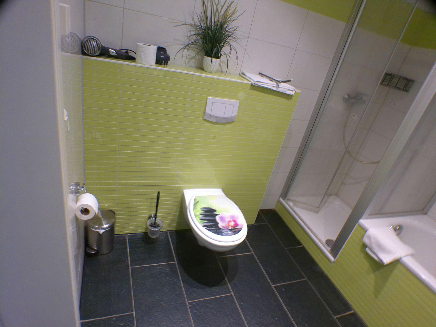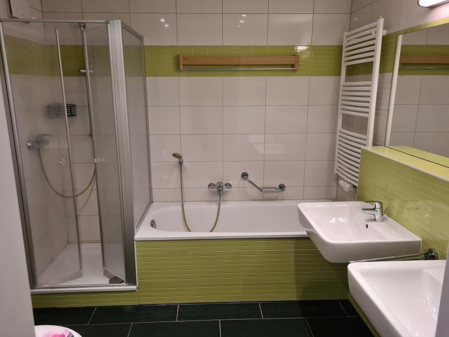 Die Wohnung verfügt über ein großzügiges Bad , ausgestattet mit Doppelwaschtisch, Dusche und Badewanne. Eine separate zweite Toilette ist vorhanden.
