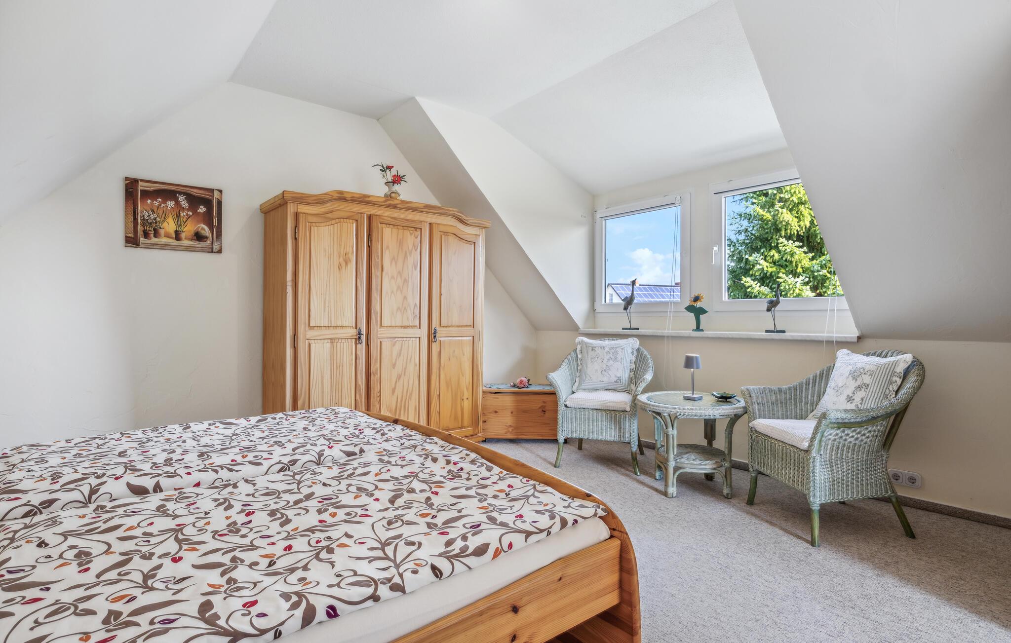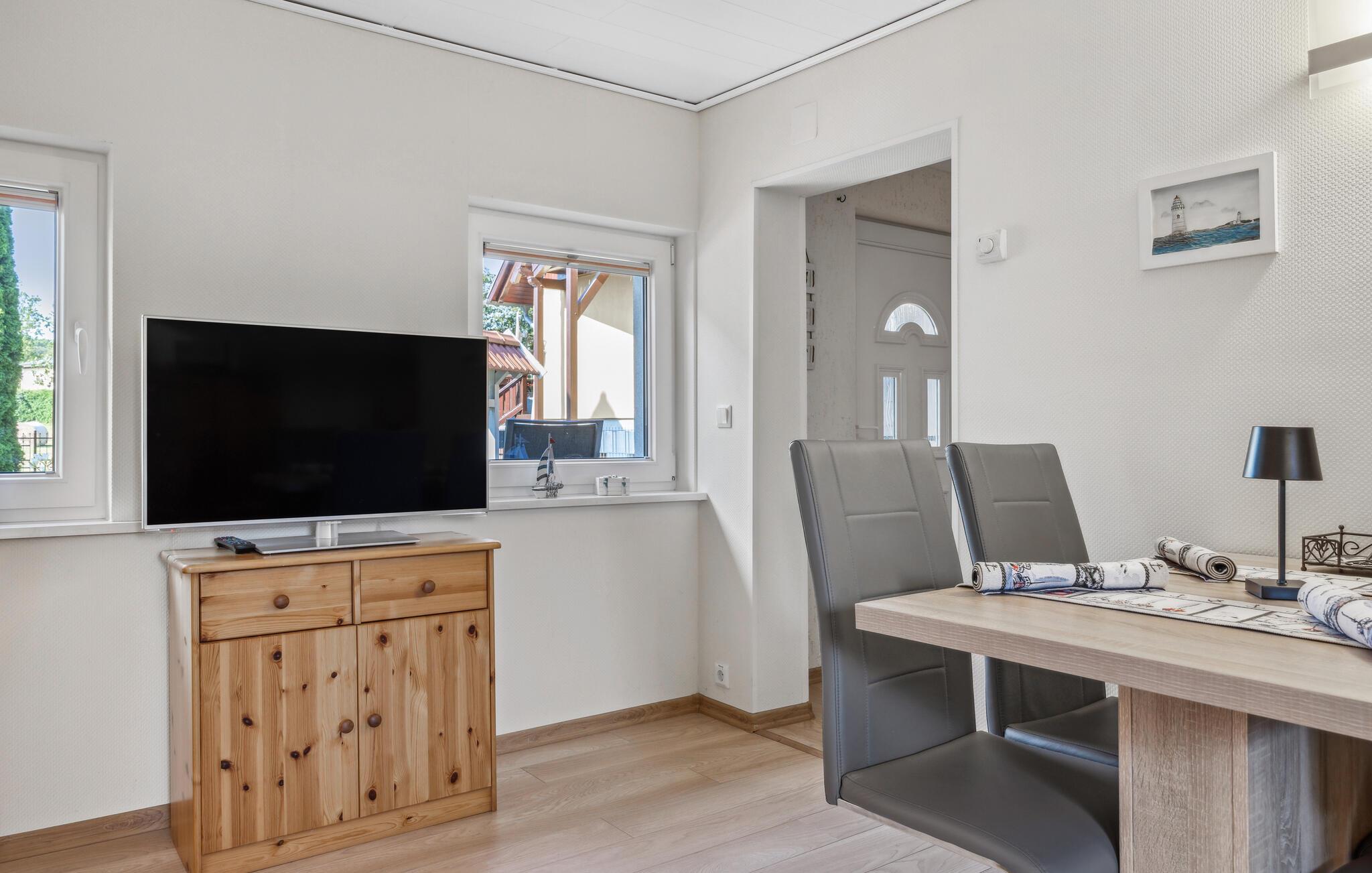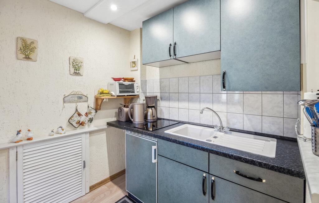 Ferieboligen ligger separat på ejerens beboelsesejendom i en rolig udkant af Stolpe. Der er cirka 1 km til en bademulighed ved Szczecin-lagunen. Der er omkring 700 meter til den lokale restaurant. Det strækker sig over to etager og kan rumme op til 3 personer. I kælderen er indrettet med opholdsstue med polstrede møbler, spiseplads, fladskærms-tv, radio, åbent minikøkken med el-komfur (2 plader), køleskab med fryserum og diverse mindre køkkenmaskiner samt en badeværelse med toilet og bruser. Soveværelset med dobbeltseng og liggestol er placeret på øverste etage og kan nås via trapper. Lejligheden har insektbeskyttelse foran soveværelsesvinduerne og en justerbar el-varmer.Dertil kommer: WiFi, møbleret terrasse med grill, 1 liggestol, cykelrum og parkeringsplads. Der er også en græsplæne til solbadning og et legeområde for børn på ejendommen.Den samlede pris inkluderer: sengelinned, vand og energiforbrug. Håndklæder skal medbringes. Stolpe er en lille by med et slot værd at se i smukke, skovklædte omgivelser på øen Usedom. Stolpe ligger i Usedom, Schweiz, omkring 3 km fra Szczecin-lagunen, hvor du kan svømme. Der er en restaurant i byen lige ved siden af slottet. Der, såvel som på slottet, finder en række arrangementer og kulturelle højdepunkter sted. Der er også et bageri i byen. I det omkringliggende område af Stolpe (ca. 5 km væk) er der også en falkefarm og en bison-indhegning som attraktioner. Der er ca. 5 km til byen Usedom med indkøbsmuligheder og ca. 23 km til Østersøen.