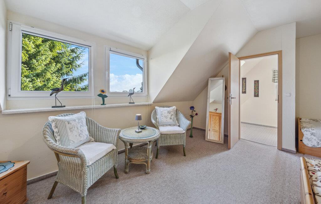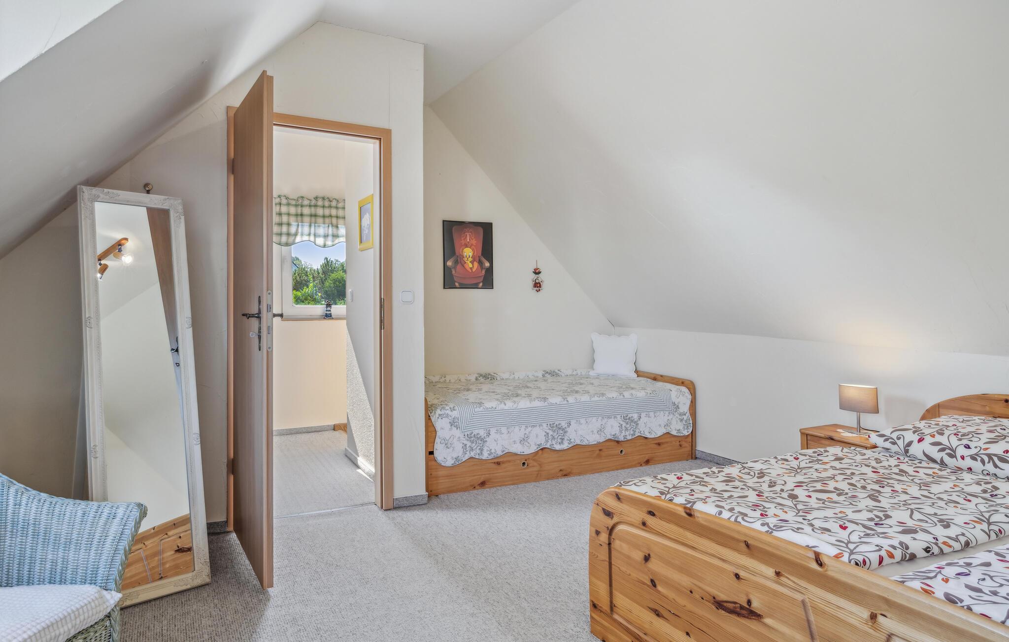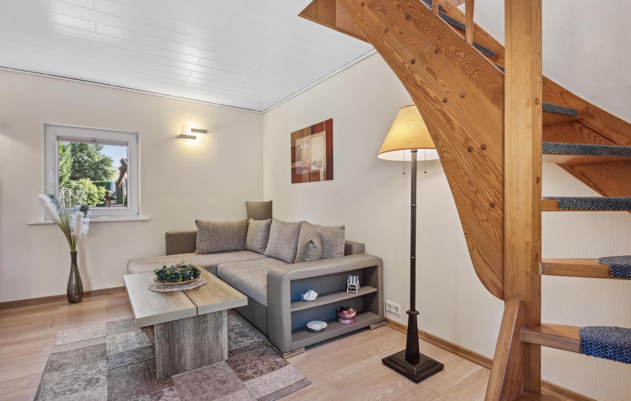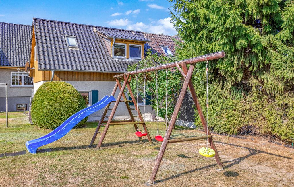 Ferieboligen ligger separat på ejerens beboelsesejendom i en rolig udkant af Stolpe. Der er cirka 1 km til en bademulighed ved Szczecin-lagunen. Der er omkring 700 meter til den lokale restaurant. Det strækker sig over to etager og kan rumme op til 3 personer. I kælderen er indrettet med opholdsstue med polstrede møbler, spiseplads, fladskærms-tv, radio, åbent minikøkken med el-komfur (2 plader), køleskab med fryserum og diverse mindre køkkenmaskiner samt en badeværelse med toilet og bruser. Soveværelset med dobbeltseng og liggestol er placeret på øverste etage og kan nås via trapper. Lejligheden har insektbeskyttelse foran soveværelsesvinduerne og en justerbar el-varmer.Dertil kommer: WiFi, møbleret terrasse med grill, 1 liggestol, cykelrum og parkeringsplads. Der er også en græsplæne til solbadning og et legeområde for børn på ejendommen.Den samlede pris inkluderer: sengelinned, vand og energiforbrug. Håndklæder skal medbringes. Stolpe er en lille by med et slot værd at se i smukke, skovklædte omgivelser på øen Usedom. Stolpe ligger i Usedom, Schweiz, omkring 3 km fra Szczecin-lagunen, hvor du kan svømme. Der er en restaurant i byen lige ved siden af slottet. Der, såvel som på slottet, finder en række arrangementer og kulturelle højdepunkter sted. Der er også et bageri i byen. I det omkringliggende område af Stolpe (ca. 5 km væk) er der også en falkefarm og en bison-indhegning som attraktioner. Der er ca. 5 km til byen Usedom med indkøbsmuligheder og ca. 23 km til Østersøen.