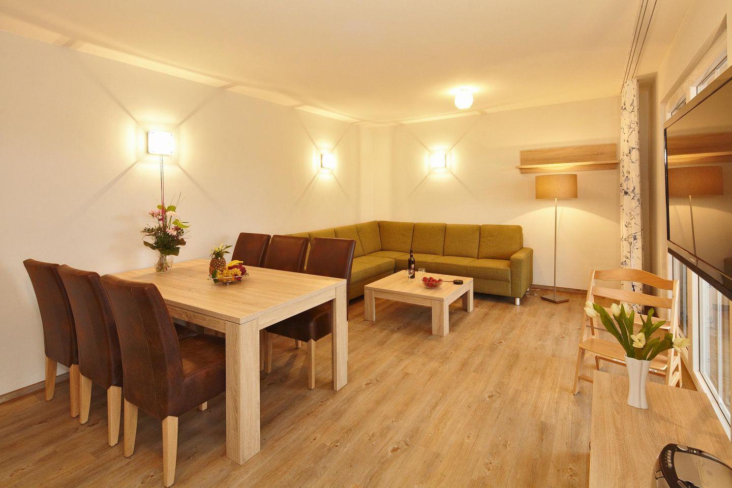 In der kombinierten Wohnküche steht die Essecke mit Platz für 6 Personen und ein grosses Sofa, die Küchenzeile ist voll ausgestattet.