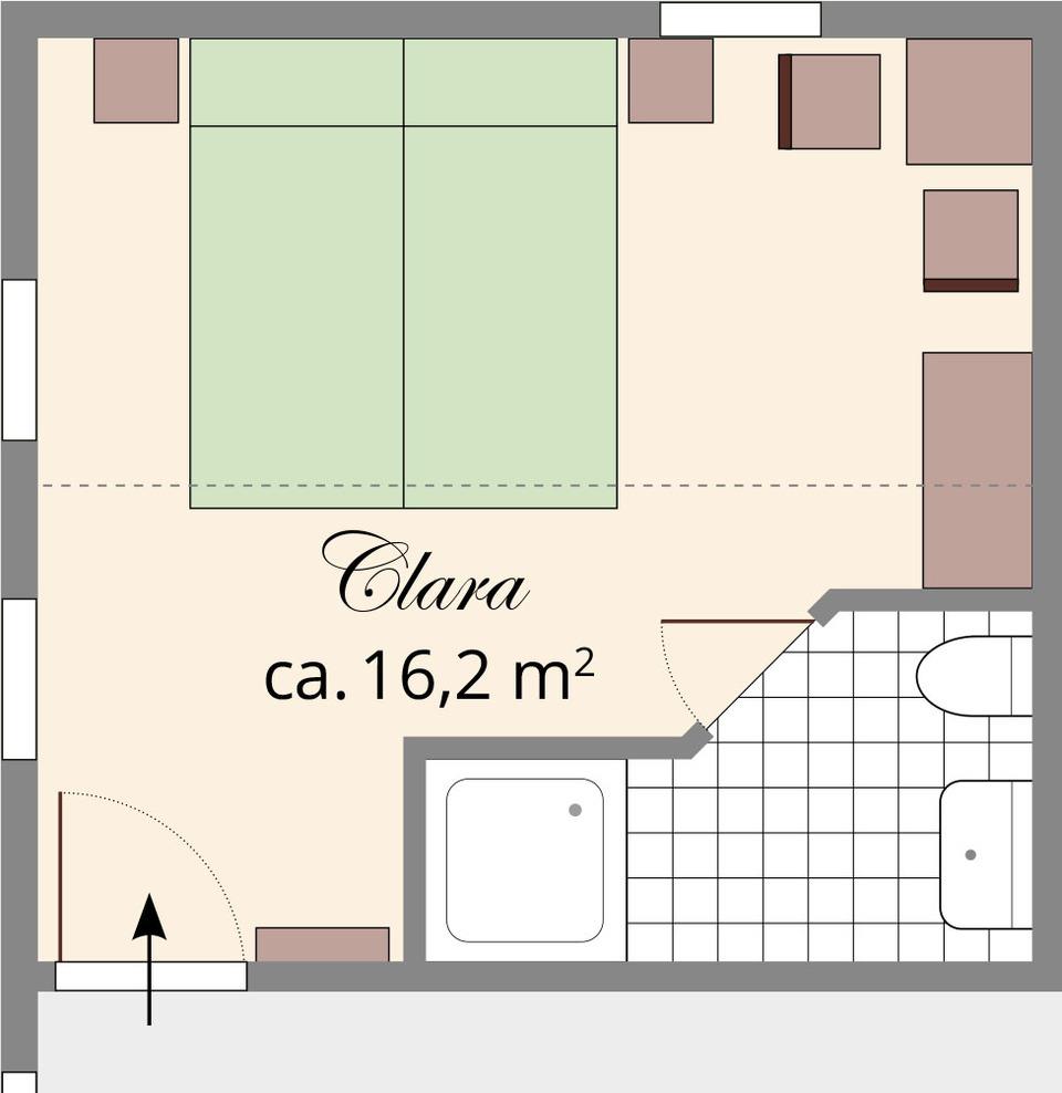 Es verfügt über 3 Fenster, von denen das liegende Dachfenster in westlicher Richtung über den Hof zeigt und 2 Fenster auf der Giebelseite des Hauses, die nach Süden ausgerichtet ist. Das Dachfenster ist mit einer textilen Jalousie versehen. Das Zimmer ist über eine massive Treppe mit 36 Stufen erreichbar, die durchgehend mit einem stabilen Metallgeländer ausgestattet ist. Es ist im ländlichen Stil eingerichtet und verfügt über ein separates Bad mit Du/WC. Zur weiteren Ausstattung gehören ein Sat-TV, ein Beistelltisch mit 2 Stühlen, ein Kleiderschrank und 2 Nachttischschränkchen. Im Bad liegt ein Haartrockner bereit. WLAN steht im Zimmer sowie in der Gaststätte zur Verfügung.