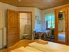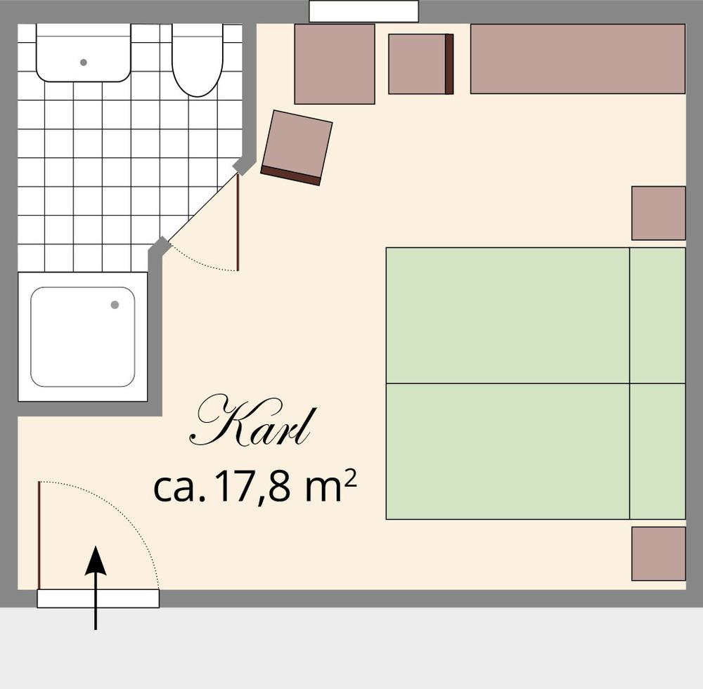 Das Zimmer ist über eine massive Treppe mit 18 bequemen Stufen erreichbar, die durchgehend mit einem stabilen Holzhandlauf ausgestattet ist. Die Durchgangshöhe durch ein Gewölbe im Erdgeschoss beträgt 1,90 m. Das Zimmer verfügt über ein nach Westen ausgerichtetes Fenster sowie ein separates Bad mit Du/WC. Ein kleines Lüftungsfenster im Bad bringt zusätzlichen Komfort. Zur weiteren Ausstattung des Zimmers gehören ein Sat-TV, der unter der Zimmerdecke montiert ist, ein Beistelltisch mit 2 Stühlen, ein großer Spiegelschrank, 2 Nachttischschränkchen und ein Standventilator. Im Bad liegt ein Haartrockner bereit. WLAN steht im Zimmer als auch in der Gaststätte zur Verfügung.