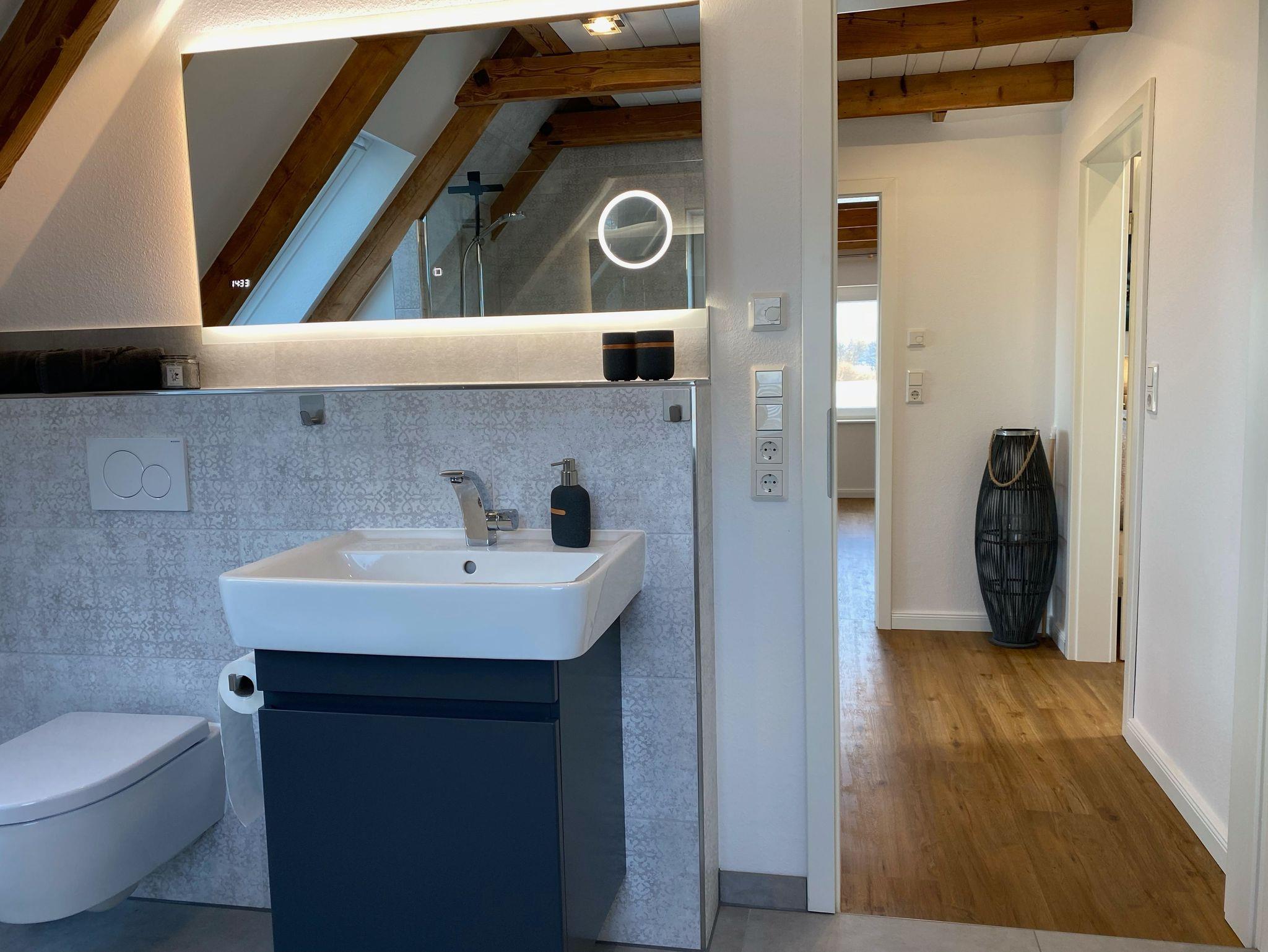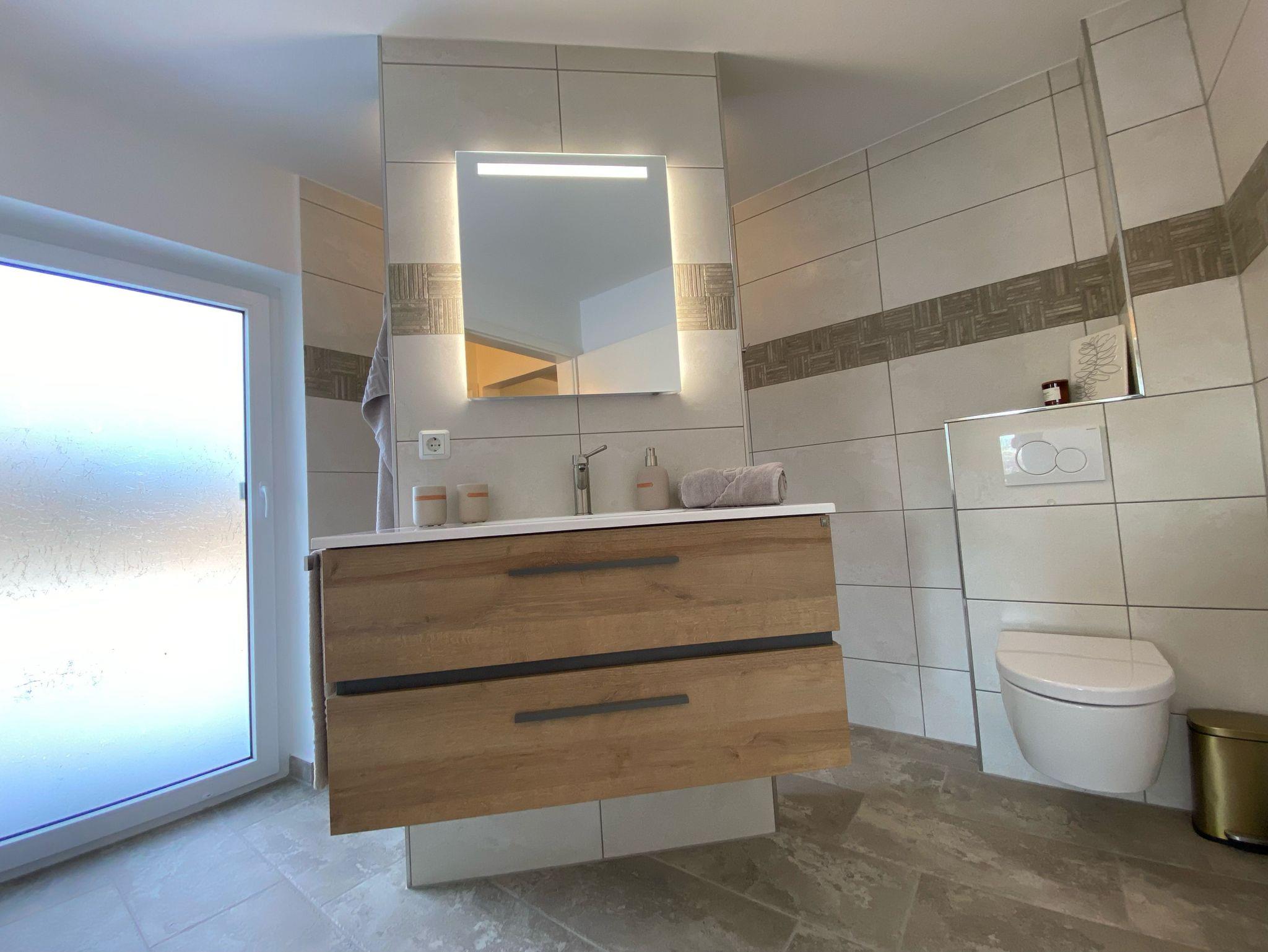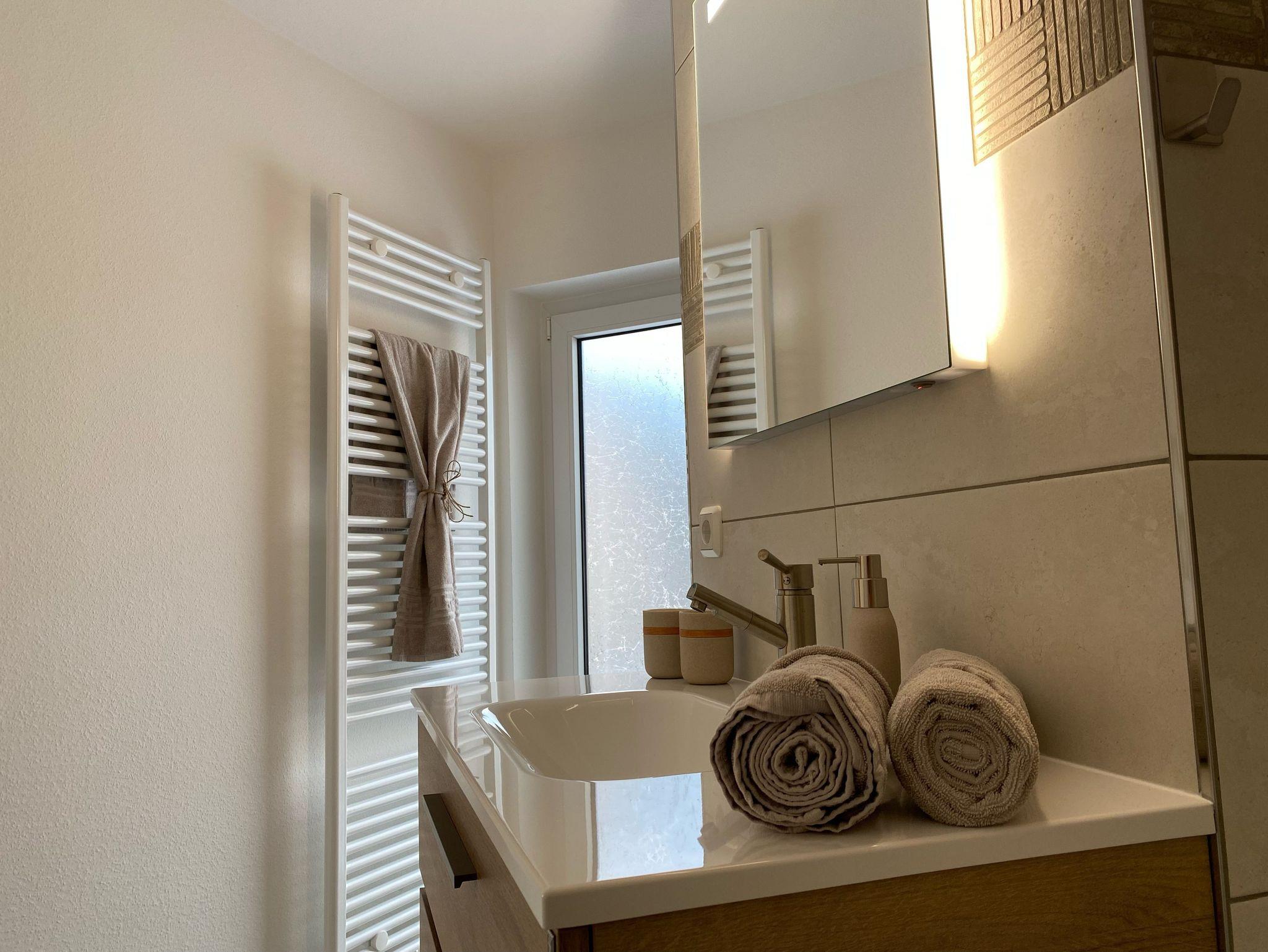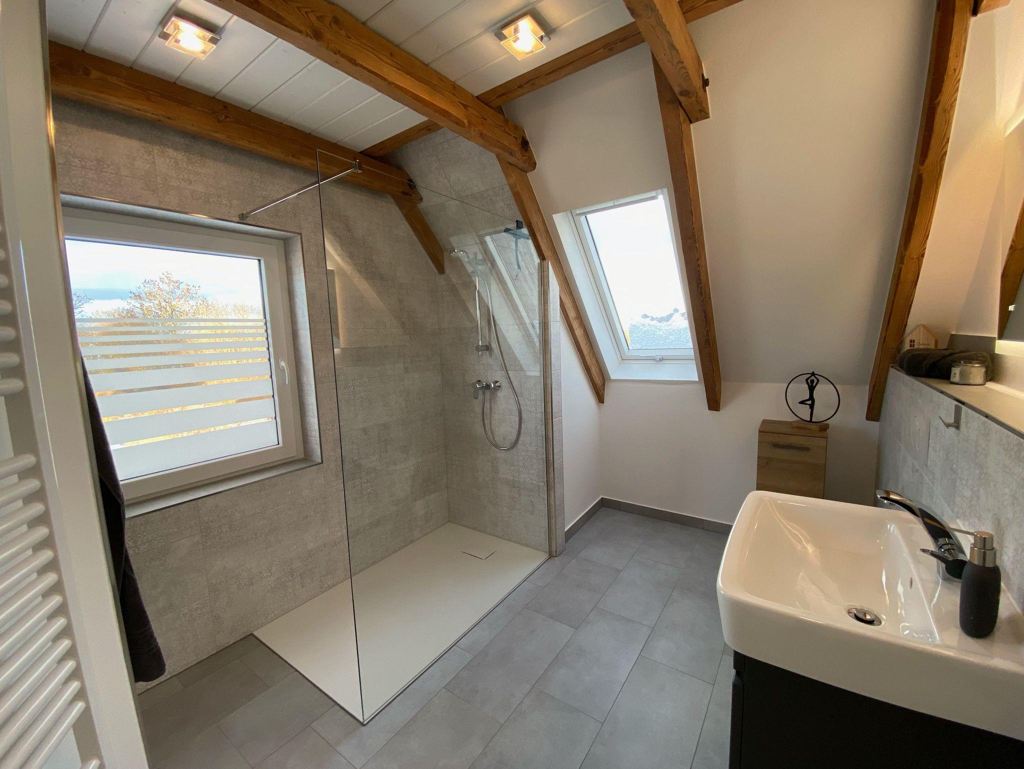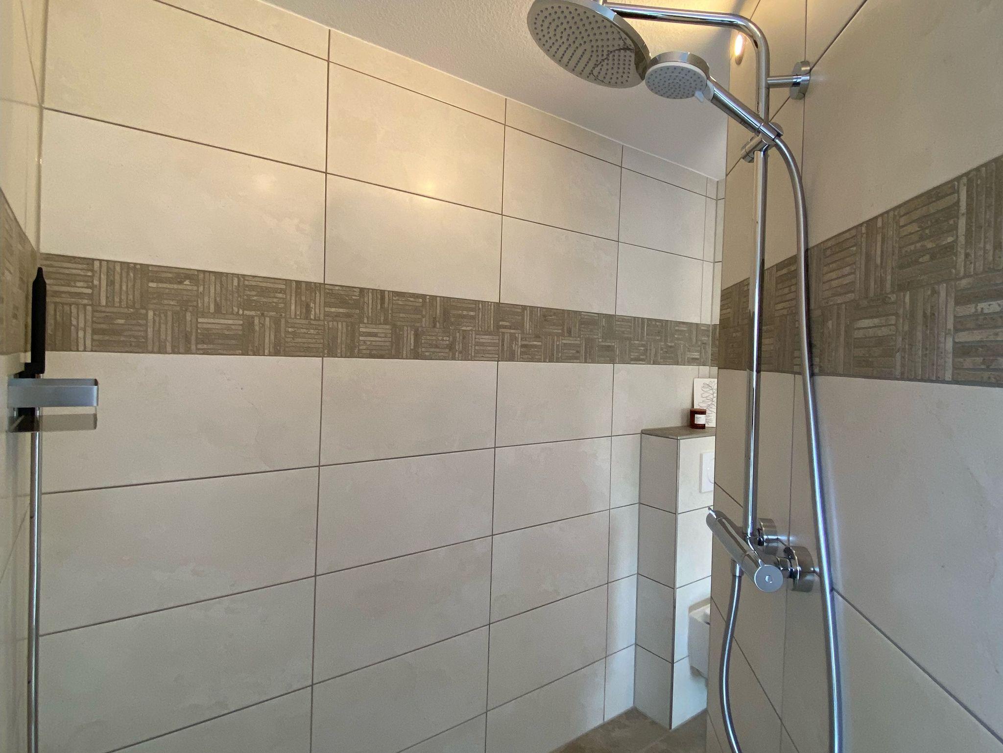 - Badezimmer mit ebenerdiger Walk-In Dusche, Handtuchwärmer, Haartrockner