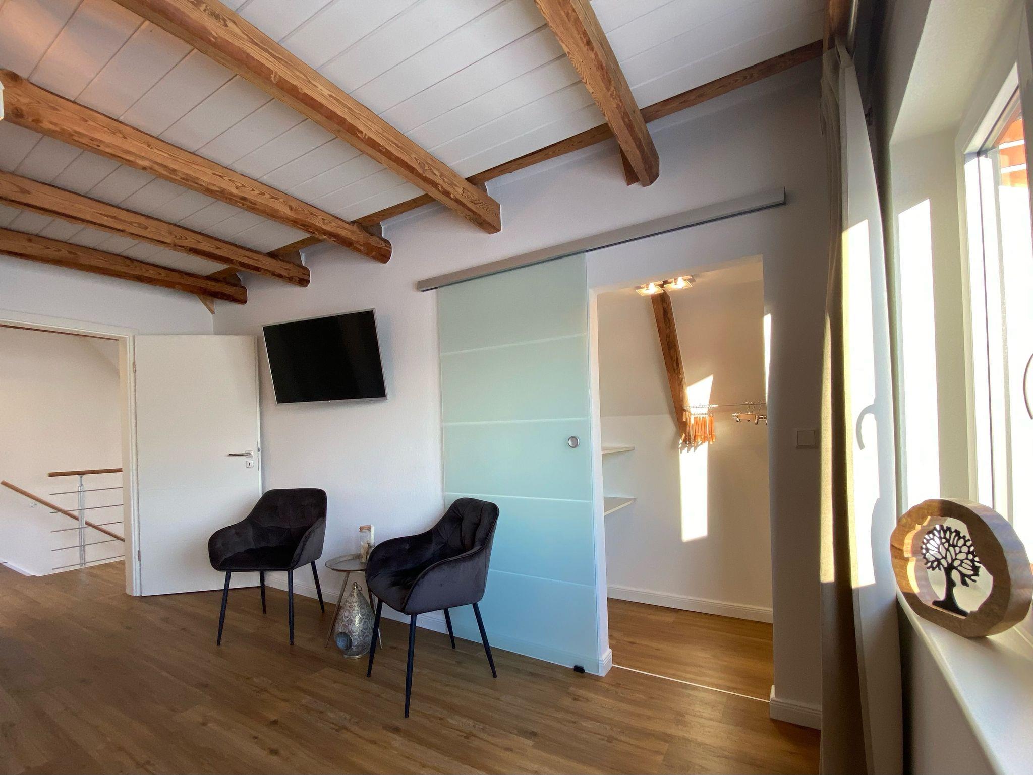 - 1 Schlafraum mit Doppelbett (Matratzen 2x 90x200), begehbarem kl. Kleiderschrank, Smart-TV, Sitzgelegenheit