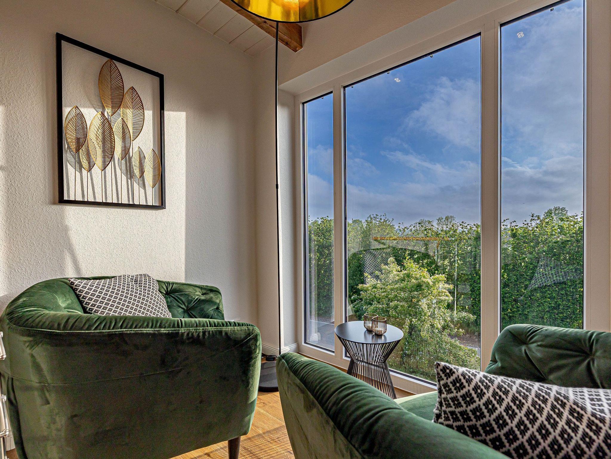 - Moderne Galerie mit Sitzgelegenheit und weitem Blick über die Felder