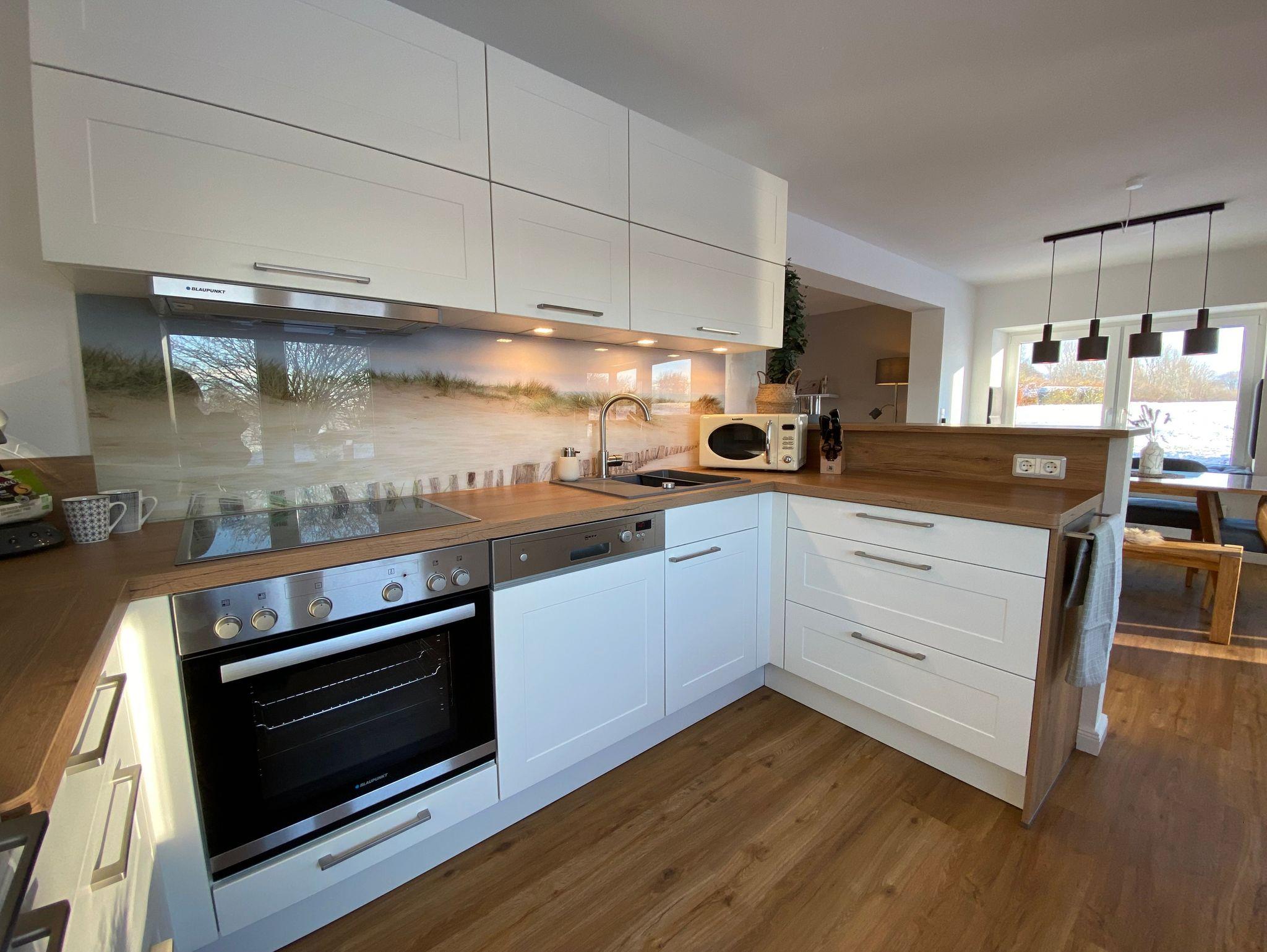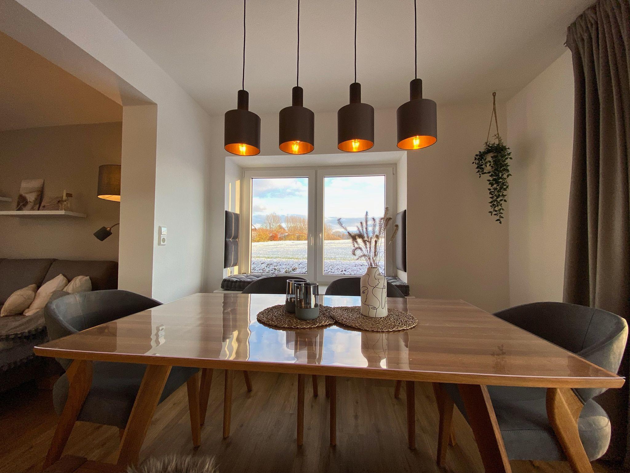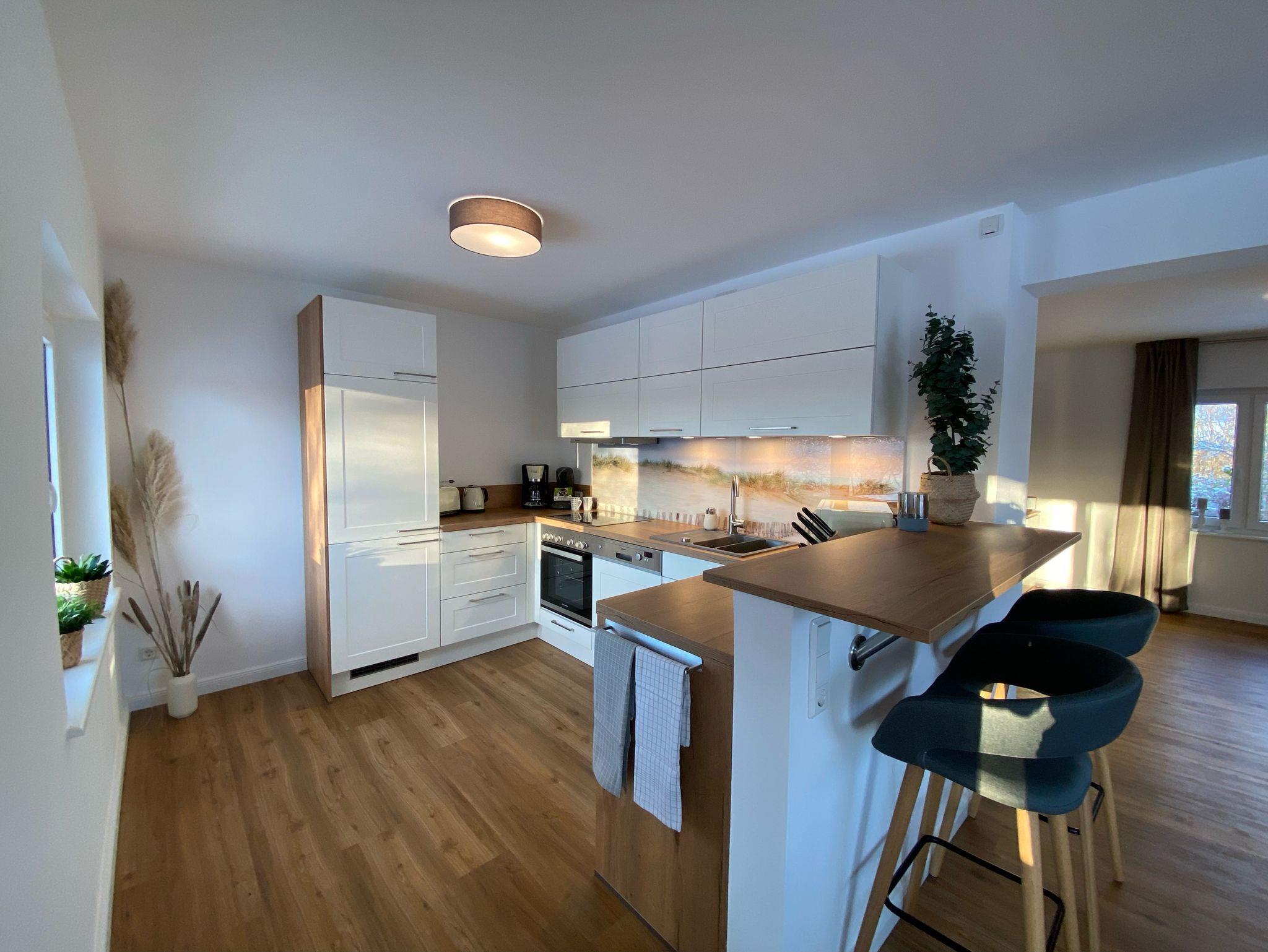- Stilvoll und moderner offener Wohn-Essbereich mit angrenzendem Tresen und Barstühlen zur offenen und voll ausgestatteten Küche (Mikrowelle, Geschirrspüler, Tiefkühler u.v.m.) Vom Essbereich gelangen Sie direkt auf die überdachte Terrasse mit Blick in den Garten und Felder