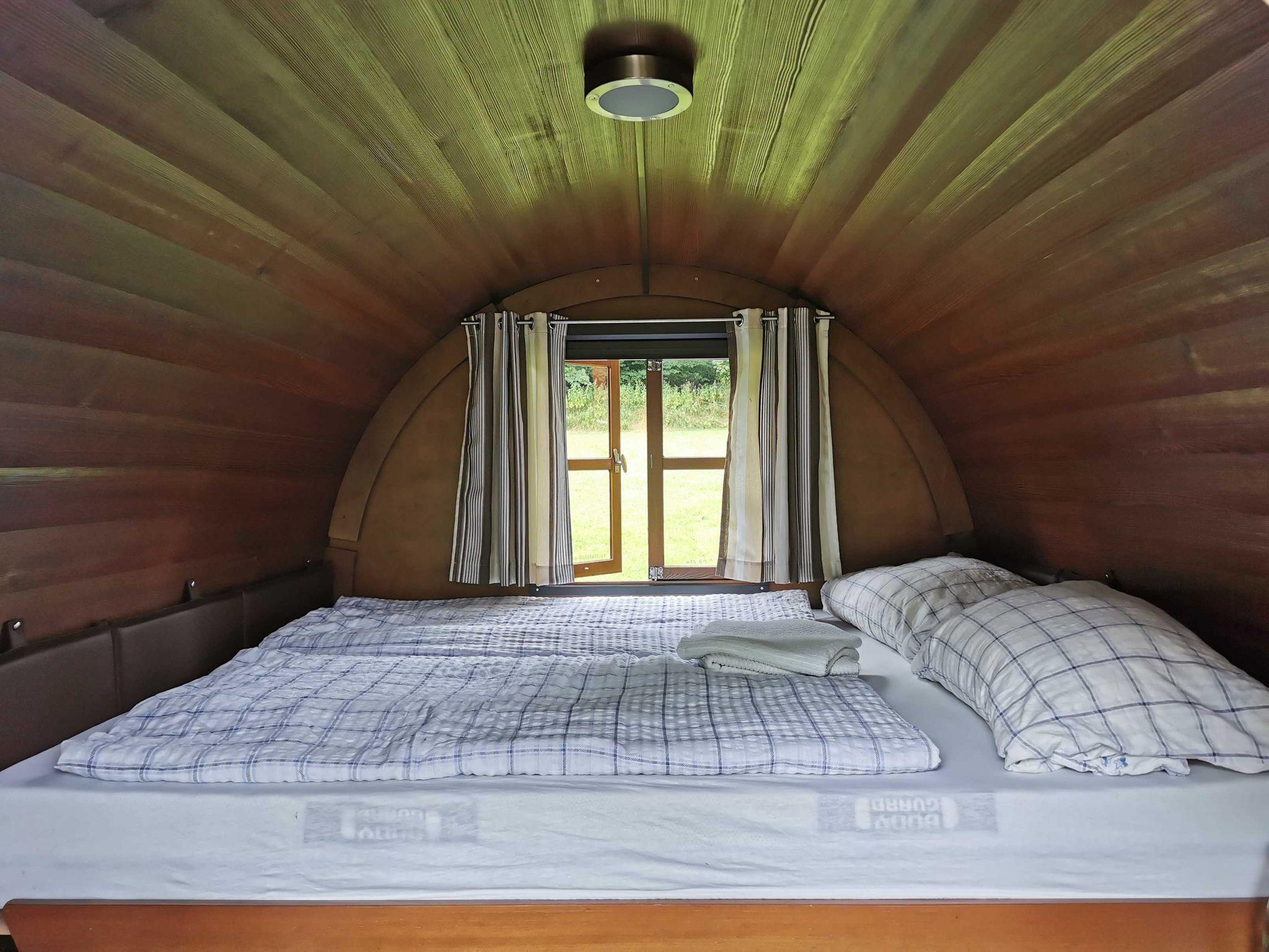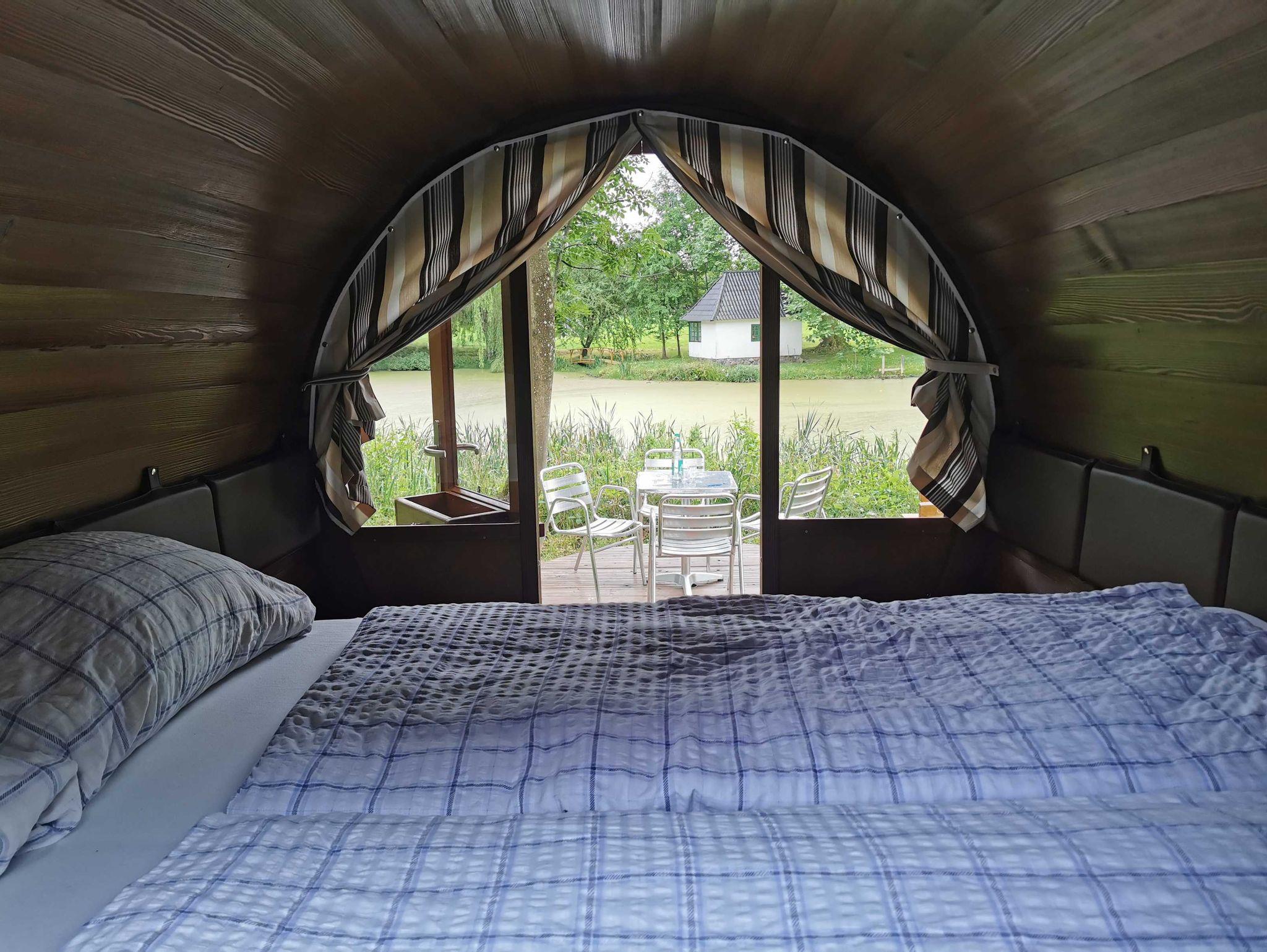 Im Innern des Fasses mit 1,85 Meter Stehhöhe befinden sich ein Doppelbett (140 x 200) und an jeder Wand eine 1 Meter lange Sitzbank. Die beiden Doppelmatratzen sind mit einem Schon- und Bettbezug versehen. Eine bezogene Bettdecke mit Kissen pro Person sind inlkusive. Gepäck wird einfach unter dem Bett verstaut. Aus dem Fenster (mit Insektenschutz) hinter dem Bett genießt man den Blick in den weiten Garten und vorne schaut man aus dem Türfenster auf den kleinen See. Licht, Strom und Heizung sind vorhanden.