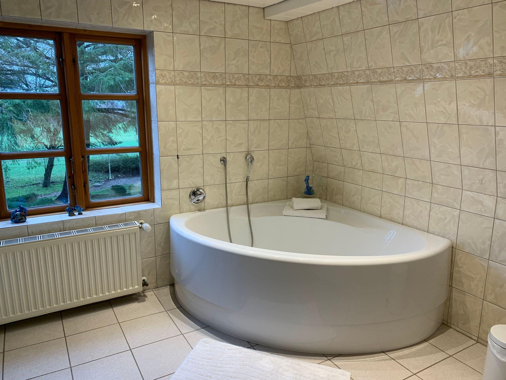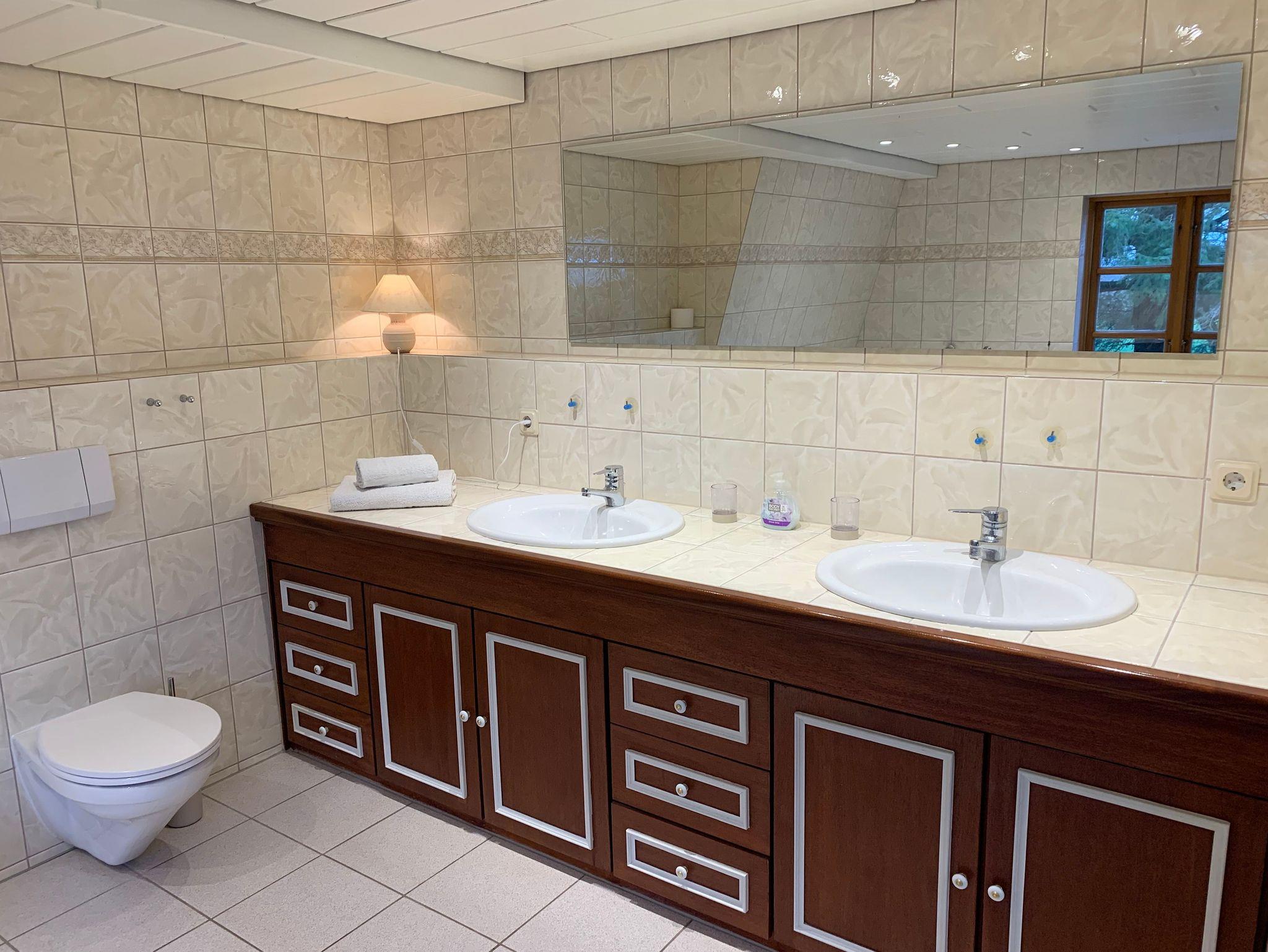 • Badezimmer mit Dusche, Eckbadewanne und zwei Handwaschbecken