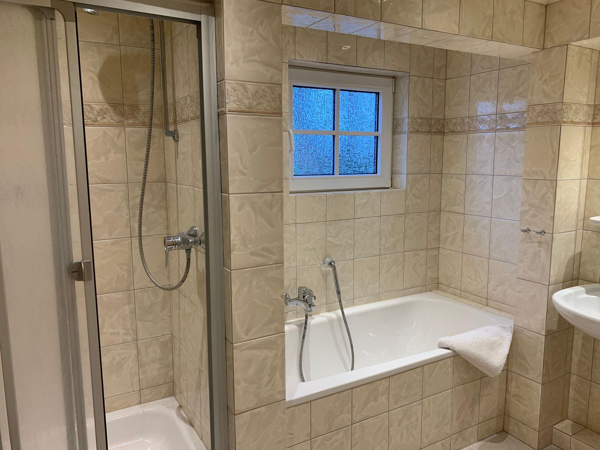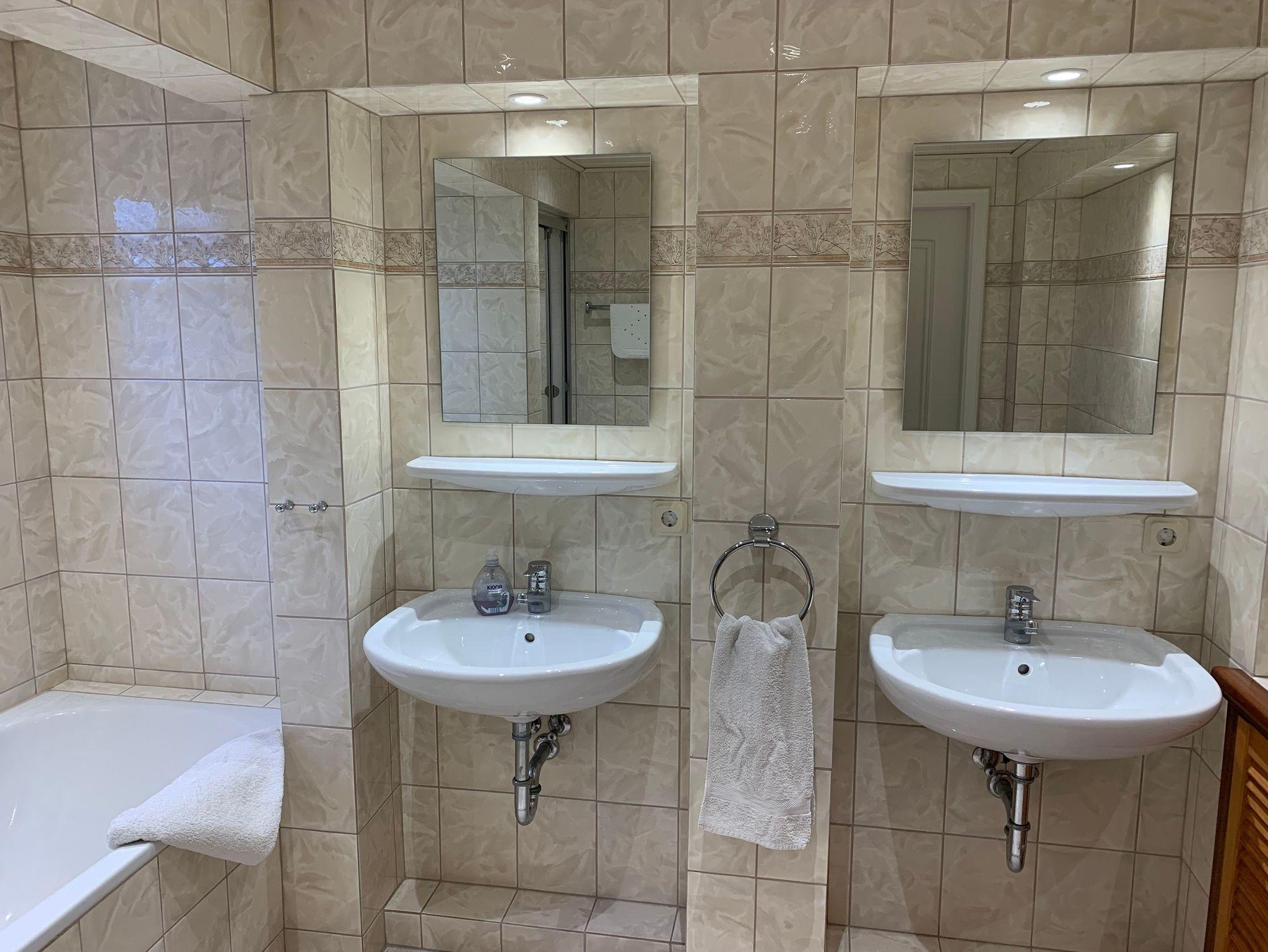• Badezimmer mit Dusche, Badewanne und zwei Handwaschbecken
