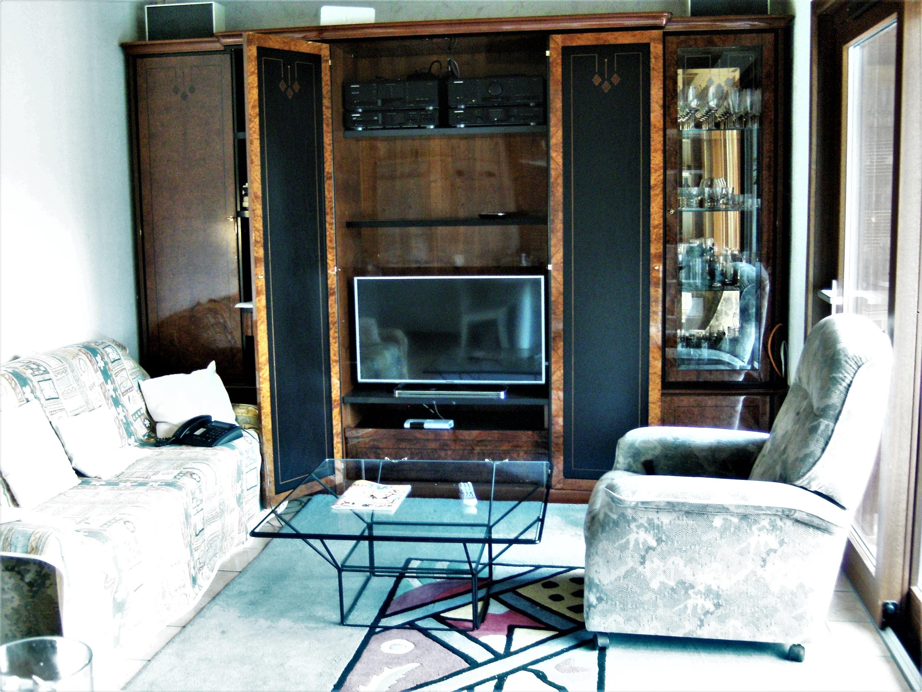Wohnzimmer mit offener Küche: Ausziehcouch mit 2 zusätzlichen Schlafmöglichkeiten, TV, kostenloses Internet via LAN und WLAN (abschaltbar wenn gewünscht), Festnetz-Telefon, Ceran-Platte mit 4 Kochfeldern, Kühlschrank, Geschirrspüler, Spüle, Esstisch mit 2 Stühlen (weitere können vom Wintergarten geholt werden) , reichlich Gläser, Geschirr und Küchenutensilien