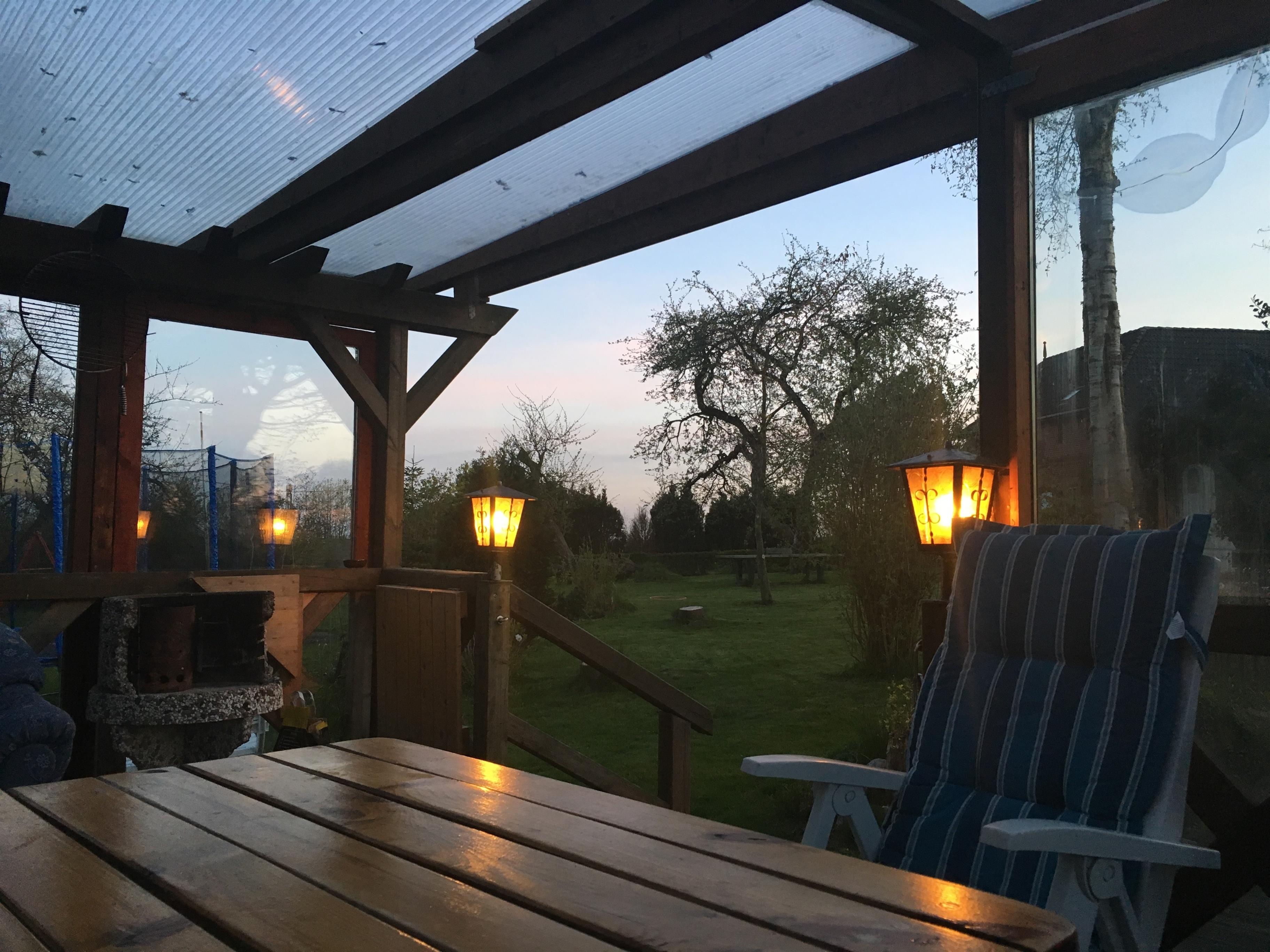 Ruhiges Ferienhaus inmitten der grünen Felder mit großem Garten, Tischtennisplatte, Basketballkorb, einem Außenkamin, Sitzplatz am Teich sowie einer gemütlichen Laube.