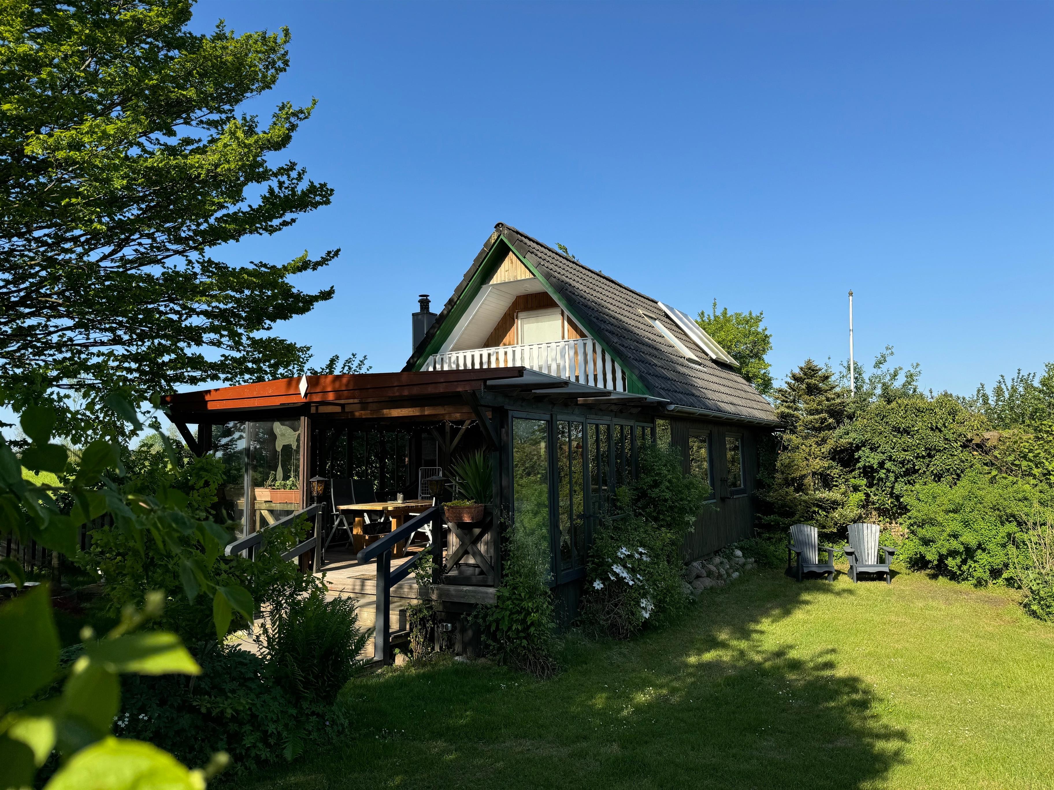 Das ruhige Ferienhaus inmitten der grünen Felder auf dem Land bietet 60 m² Wohnfläche mit moderner Wohnküche, Duschbad, vier Betten, Balkon, überdachter Terrasse, großem Garten und dänischem Holzofen – ideal für Familien.