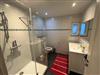 Das Badezimmer ist modern mit einer Toilette, einem Badezimmerschrank, einem Spiegel und einer großen, fast ebenerdigen Dusche ausgestattet.
