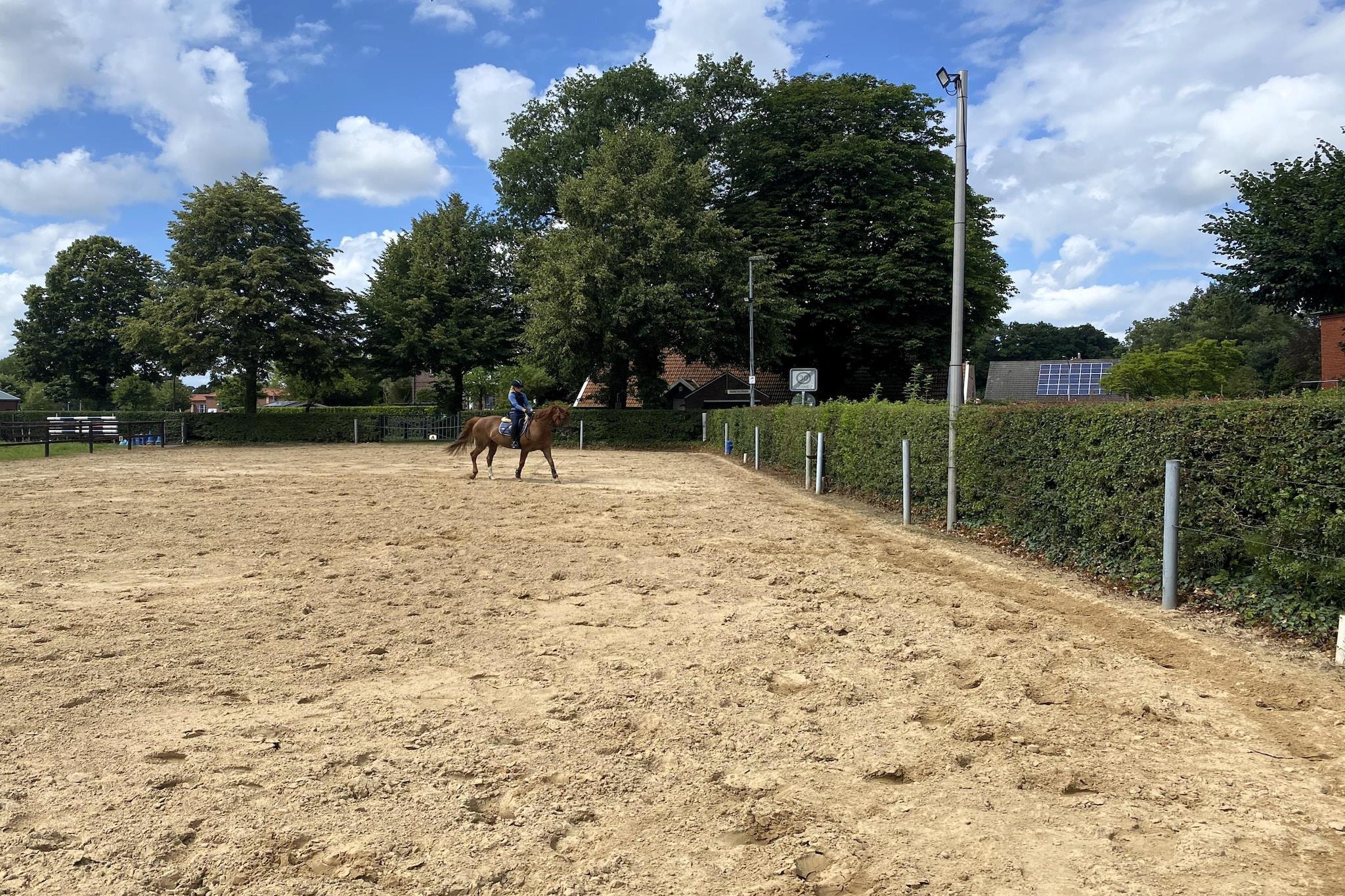 Stueetage: (åbent køkken(elkedel, brødrister, komfur, kaffemaskine, ovn, mikrobølgeovn, opvaskemaskine , køleskab(+ fryser)), stue / spisestue(Fjernsyn(parabol), radio), soveværelse(dobbeltseng), soveværelse(dobbeltsovesofa, køjeseng), badeværelse(bruser, håndvask, toilet, vaskemaskine, varme(gulvvarme))) pulterkammer(deles med andre gæster), Ridning, Legeområde, Græsplæne, tremmeseng, varme, terrasse, havemøbler, grill, parkering, trampolin, swimmingpool(deles med andre gæster, opvarmes, 8 x 4 m.), sandkasse, bordfodbold, barnestol, hyggespil, Gyngestativ, Håndklæder inkl., Sengelinned inkl.