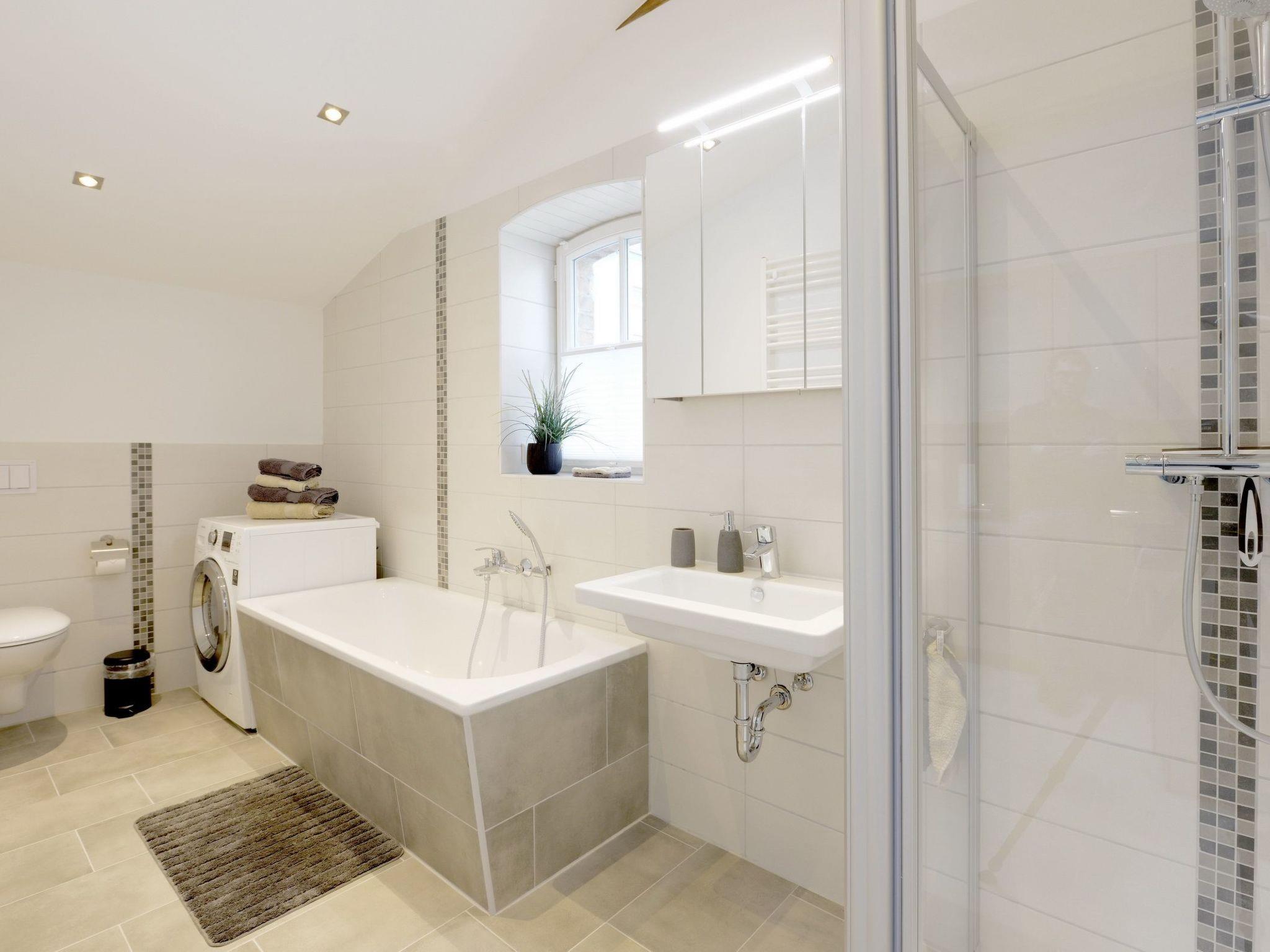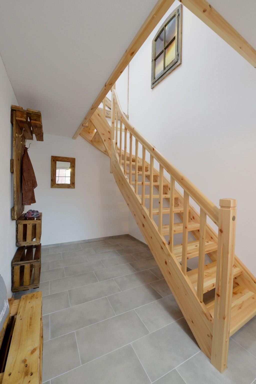 Our holiday house by the rear courtyard has a bedroom on the upper floor with a double bed and a sofa bed in the living room on the ground floor, along with the separate kitchen. There is also a lift. The upper floor also provides a bathroom with a walk-in shower, a towel radiator, a washbasin, WC and washing machine. The living room has modern furnishing and includes a dining space and a cosy sofa corner that can be converted into a bed (150cm wide). A flatscreen TV and the Wi-Fi Internet connection provide entertainment.