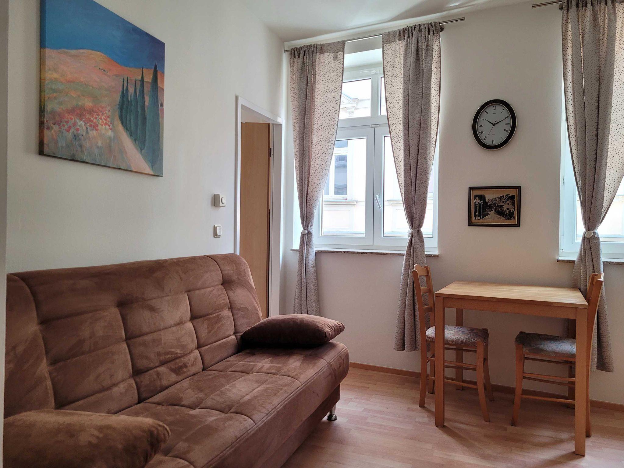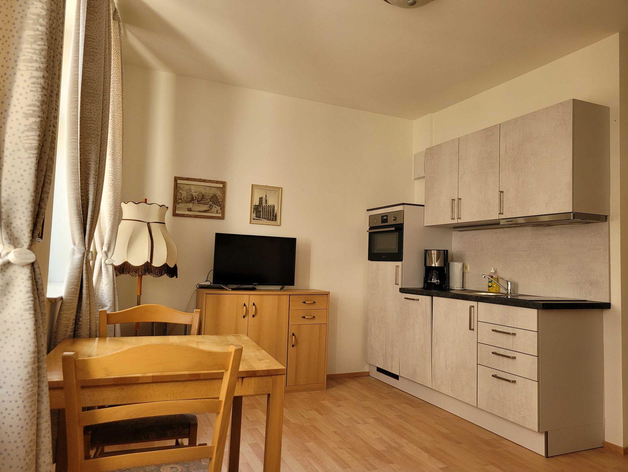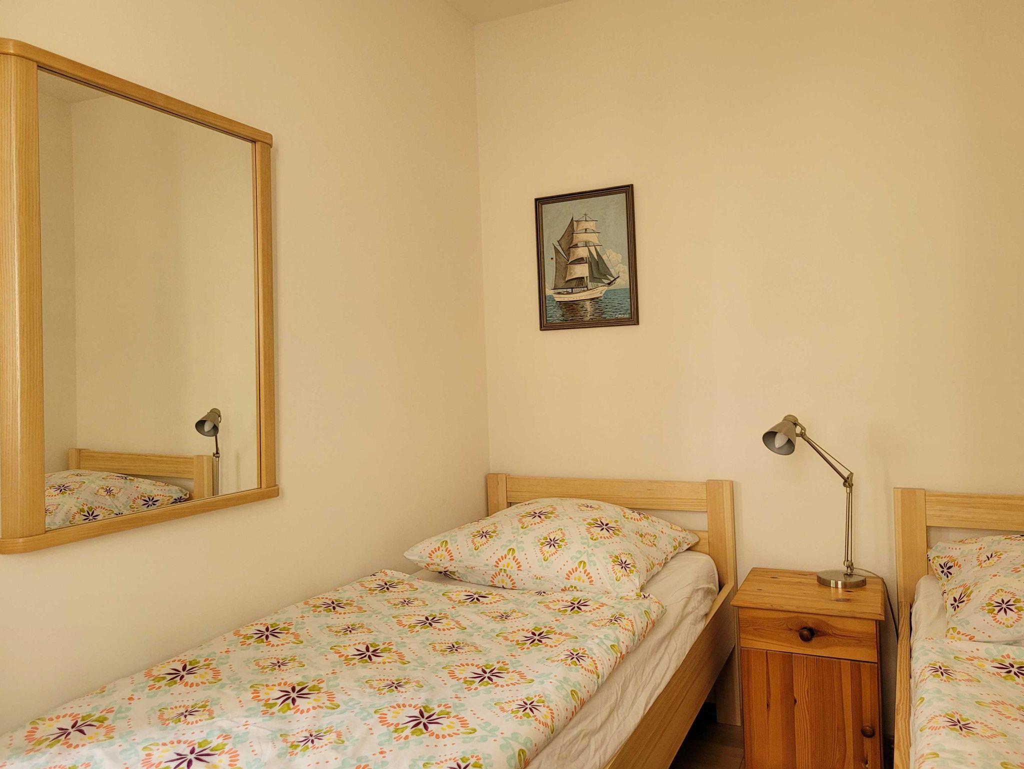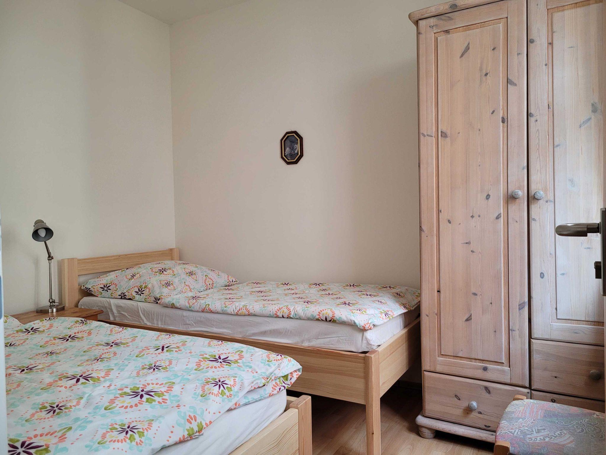 Die Wohnung verfügt über ein Wohnzimmer, Schlafzimmer mit zwei Einzelbetten, Wohnküche, Bad mit Dusche/WC und liegt zur Straßenseite (Kopfsteinpflaster).