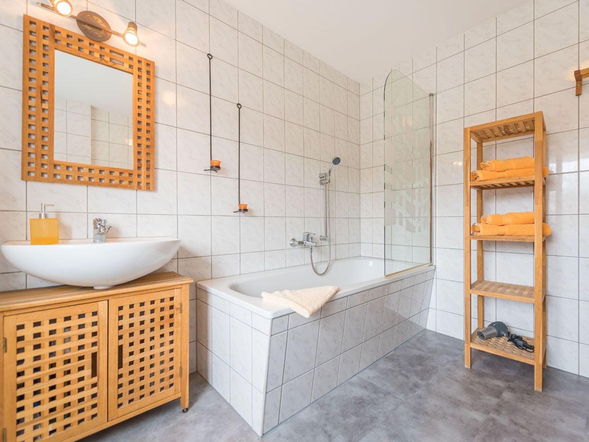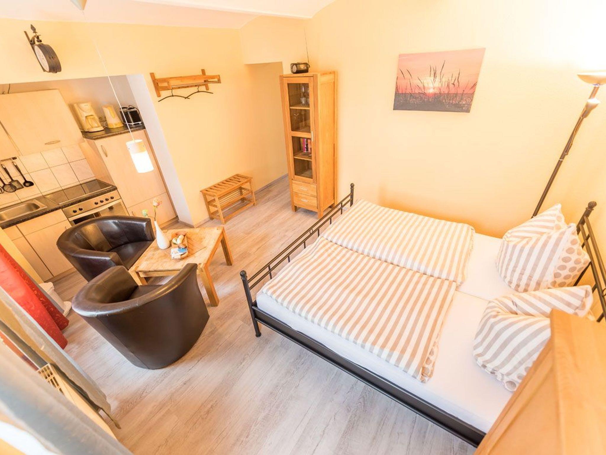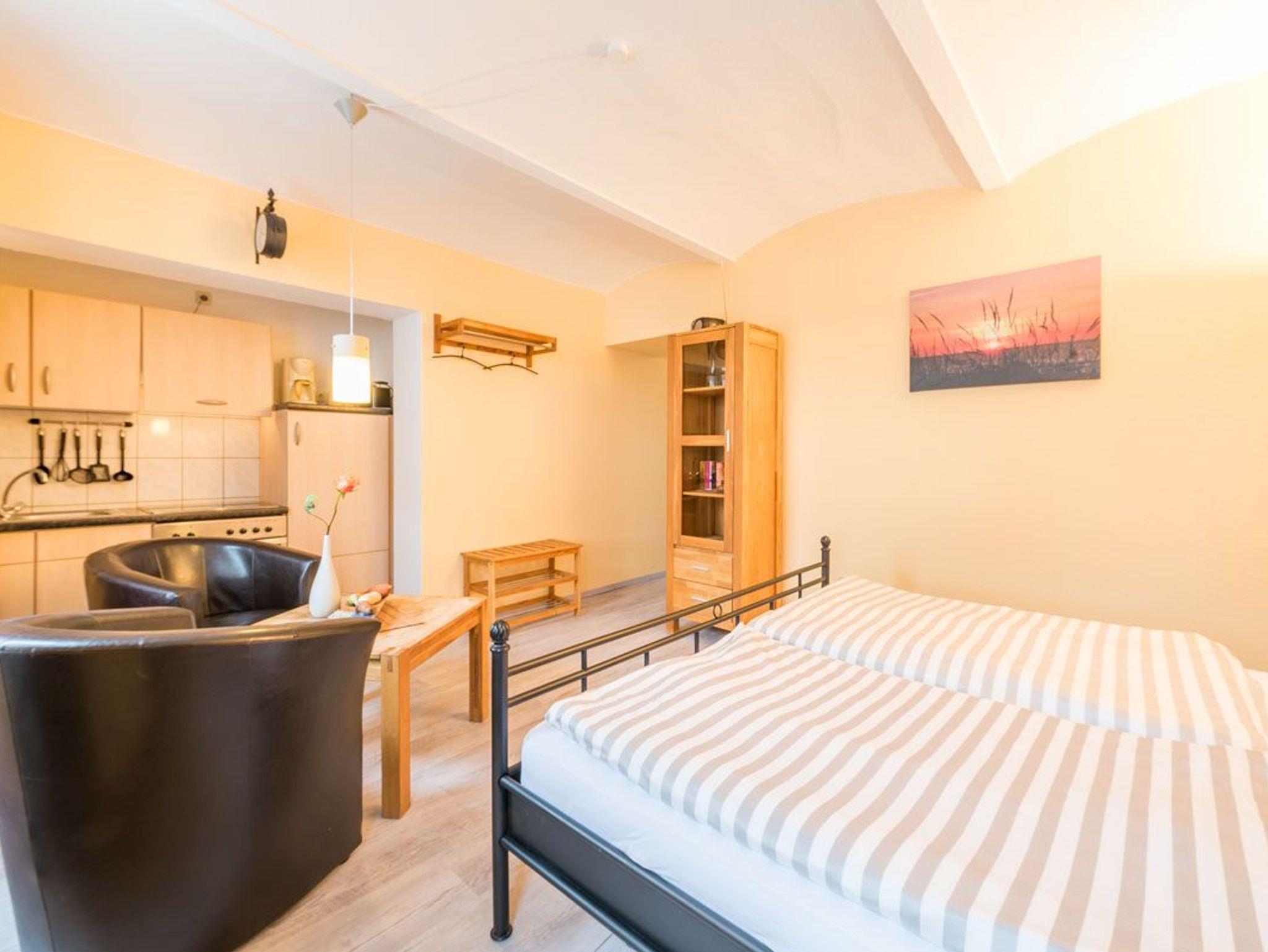 Unser Ferienzimmer III befindet sich im ersten Obergeschoss. Das Ferienzimmer ist ca. 30 qm groß und maritim eingerichtet. Es verfügt über einen kleinen Vorraum mit Esstisch für zwei Personen, ein komfortabel, mediteran eingerichetes Wohn- und Schlafzimmer mit einem zwei Meter breiten Bett und einer kleiner Küchenzeile sowie ein sehr schönes, größeres Bad mit Badewanne, WC und Fön.