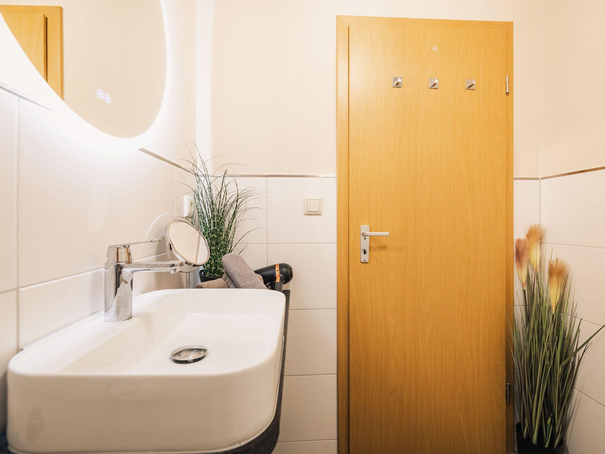 Das Badezimmer ist mit Dusche, WC und Waschbecken ausgestattet.