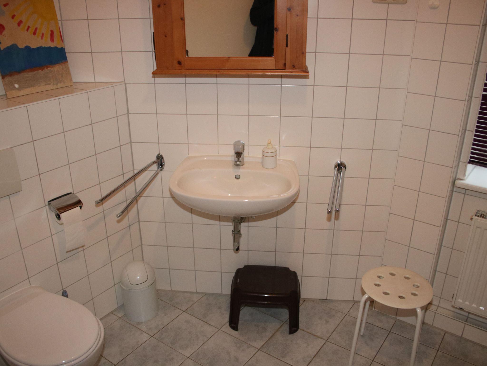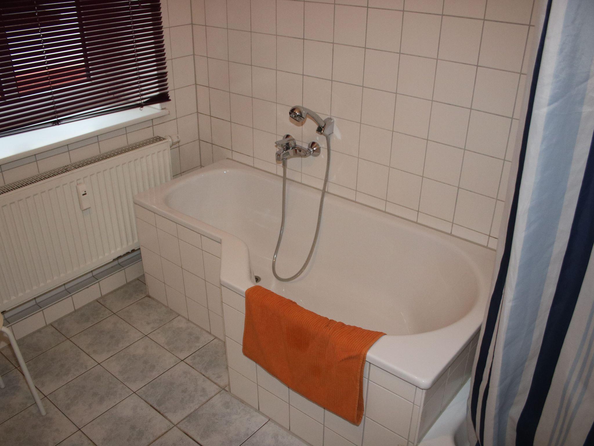 Hinter der Küche befindet sich das Badezimmer mit Badewanne, Duschkabine, WC, Waschbecken und Waschmaschine. Zusätzlich ist eine Gästetoilette vorhanden. Hinter dem Schlafzimmer mit einem Doppelbett befindet sich ein weiteres Schlafzimmer mit einem Bett für eine Person. Durch die große Fensterfront ist dieses Zimmer oft sonnendurchflutet.