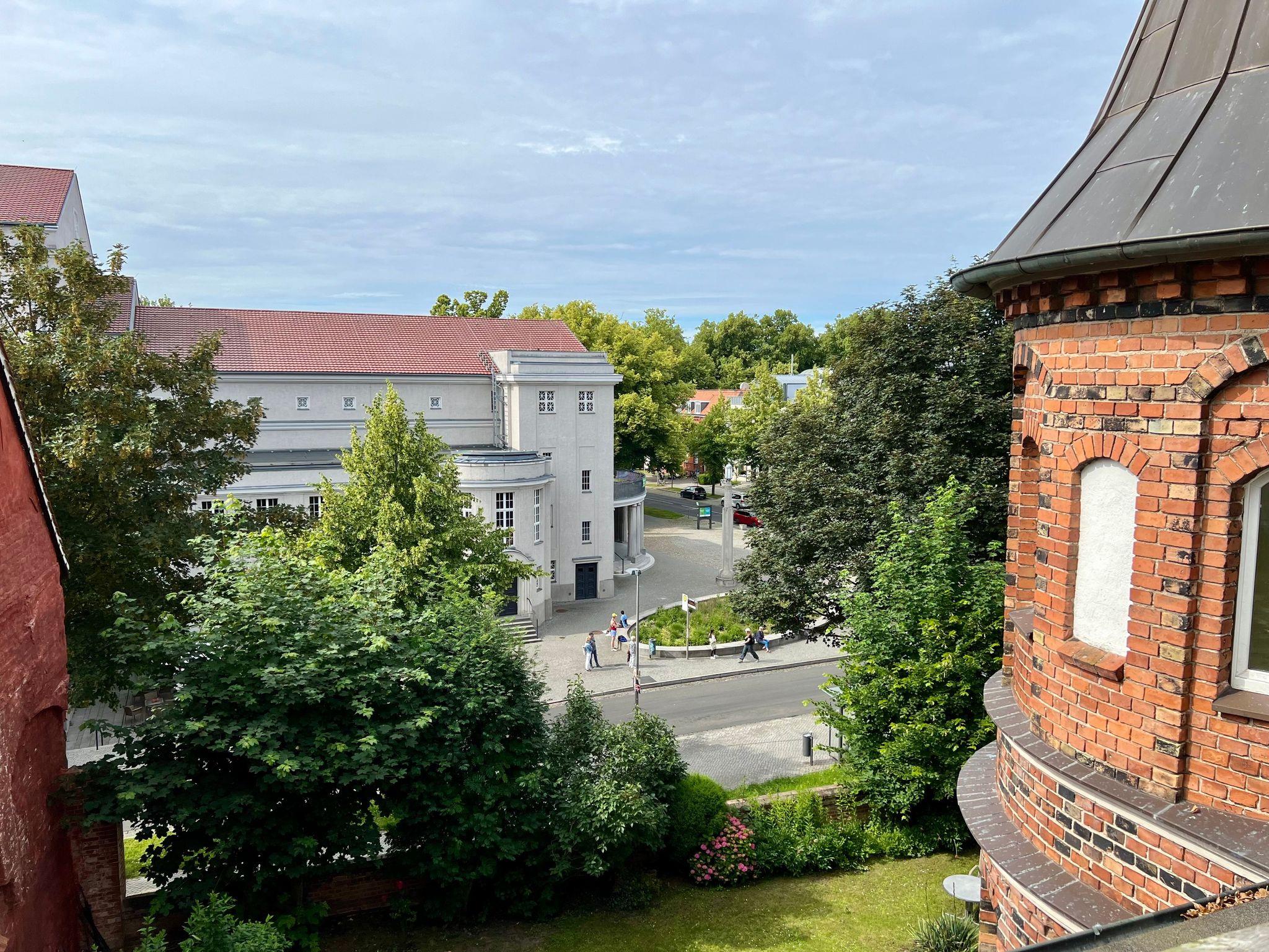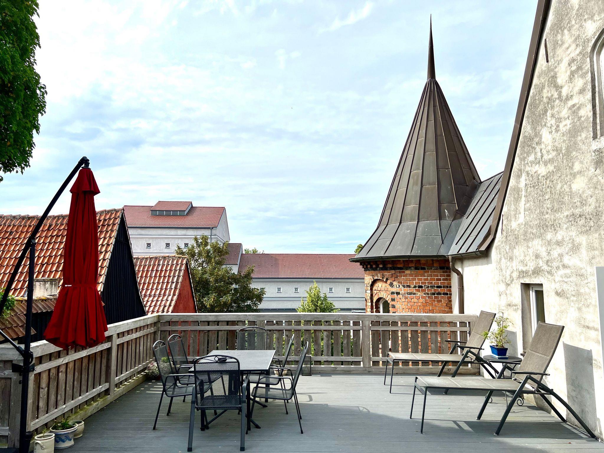 Ebenso steht eine große Gemeinschaftsdachterrasse zur Verfügung. Hier haben Sie einen fantastischen Bilck auf das Stralsunder Theater.