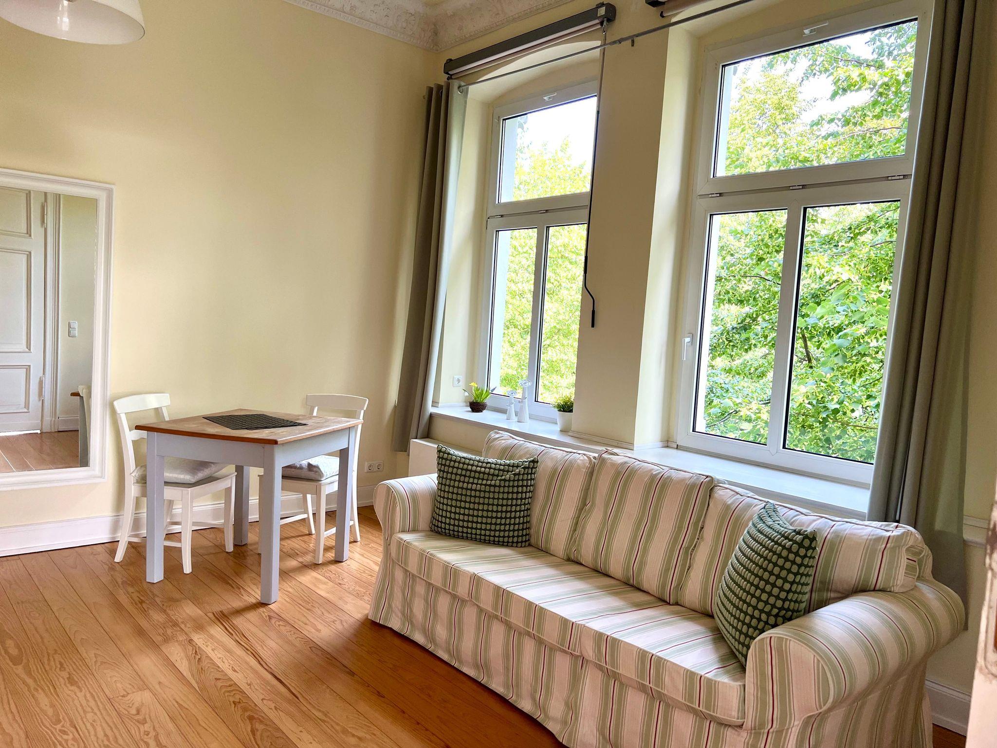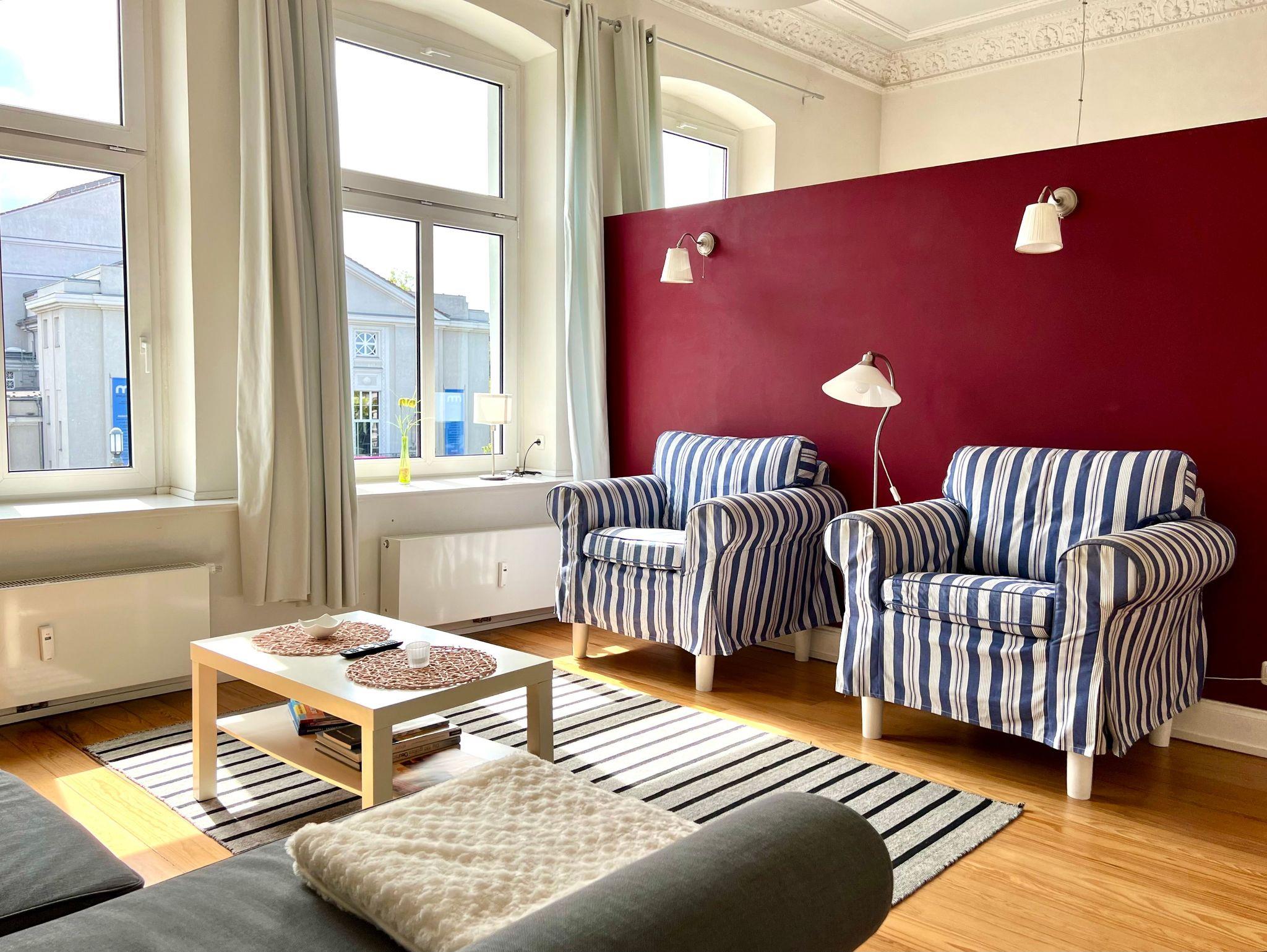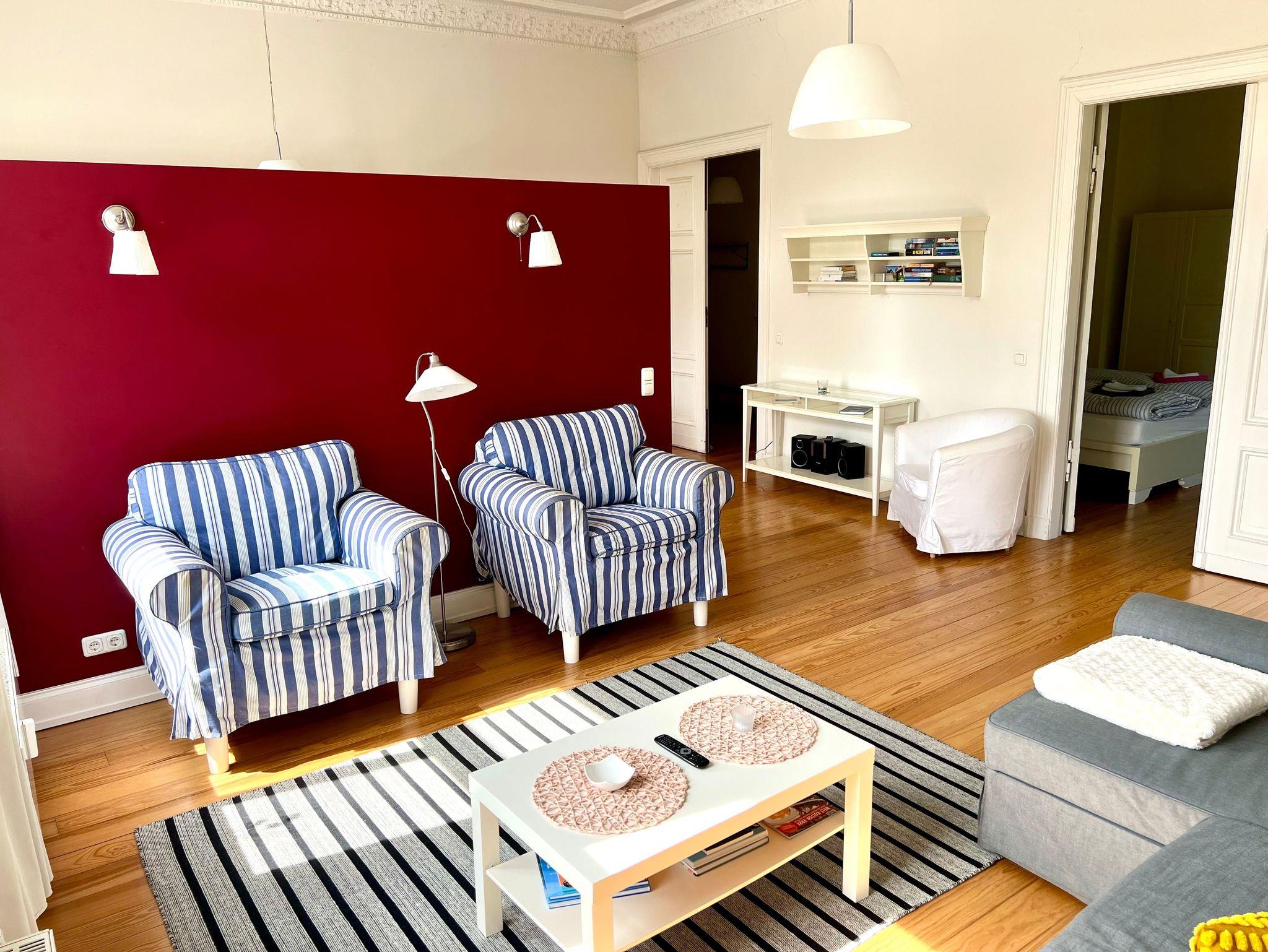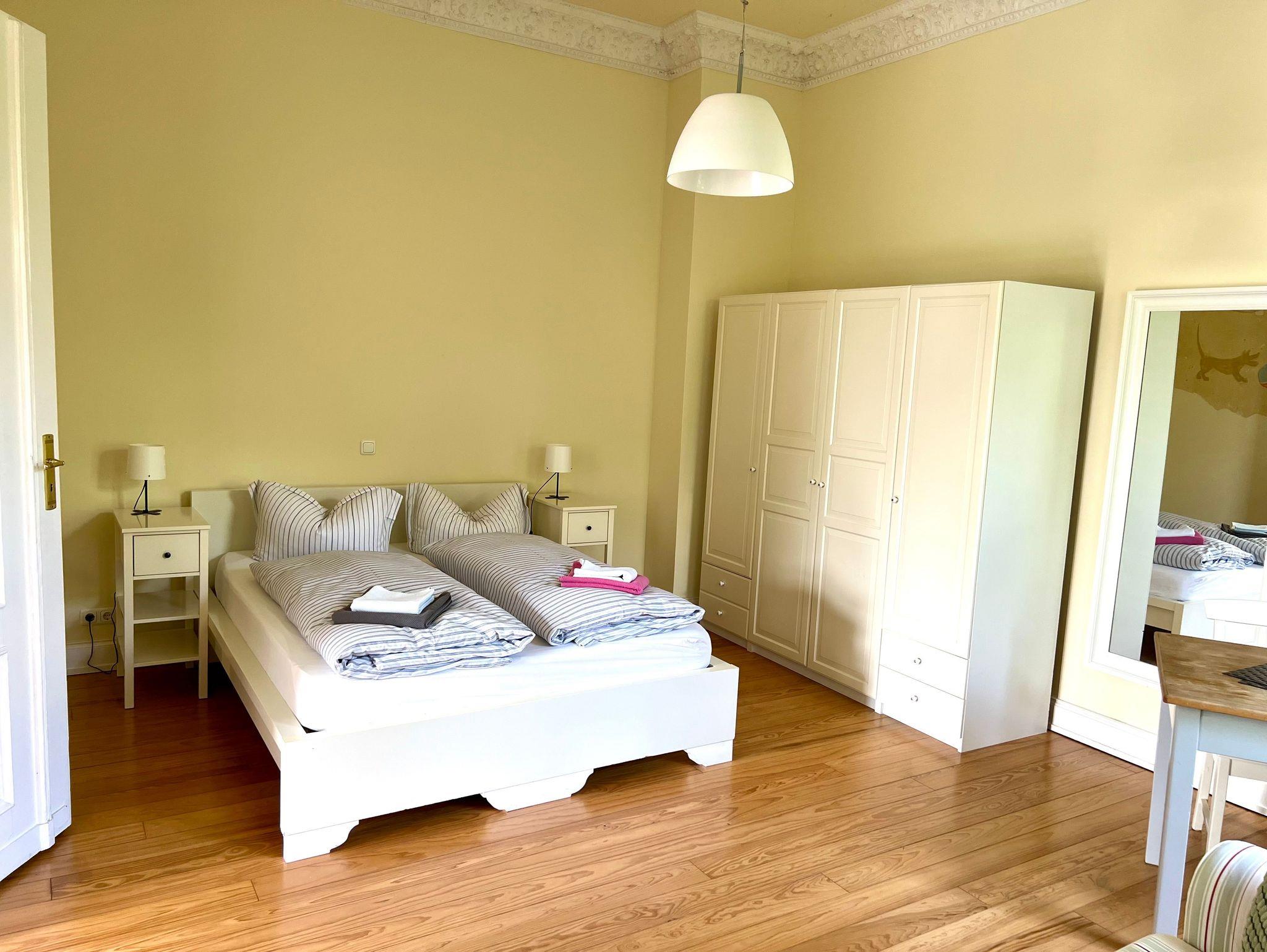 Die Wohnung ist insgesamt 76,84 qm groß und bietet zwei große, helle Wohnräume mit Deckenstuck, eine Küche mit Essplatz, ein Wohnzimmer mit Bettsofa (160 x 200 cm) und Arbeitsplatz, ein Schlafzimmer mit Doppelbett (160 x 200 cm) und Sofa und Dusche/WC mit behindertengerechten Einrichtungen. WLan kostenfrei.