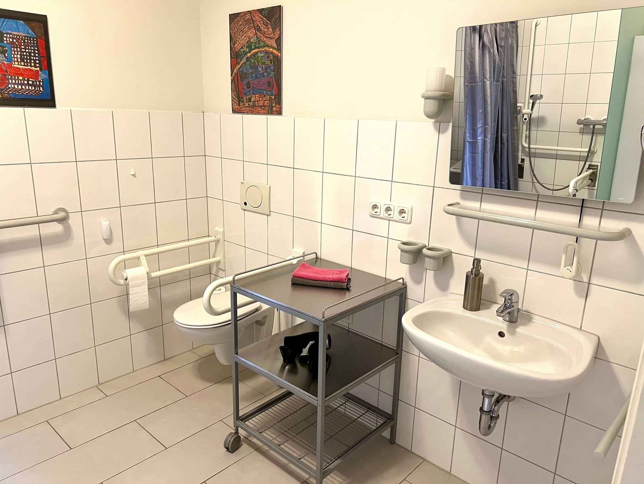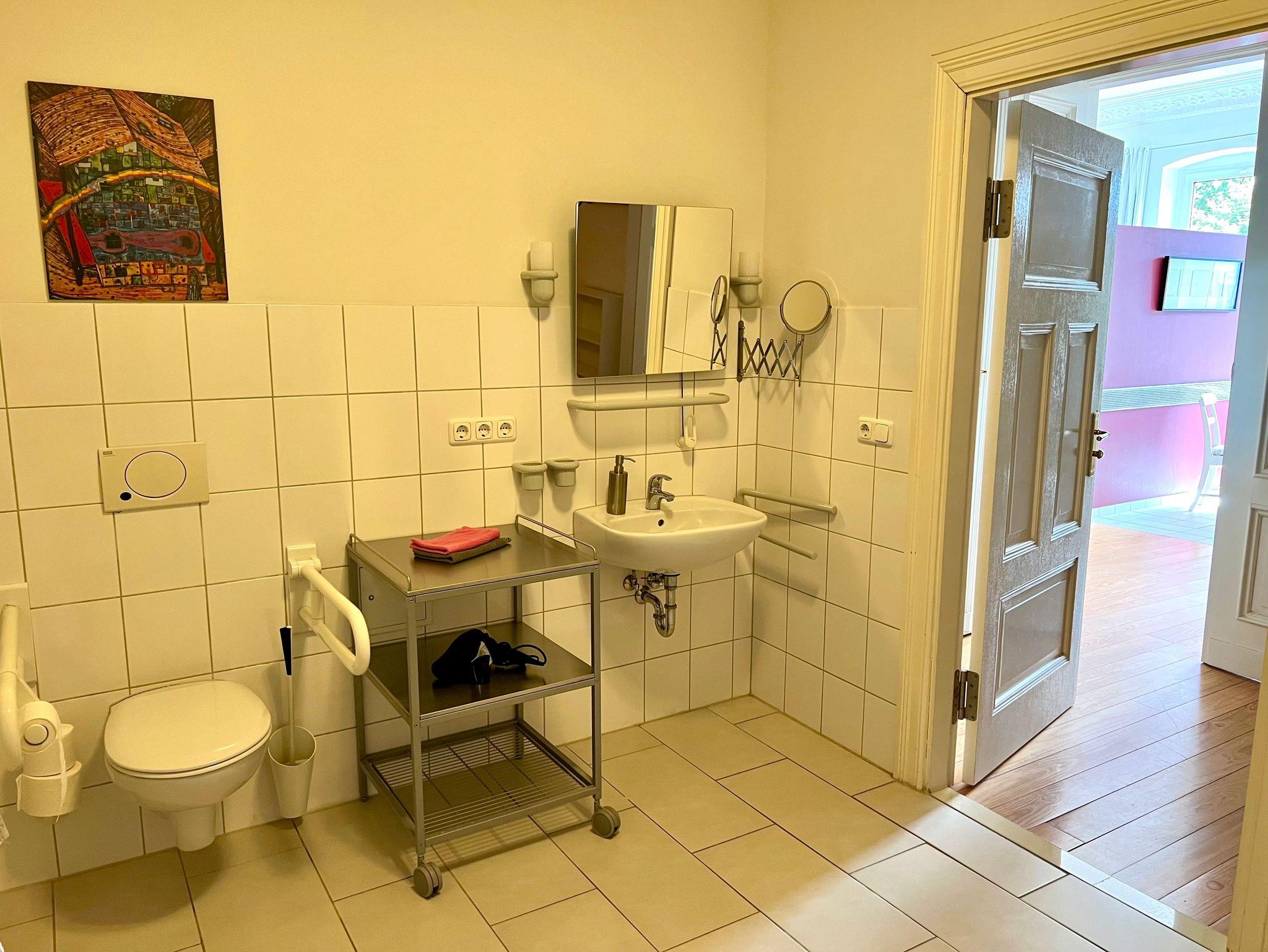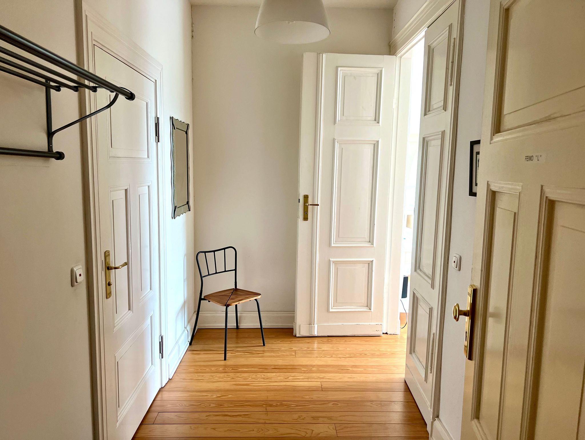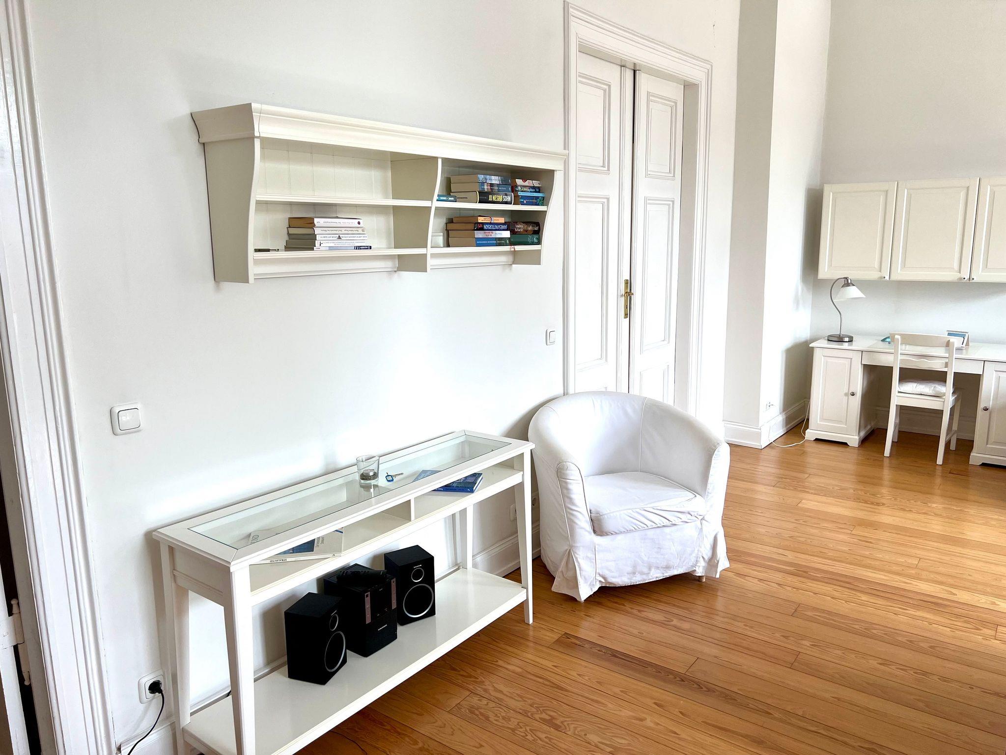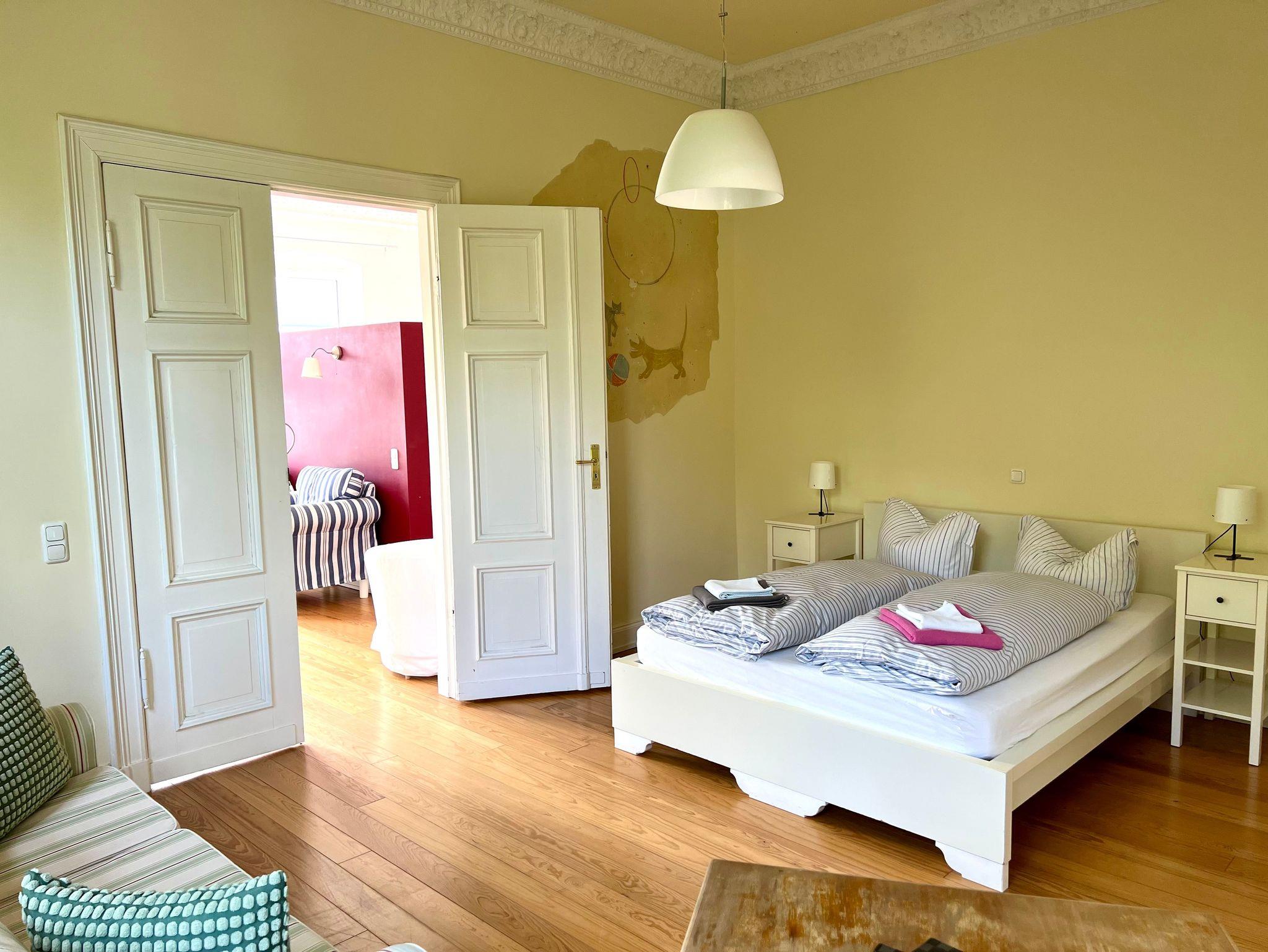 Die Wohnung ist insgesamt 76,84 qm groß und bietet zwei große, helle Wohnräume mit Deckenstuck, eine Küche mit Essplatz, ein Wohnzimmer mit Bettsofa (160 x 200 cm) und Arbeitsplatz, ein Schlafzimmer mit Doppelbett (160 x 200 cm) und Sofa und Dusche/WC mit behindertengerechten Einrichtungen. WLan kostenfrei.