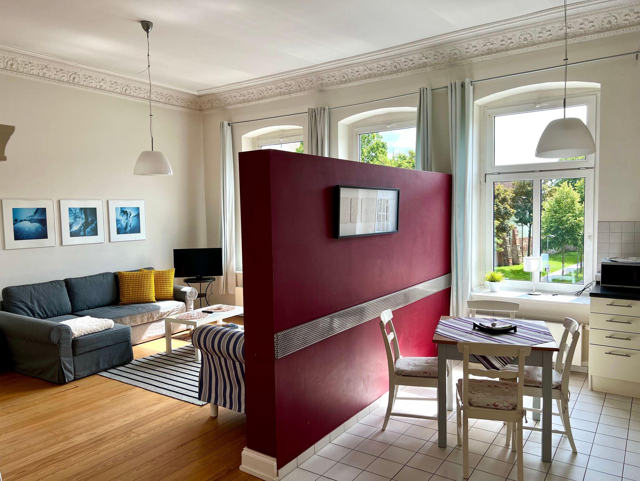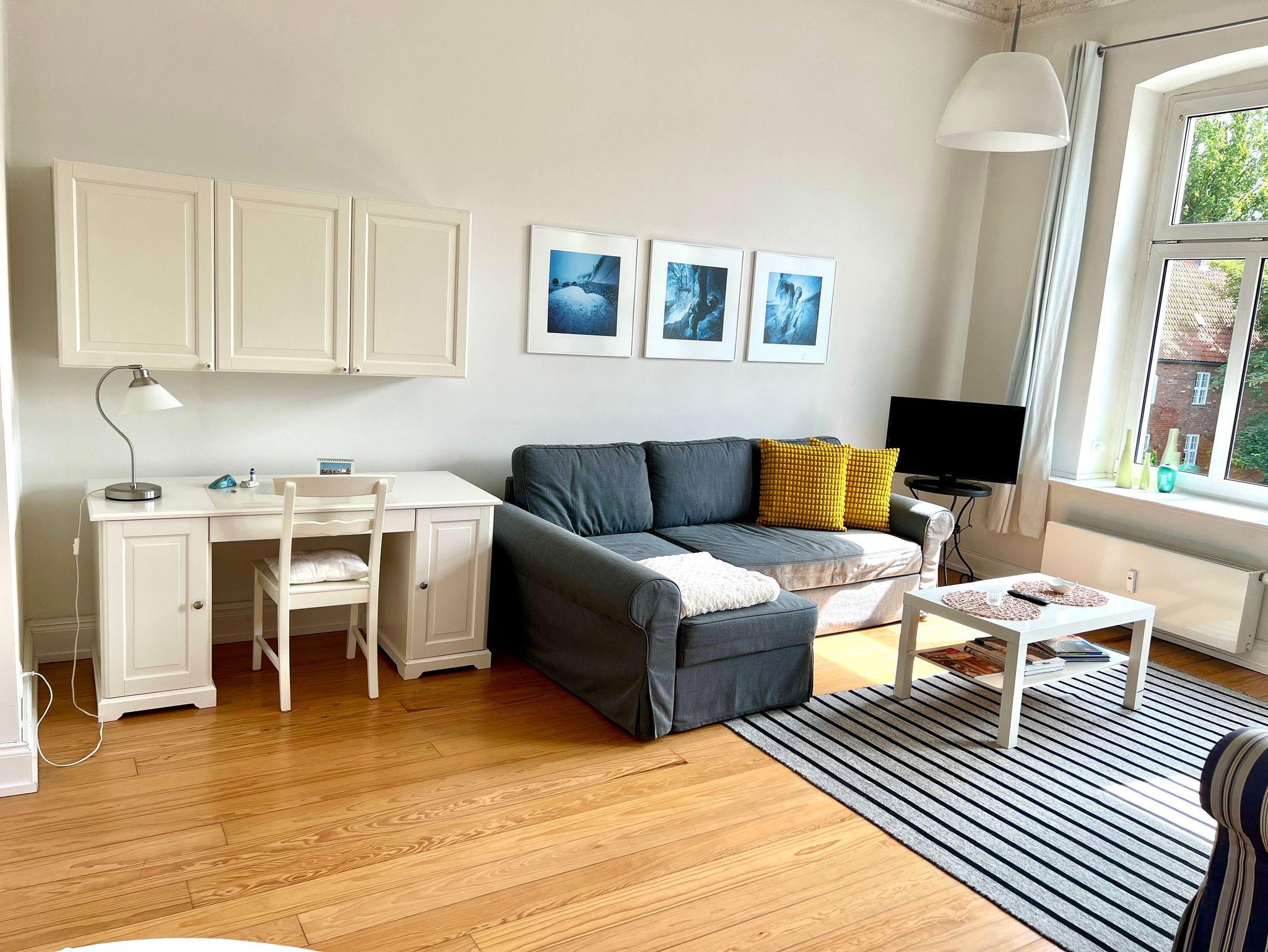 Die Wohnung ist geeignet für zwei bis maximal vier Personen und über einen Lift zu erreichen. Sie bietet einen wunderschönen Blick auf das Stadttheater, das Kniepertor und die Nikolaikirche.