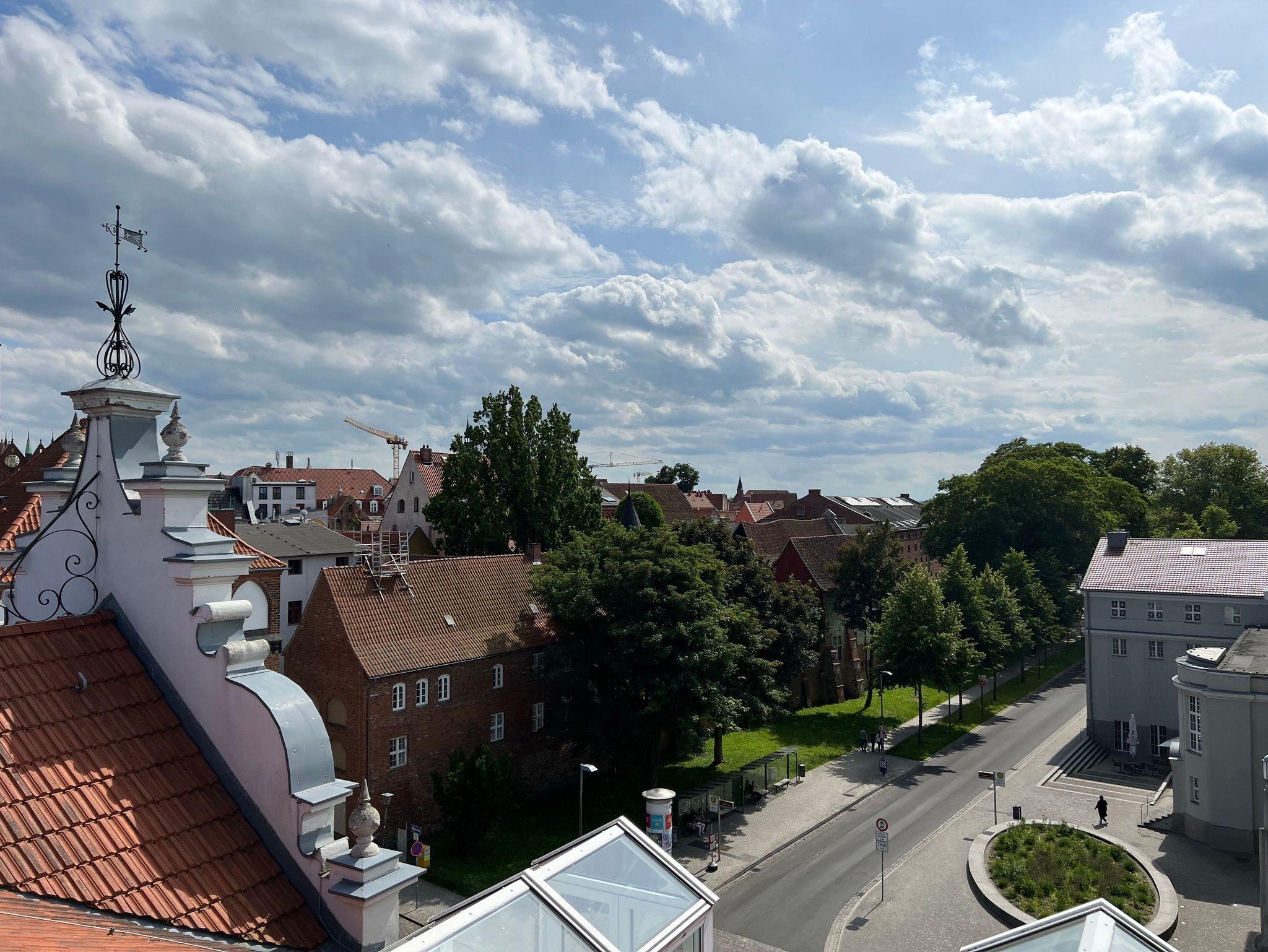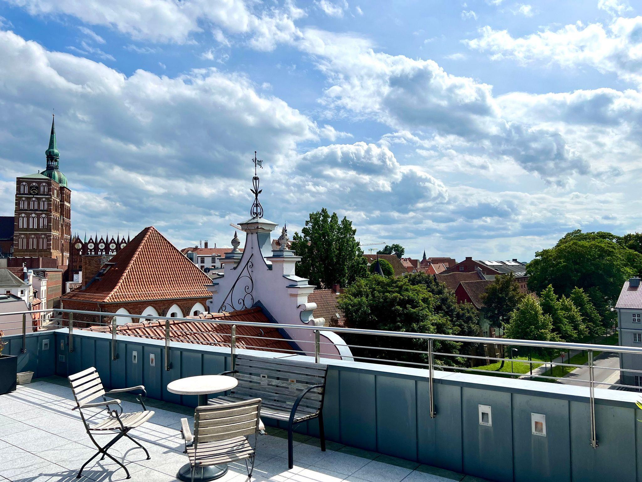 Allen Gästen unseres Hauses steht eine große Gemeinschaftsdachterrasse zur Verfügung. Hier haben Sie einen fantastischen Bilck auf das Stralsunder Theater, die Stadtmauer, die Altstadt und den Hafen.