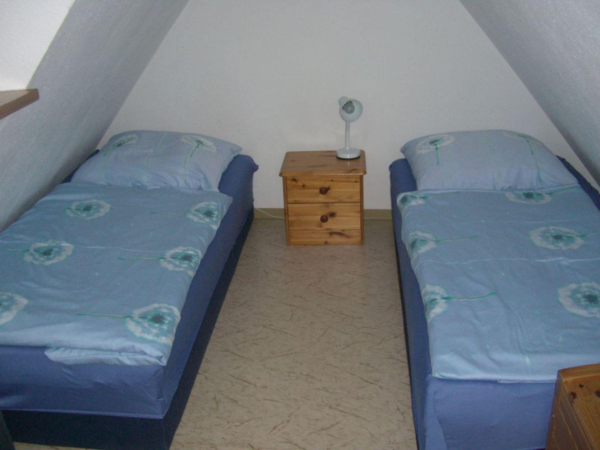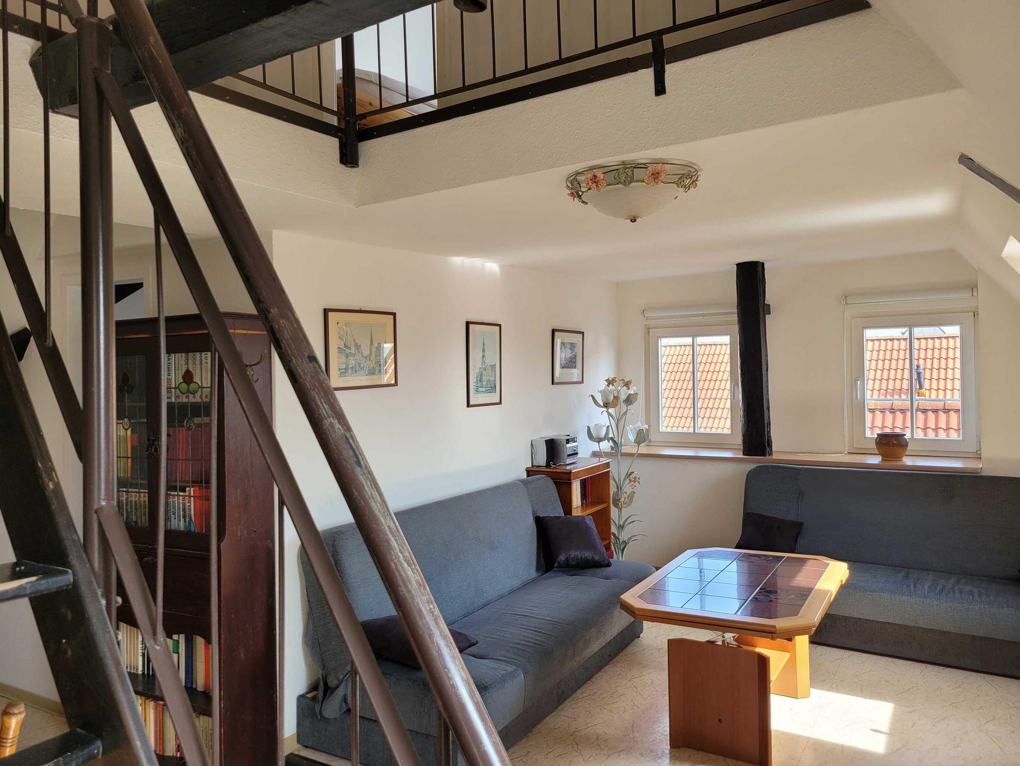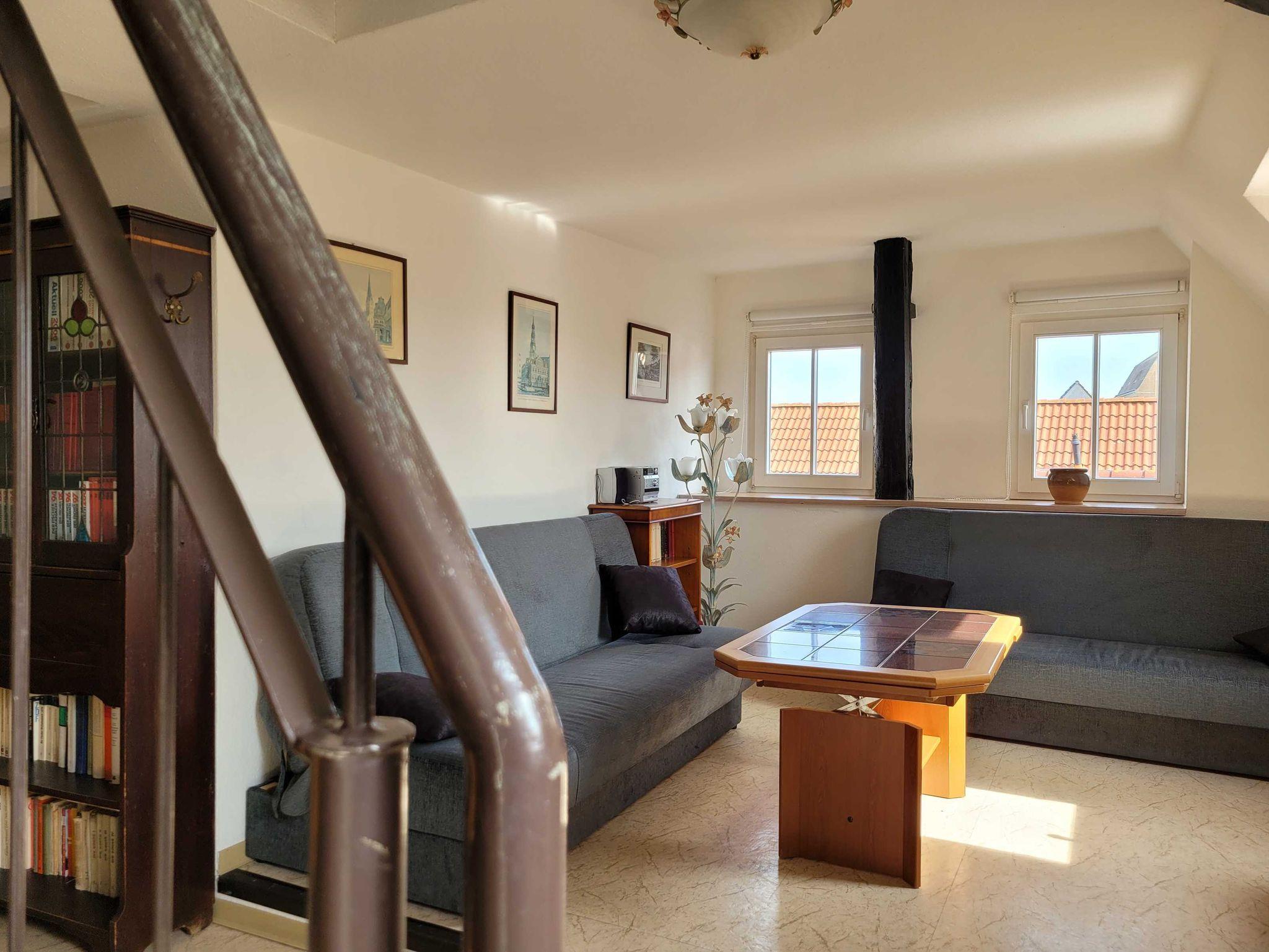 Die Ferienwohnung 2 befindet sich im 3. OG (Dachgeschoss) in der Langenstraße 33 in einem circa 150 Jahre alten denkmalgeschützten Haus. Sie verfügt über drei Schlafzimmer mit je zwei Einzelbetten, Wohnzimmer, Küche und Bad. Die Küche ist komplett ausgestattet.