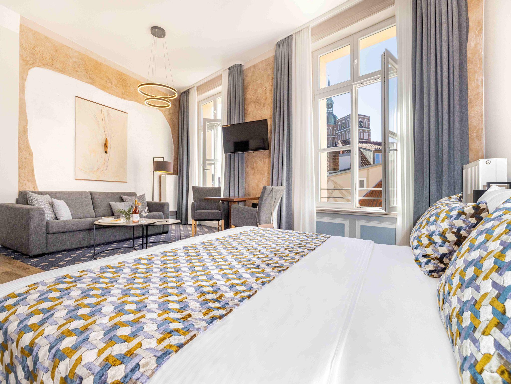Mitten im Herzen der UNESCO-Altstadt Stralsunds liegt unser Apartmenthaus aus dem 18. Jahrhundert. Tauchen Sie ein in die schwedische Epoche von Stralsund: stuckverzierte Decken, große Fenster und historische Fußböden, kombiniert mit modernem Wohnkomfort. Erleben Sie den besonderen Charme unserer sechzehn liebevoll gestalteten Apartments.