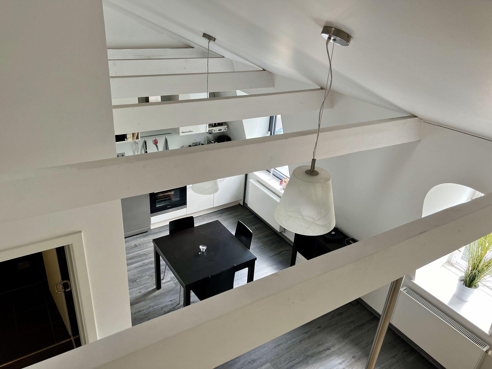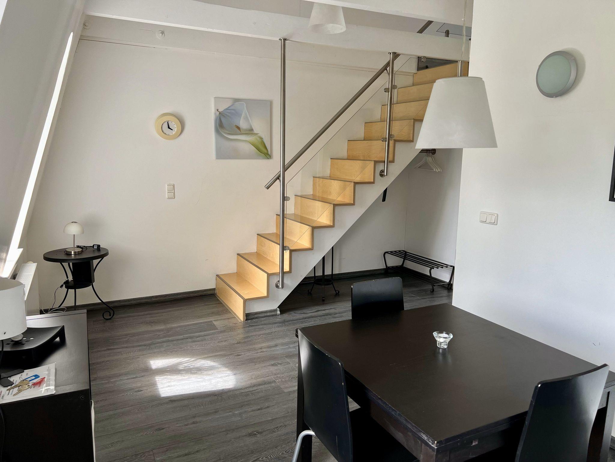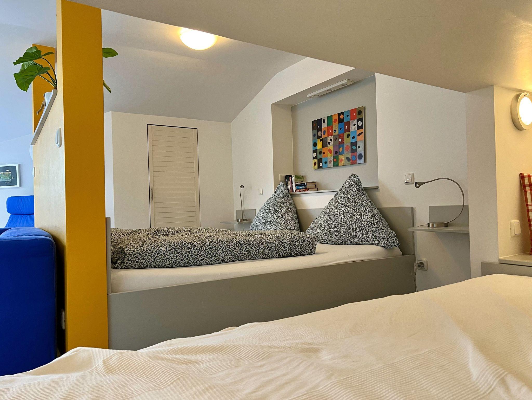 Die Maisonette-Wohnung ist 61 qm gross und bietet loftartig auf zwei Ebenen alles, was das Herz begehrt. Die Wohnung befindet sich im 2. Obergeschoss und ist über einen Fahrstuhl erreichbar. Im Eingangsbereich befinden sich die Küche und der Essraum sowie das Bad mit Du/WC. Im oberen Bereich liegt der kombinierte Wohn-/Schlafraum mit einem Doppelbett (200 x 200 cm) und zusätzlichem Alkovenbett, mit begehbarem Schrankraum sowie einem Sofa und Lehnstühlen zum Wohlfühlen. W-LAN kostenfrei.