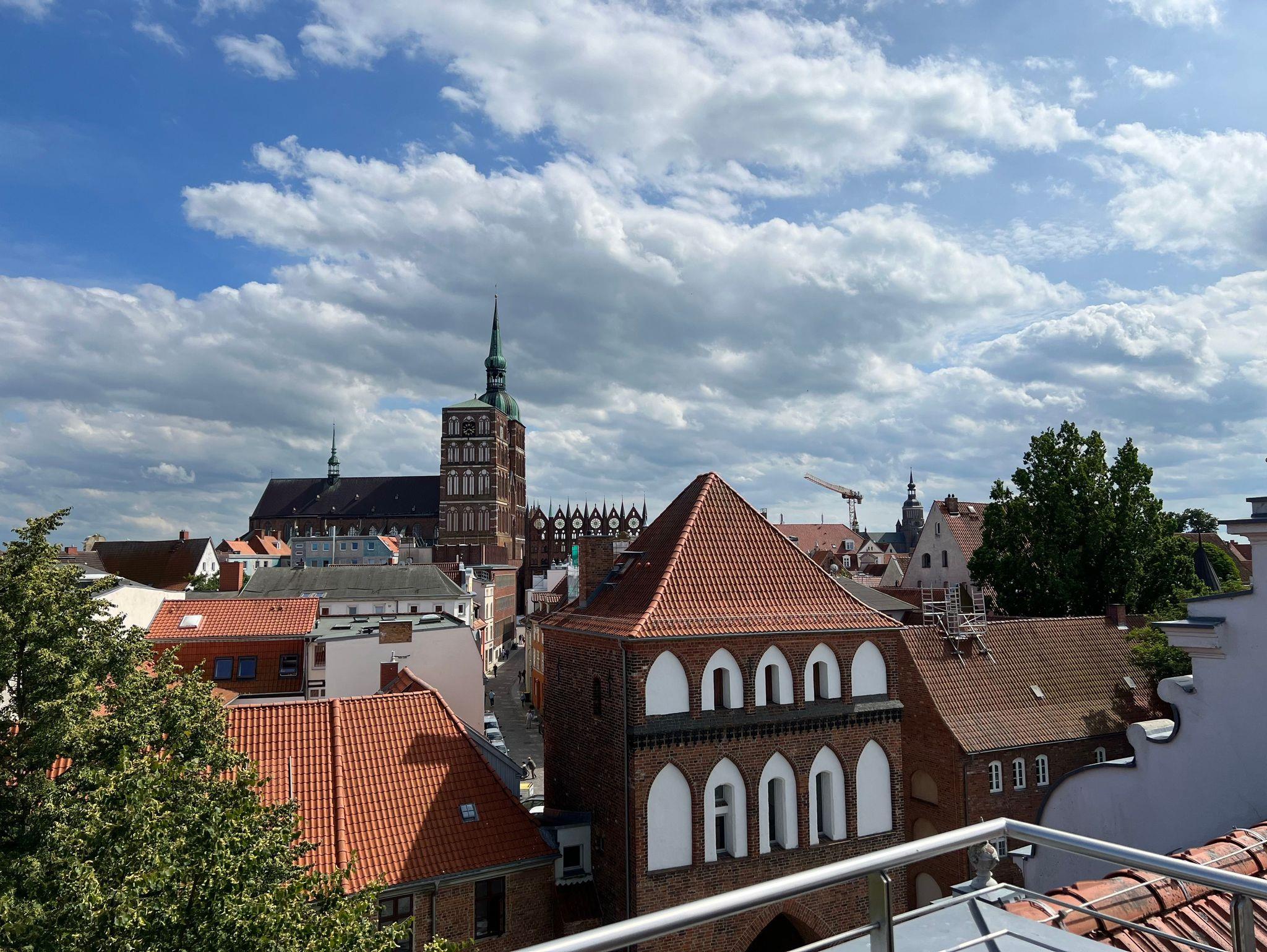 Den Gästen vom Haus 2 steht unsere große Gemeinschaftsdachterrasse im Haus 1 zur Verfügung. Hier haben Sie einen fantastischen Bilck auf das Stralsunder Theater, die Stadtmauer, die Altstadt und den Hafen.