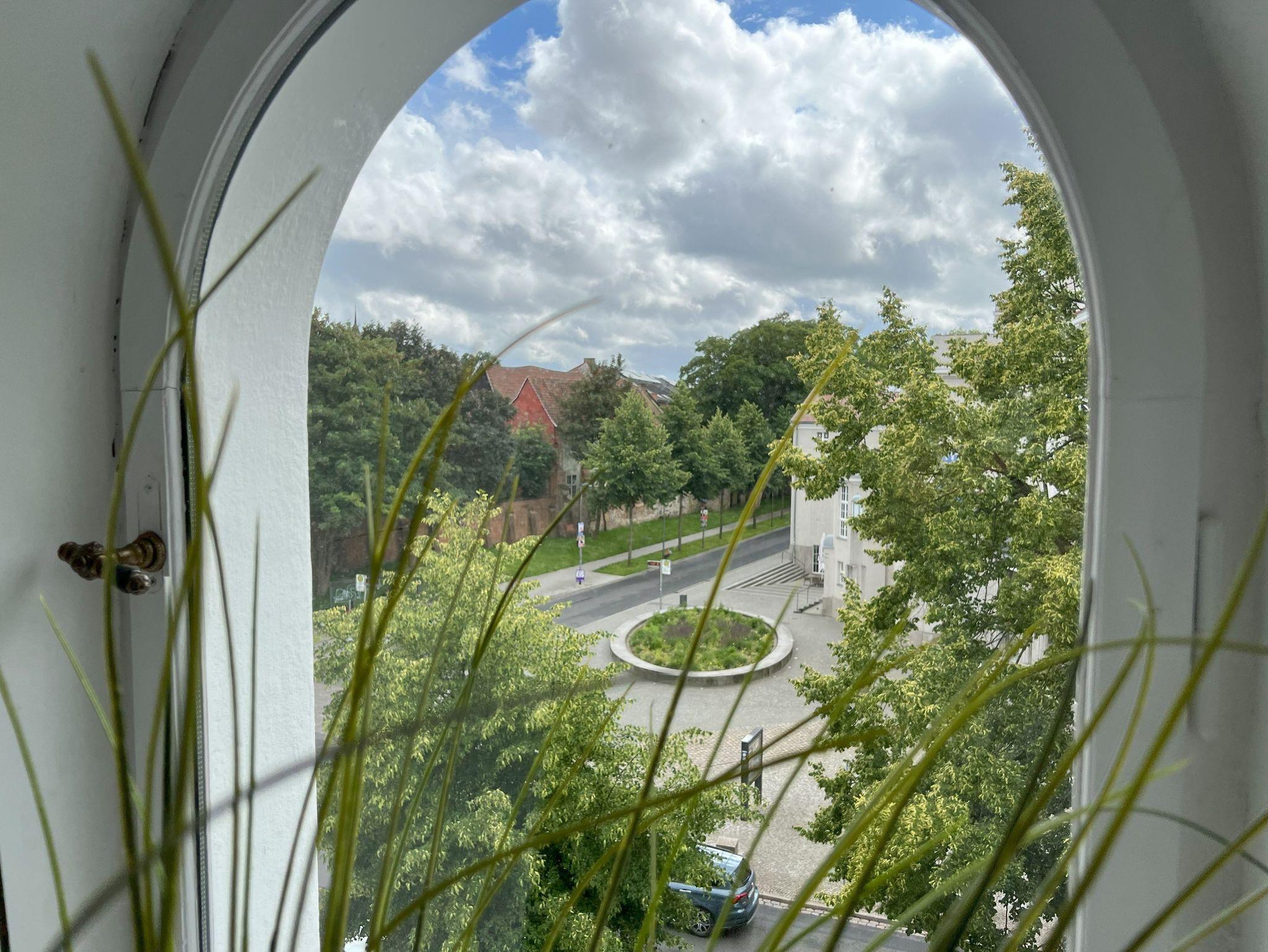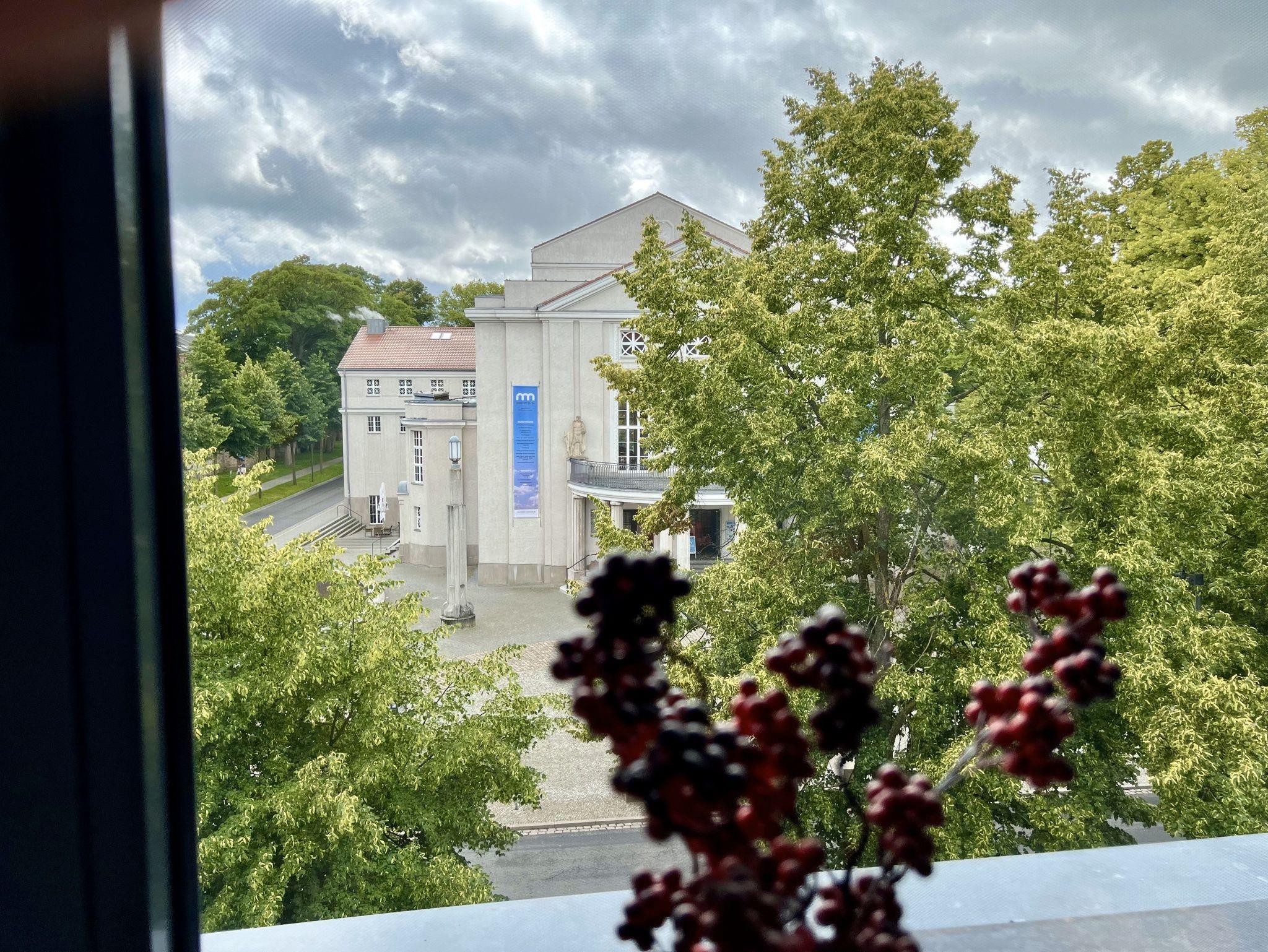 Haus Palme 1 und 2 bilden am Olof-Palme-Platz ein unverkennbares Ensemble. Die markanten Jugendstil-Häuser liegen auf der Altstadtinsel und am Strelasund, umgeben vom frisch renovierten Theater, vom Kniepertor und von der mittelalterlichen Stadtmauer.