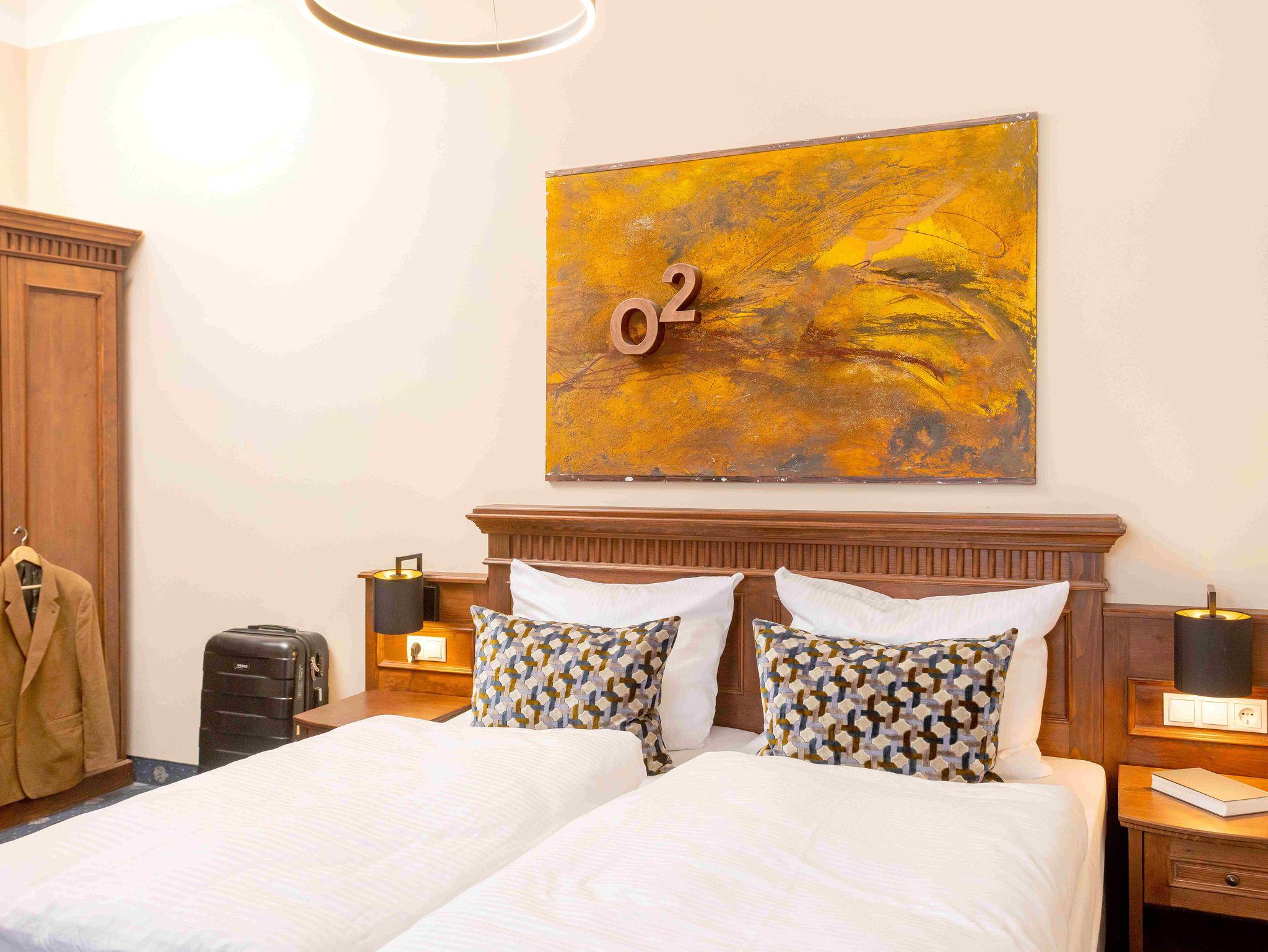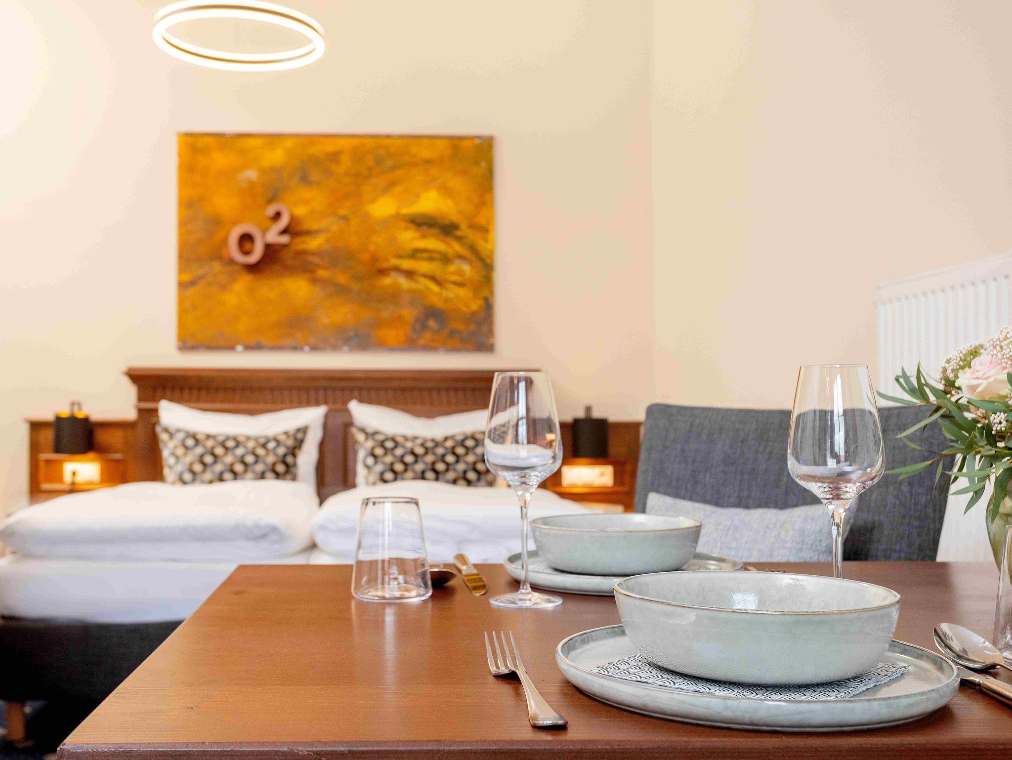 Unsere modernen 1-Raum-Apartments Superior befinden sich im 1. und 2. Obergeschoss mit Blick zum Innenhof. Sie verfügen über einen kleinen Balkon. Zur Ausstattung gehören ein komfortables Boxspringbett, einen Esstisch und eine Sitzecke mit Schlafsofa und Tisch, eine praktische Küchenzeile und ein Badezimmer mit Dusche und WC.