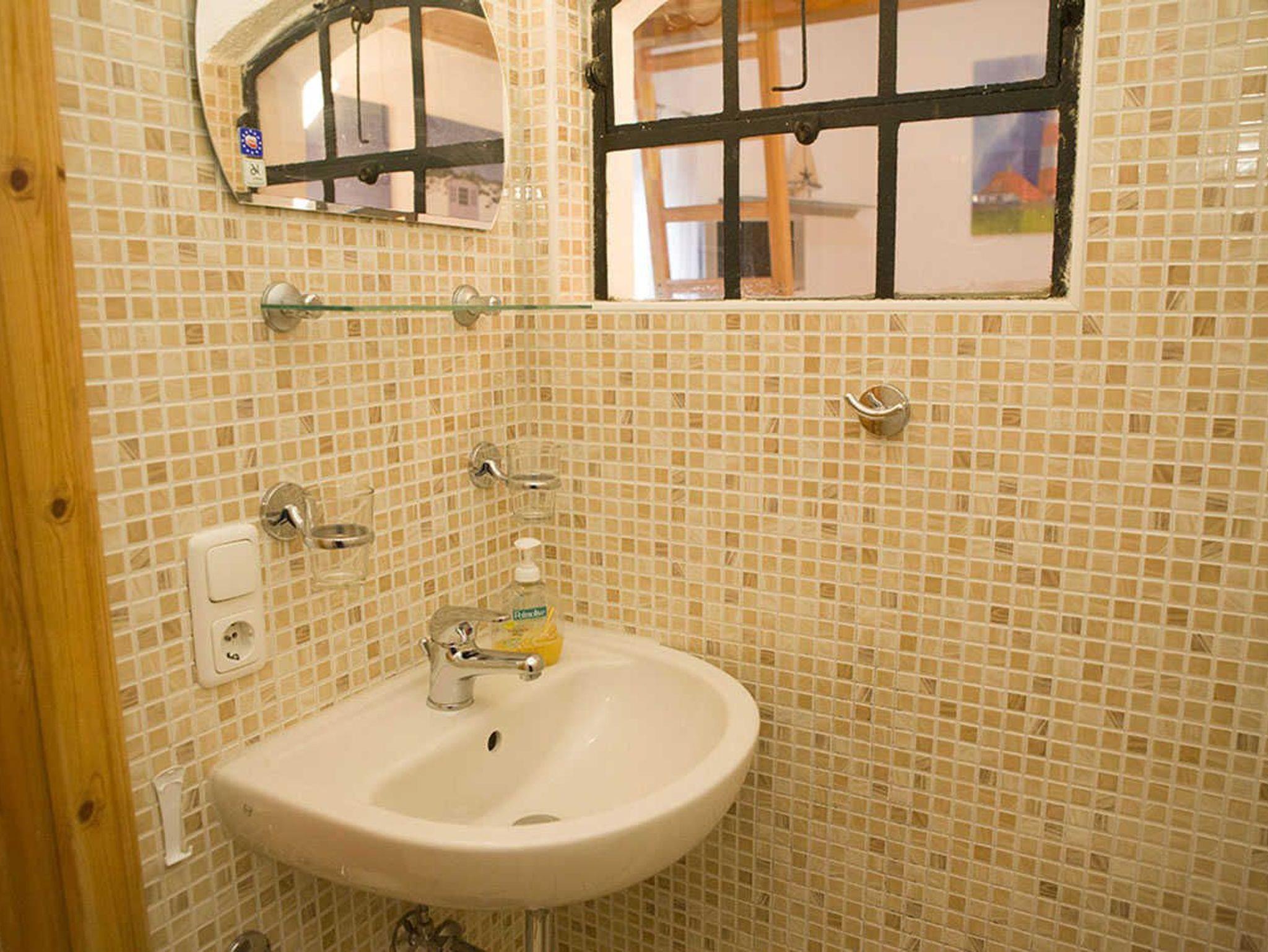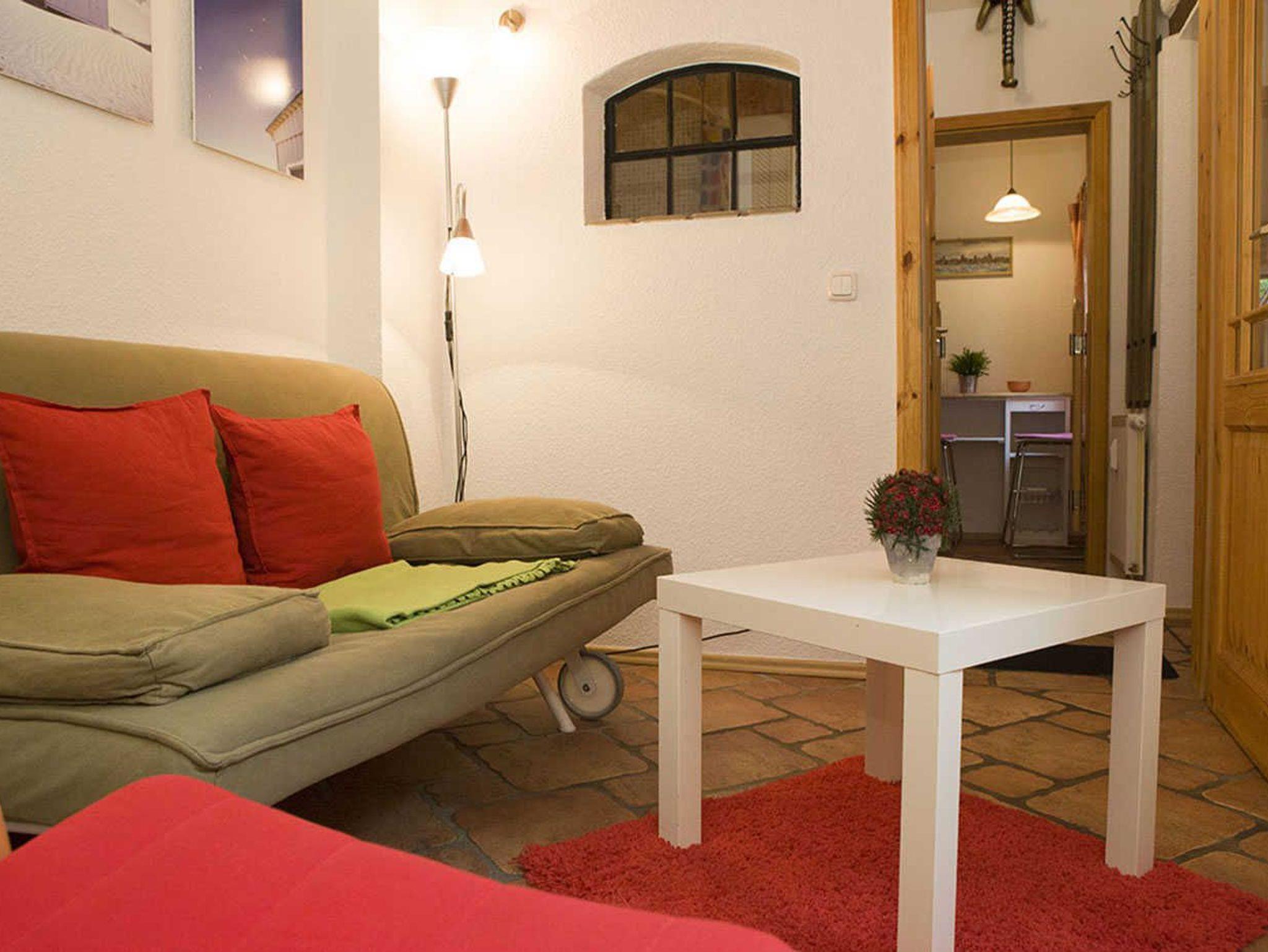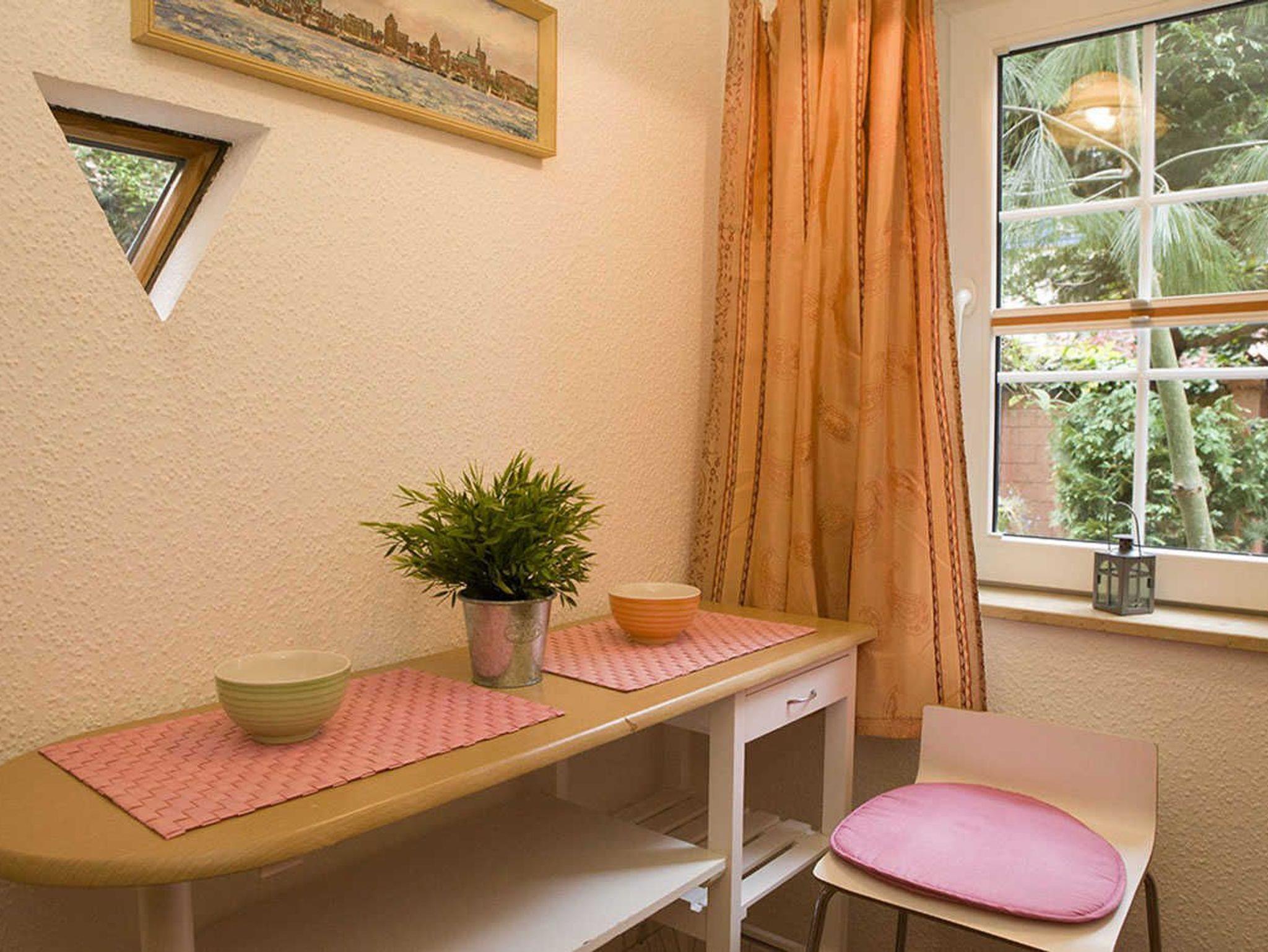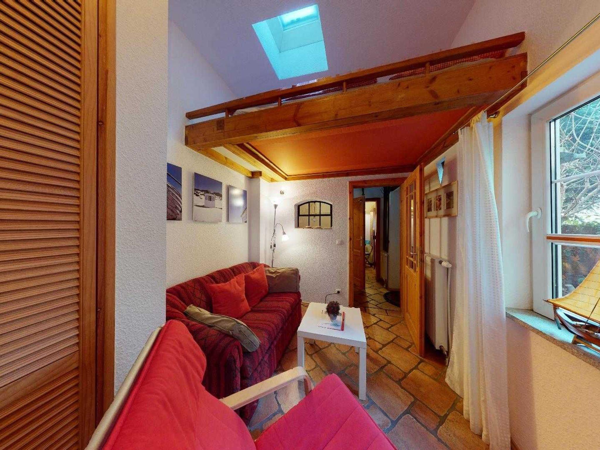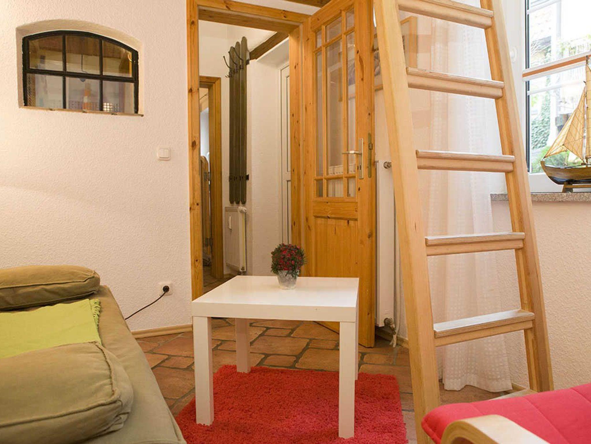 Es verfügt über einen kombinierten Wohn-/Schlafraum mit Hochbett, einer ausziehbaren Couch und eine kleine Sitzgelegenheit im Innenhof. Von dort sind es nur wenige Gehminuten zum Hafen und in die Altstadt von Stralsund.
