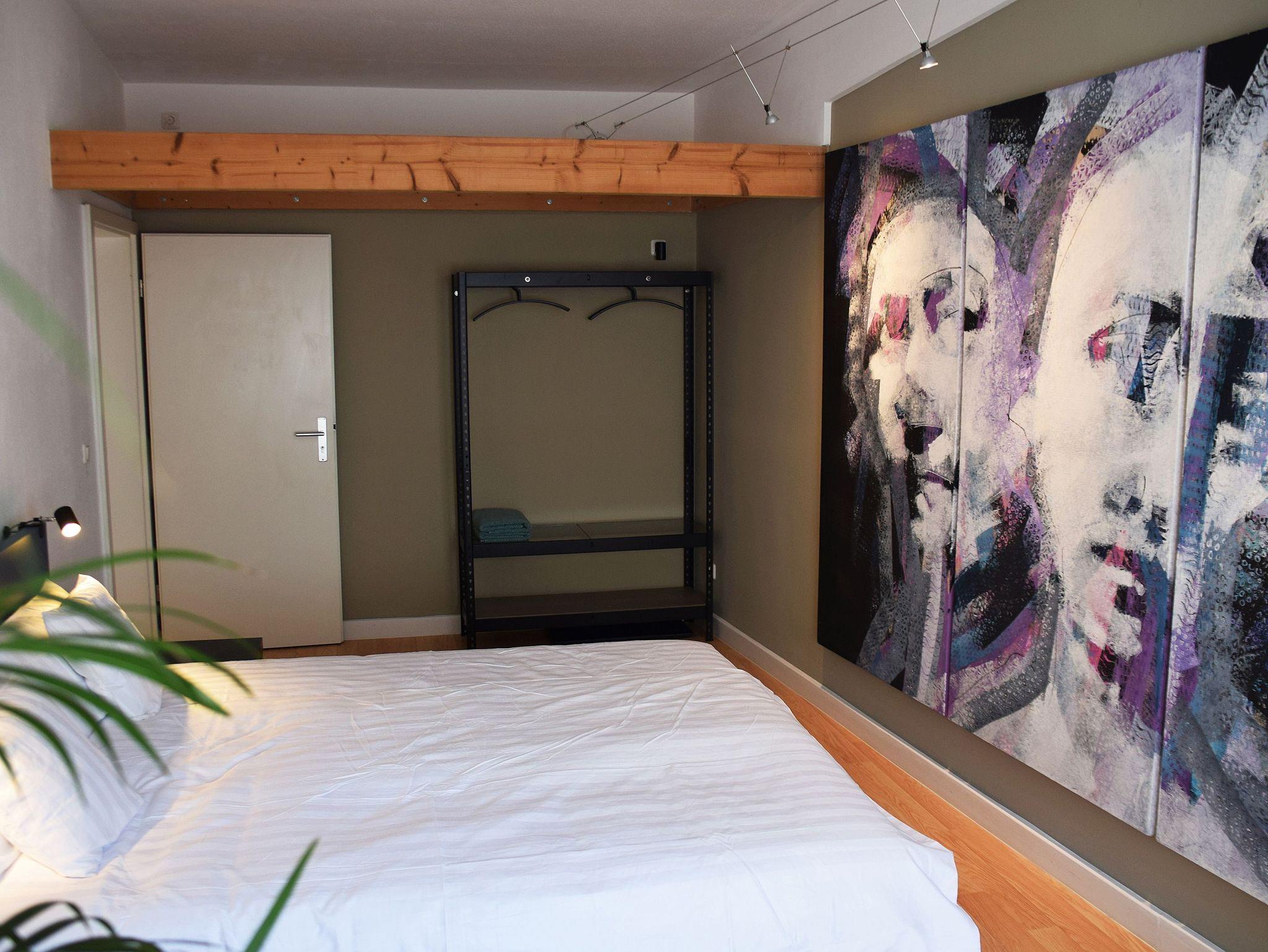 Das Zimmer 2 befindet sich in der 2. Etage. Es ist mit einem Doppelbett (1,60 Meter Breite), einem Smart-TV, einer Sitzgelegenheit und einem Kleiderständer ausgestattet.