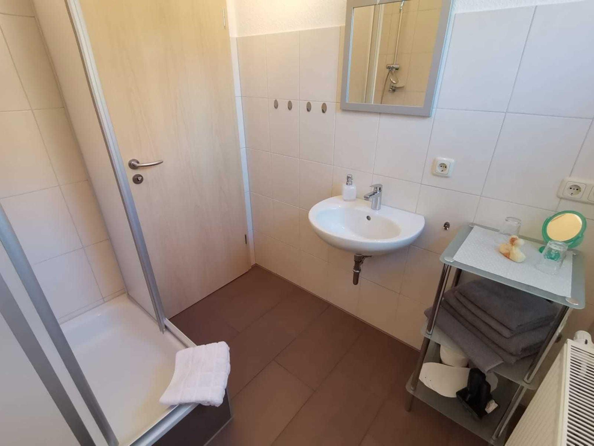 Die geflieste Küche ist mit einem Geschirrspüler, Mikrowelle, Herd mit Ceranplatten, Kühlschrank mit Gefrierteil, Kaffeemaschine und Wasserkocher bestückt. Ferner werden Spülmittel und Geschirrtücher zur Verfügung gestellt. Das Bad mit Dusche (Duscheinstieg) und WC hat Tageslicht vorzuweisen.