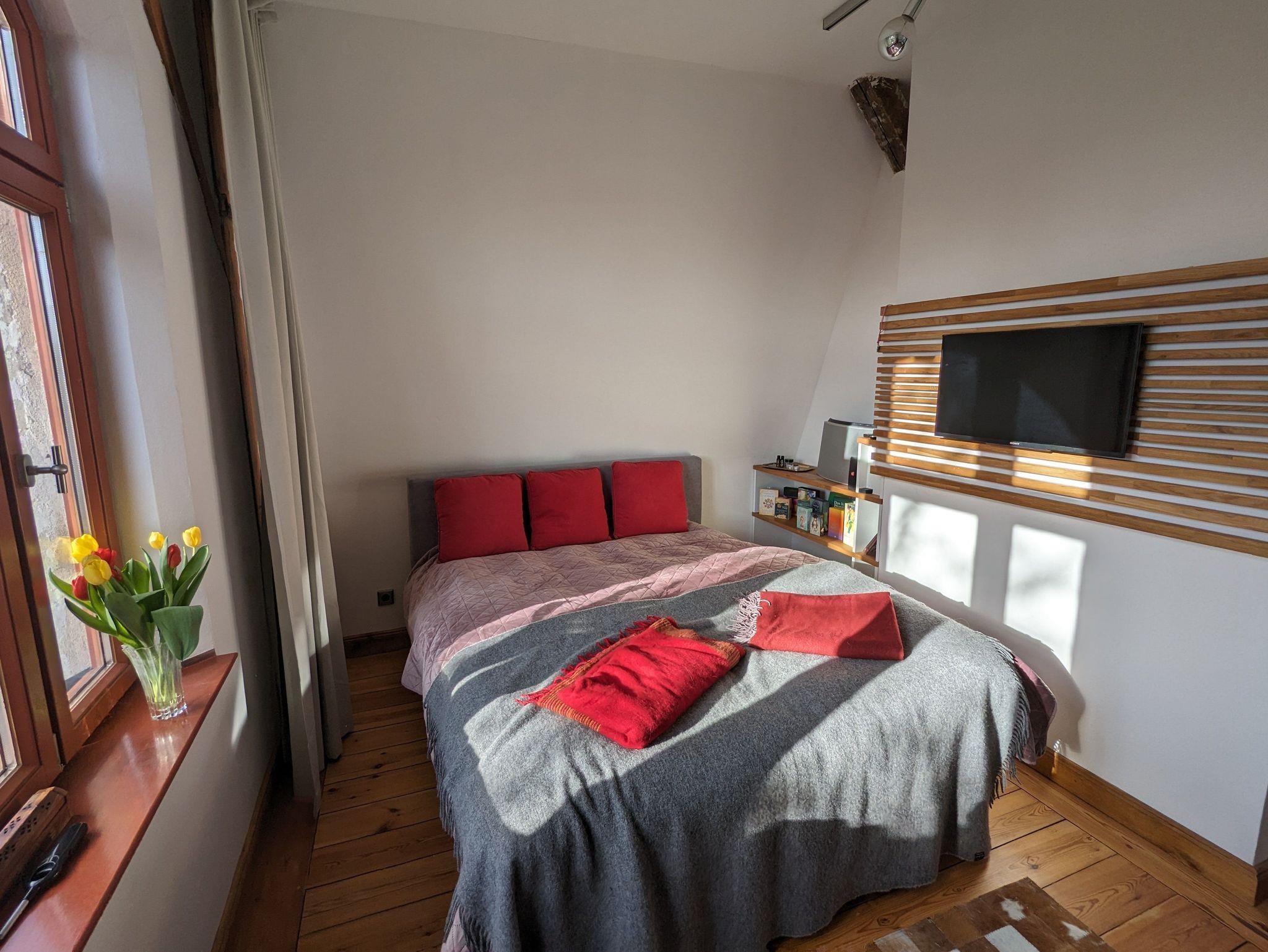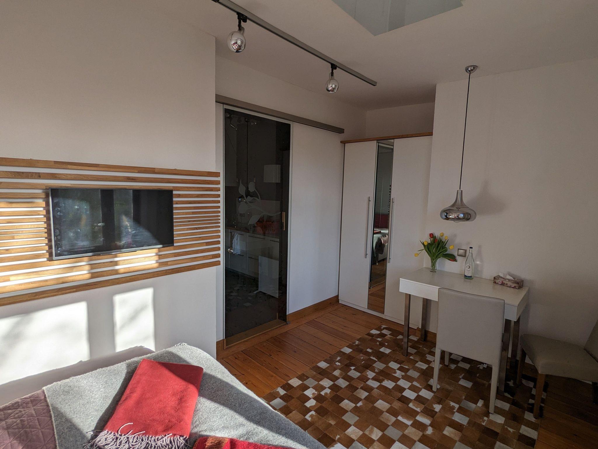 Unsere ruhige, ca. 30 qm große, liebevoll und modern eingerichtete Ferienwohnung, befindet sich im 2. OG einer Gründerzeit Villa imit Blick in den Garten. Sie besteht aus 1 Schlaf-/Wohnraum, einer voll ausgestatteten Küche (u.a. Senseo-Kapselkaffeemaschnie) und einem Badezimmer mit Dusche und WC (Toilettenpapier und Seife in Erstausstattung vorhanden) .