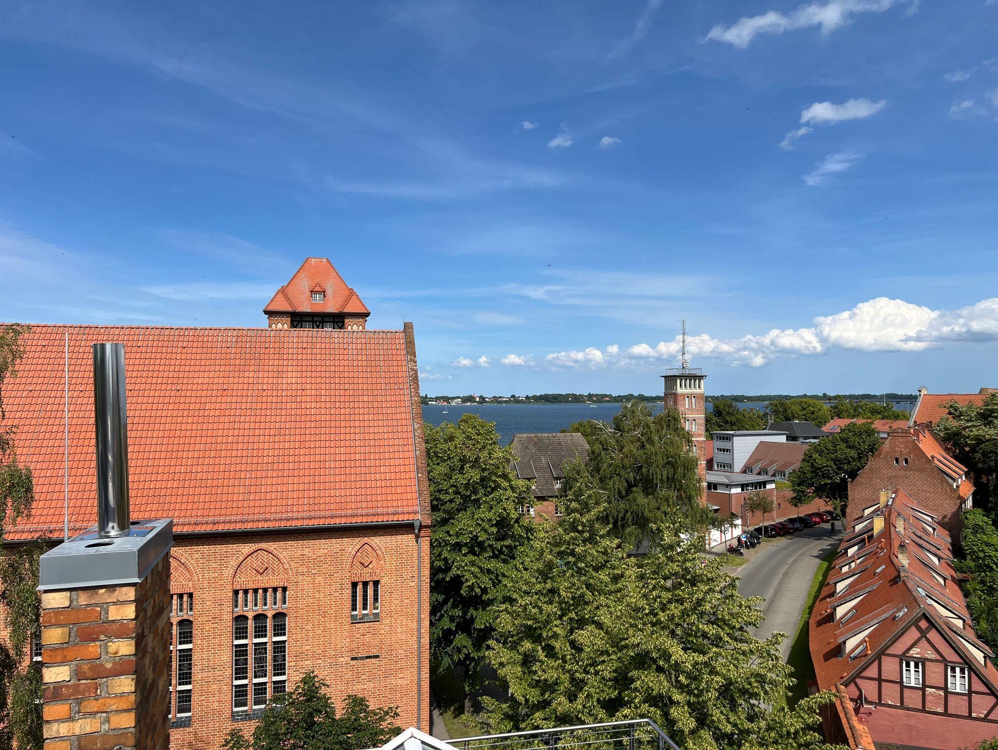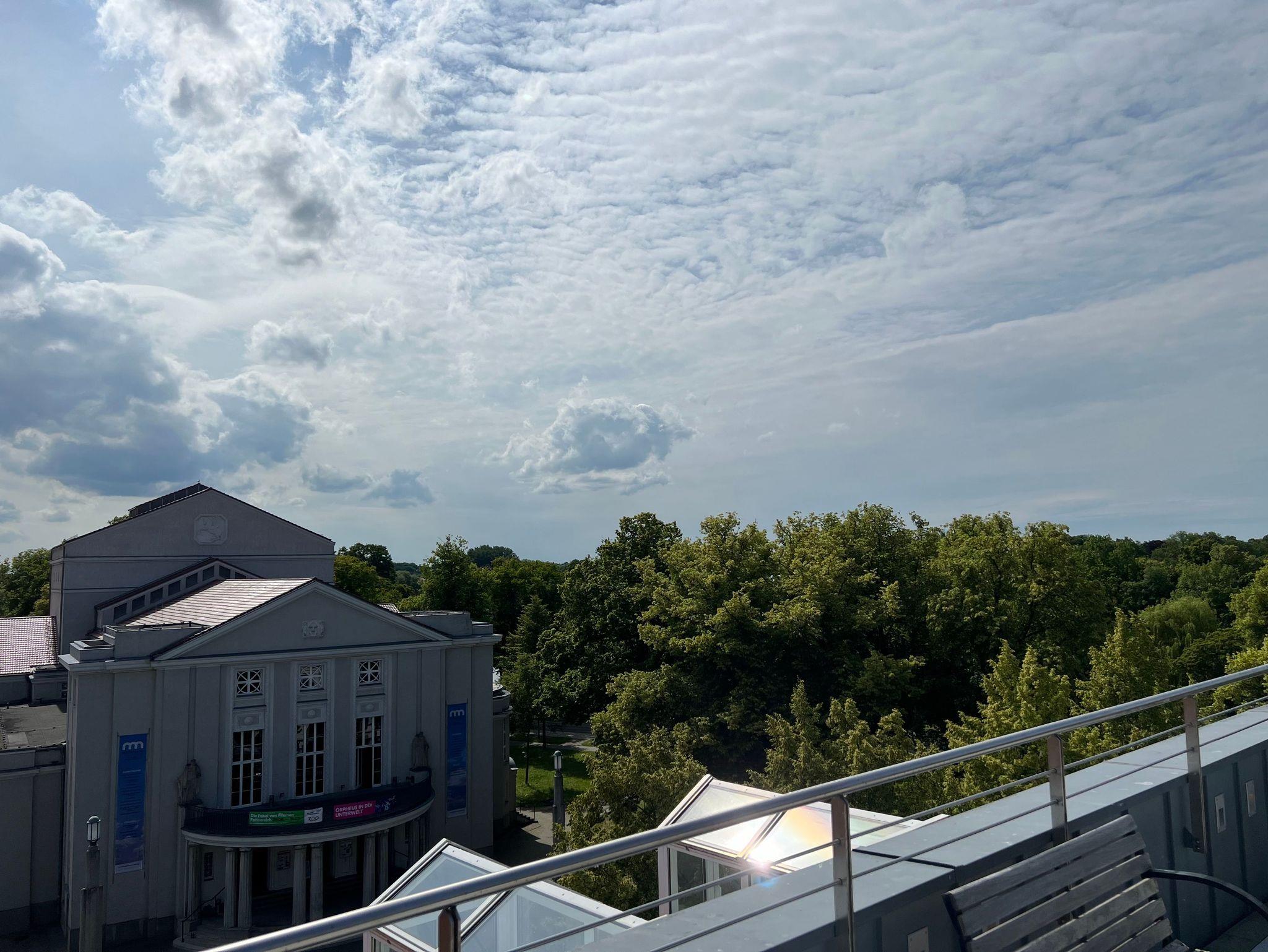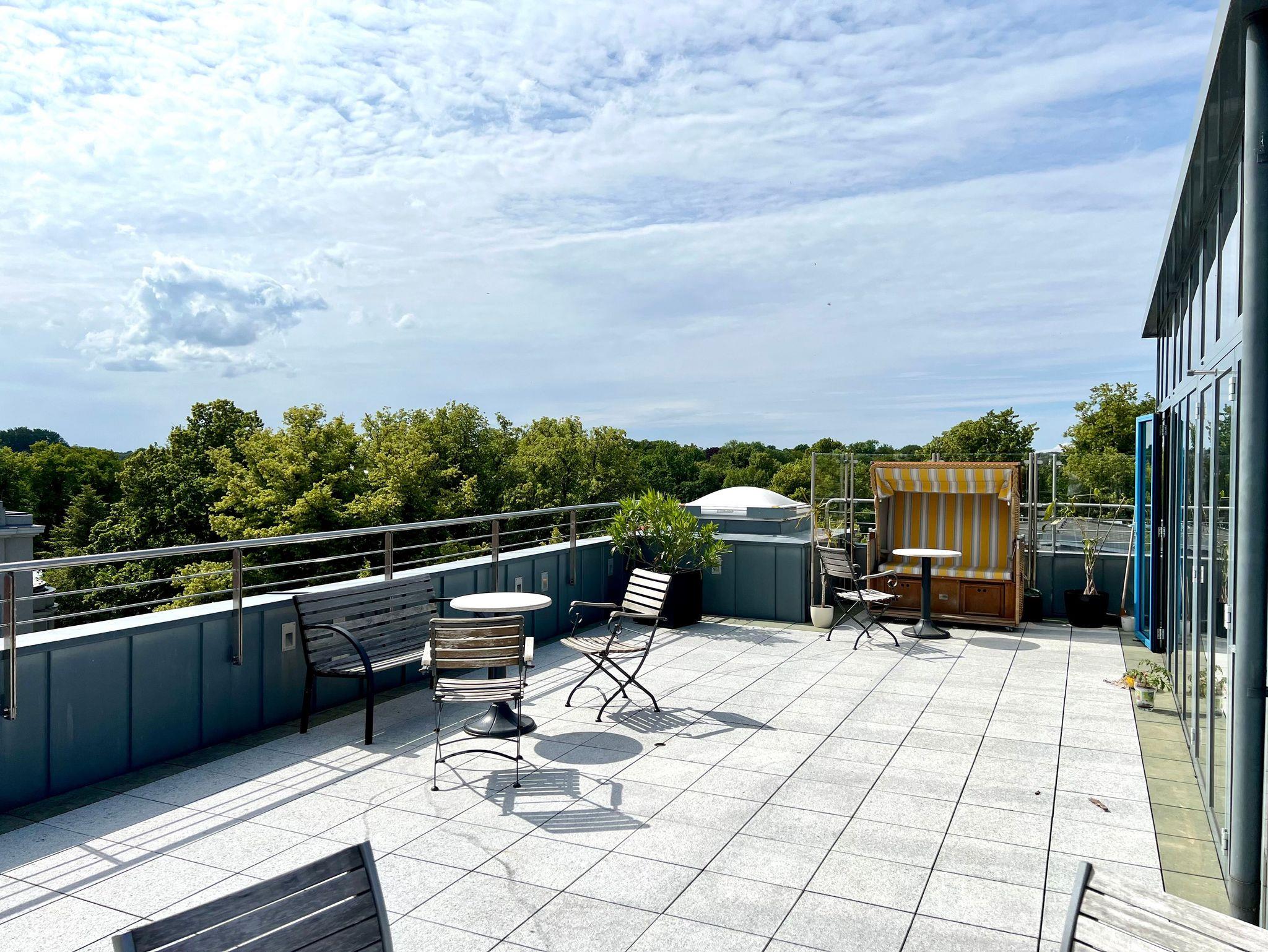 Allen Gästen unseres Hauses steht eine große Gemeinschaftsdachterrasse zur Verfügung. Hier haben Sie einen fantastischen Bilck auf das Stralsunder Theater, die Stadtmauer, die Altstadt und den Hafen.