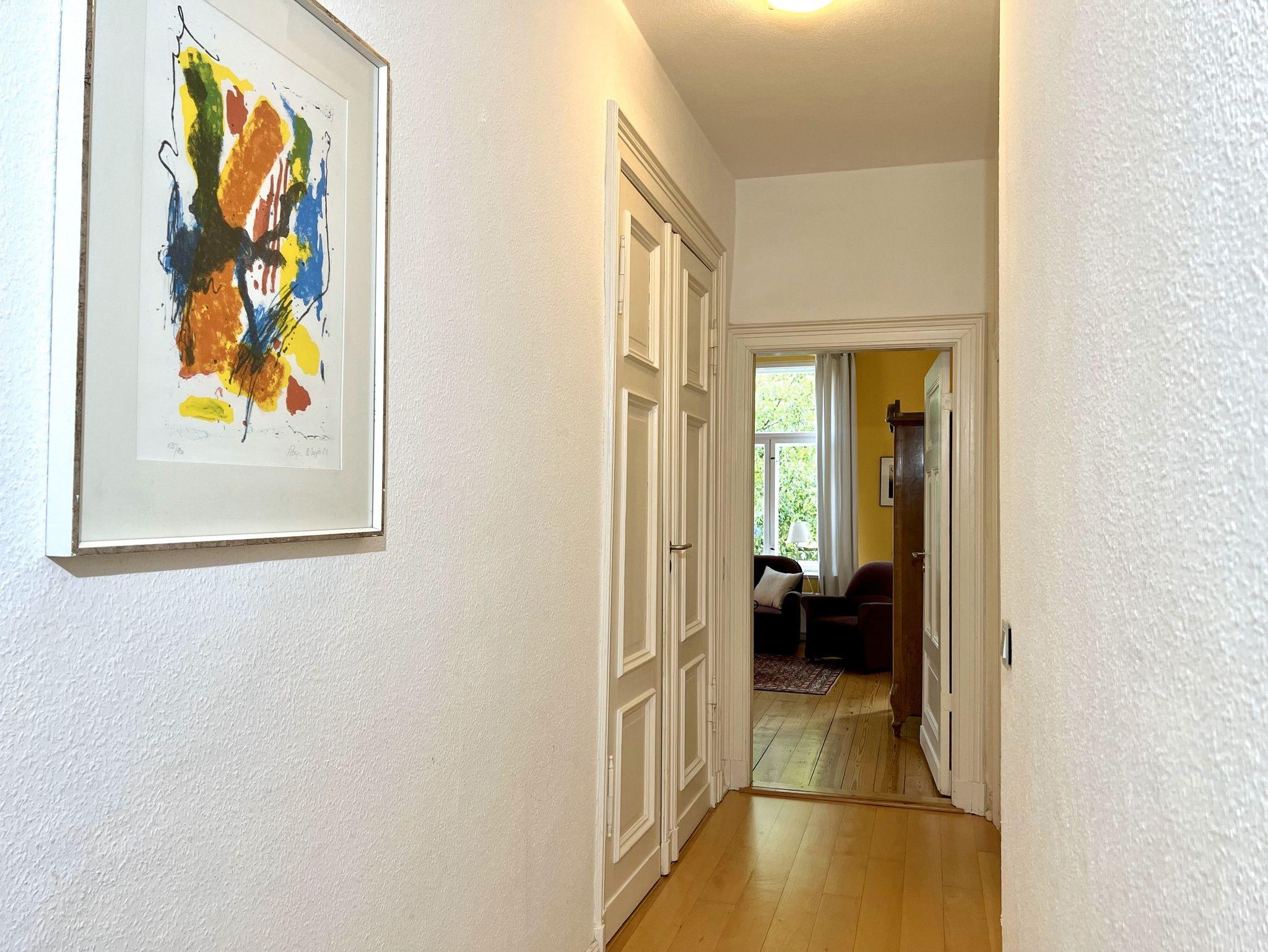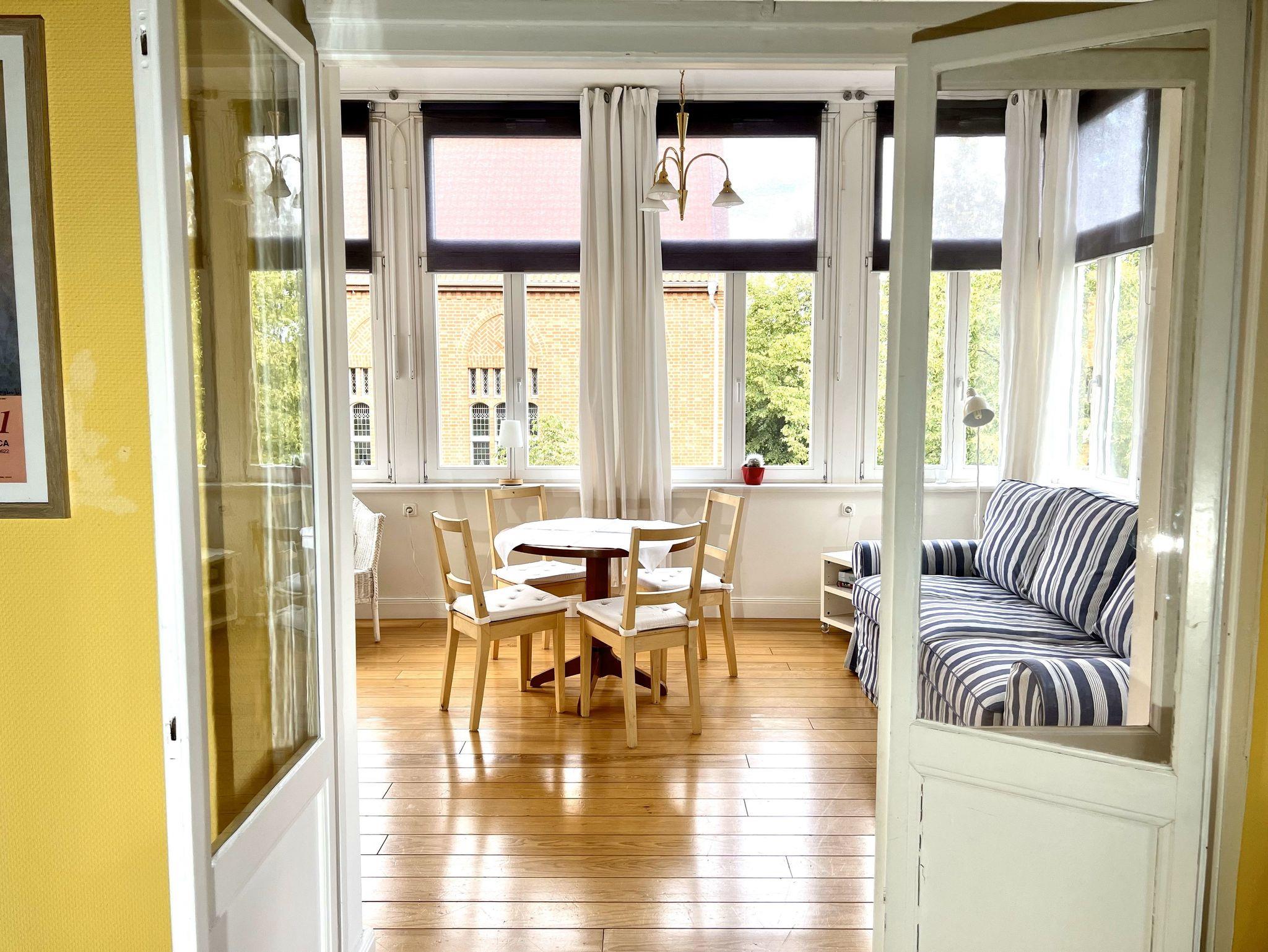 Das komfortable, herrschaftliche Appartement ist 137 qm groß und verfügt über zwei große Schlafzimmer mit Doppelbett (180 x 200 cm) und Stuckdecke, ein ebenfalls mit Stuck verziertes, gemütliches Wohnzimmer mit Chemineeofen, Stereoanlage, einen Wintergarten mit Bettsofa (hier ist eine Kinderaufbettung möglich), eine moderne Einbauküche mit ausziehbarem Esstisch sowie ein Bad mit Badewanne/DU/WC und ein Bad mit Du/WC. WLAN kostenfrei. In dieser Wohnung können bis zu 2 Kinderbettchen aufgestellt werden.