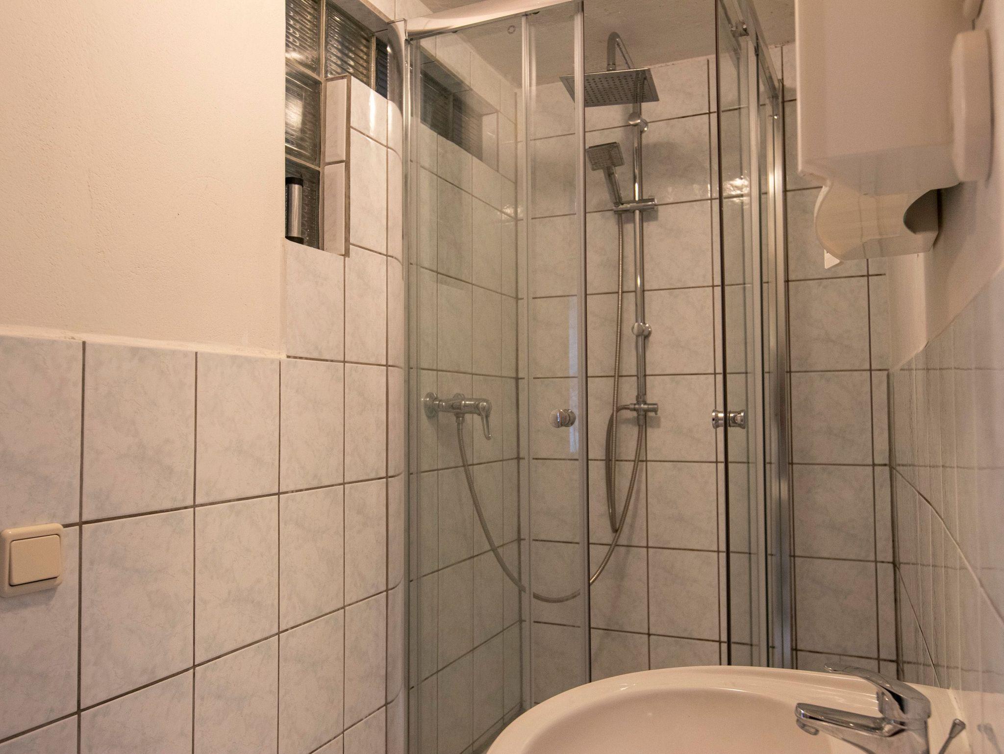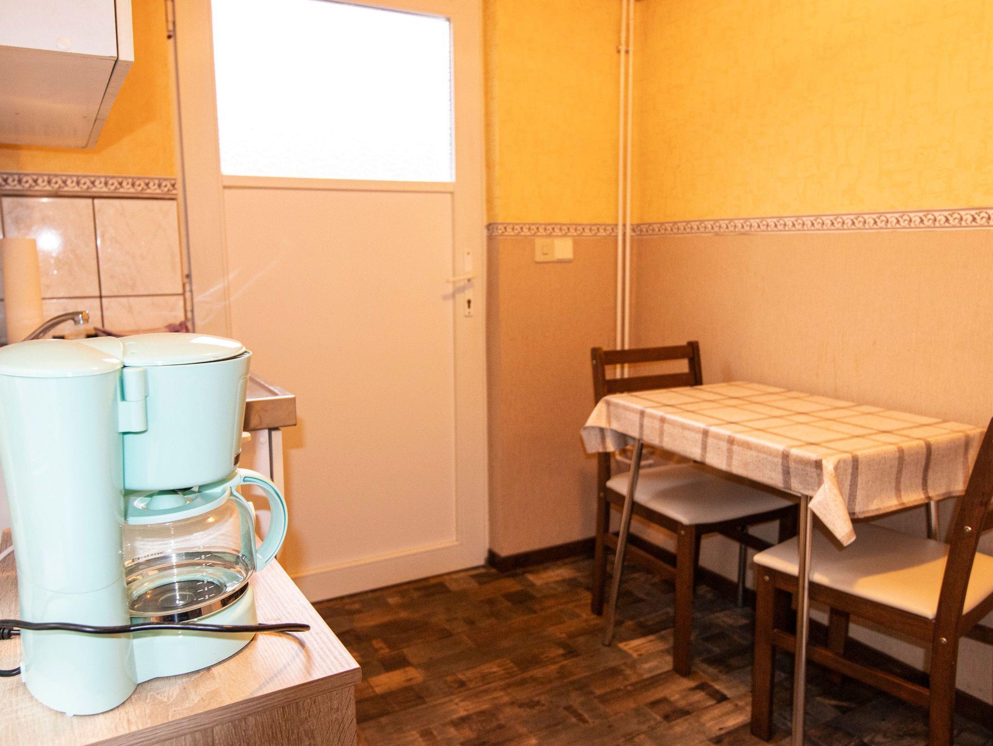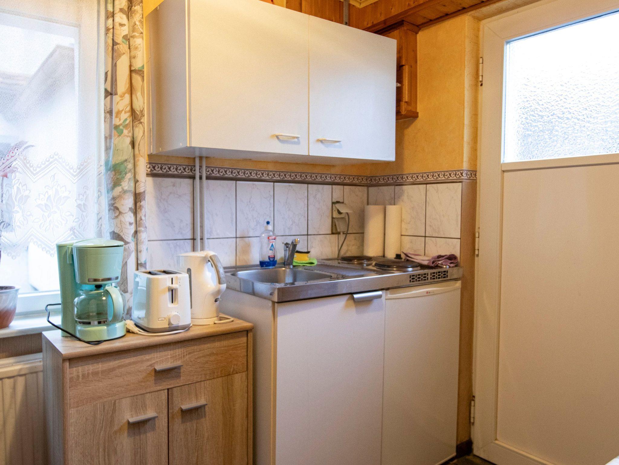 Im Eingangsbereich der kleinen 22m² Maisonettewohnung befindet sich eine kleine, voll ausgestattete Singleküche (2-Kochplatten, Kühlschrank, Kaffeemaschine, Wasserkocher etc.), ein Tisch mit 2 Stühlen. Von dort gelangt man in das Bad mit Dusche, Waschbecken und WC.