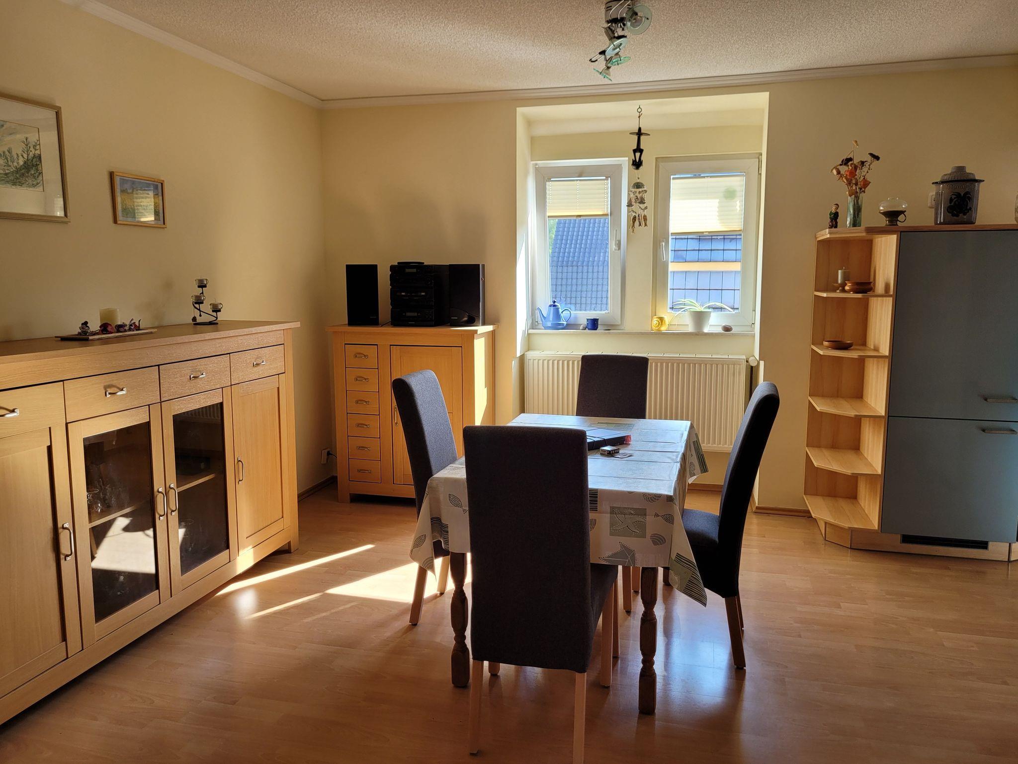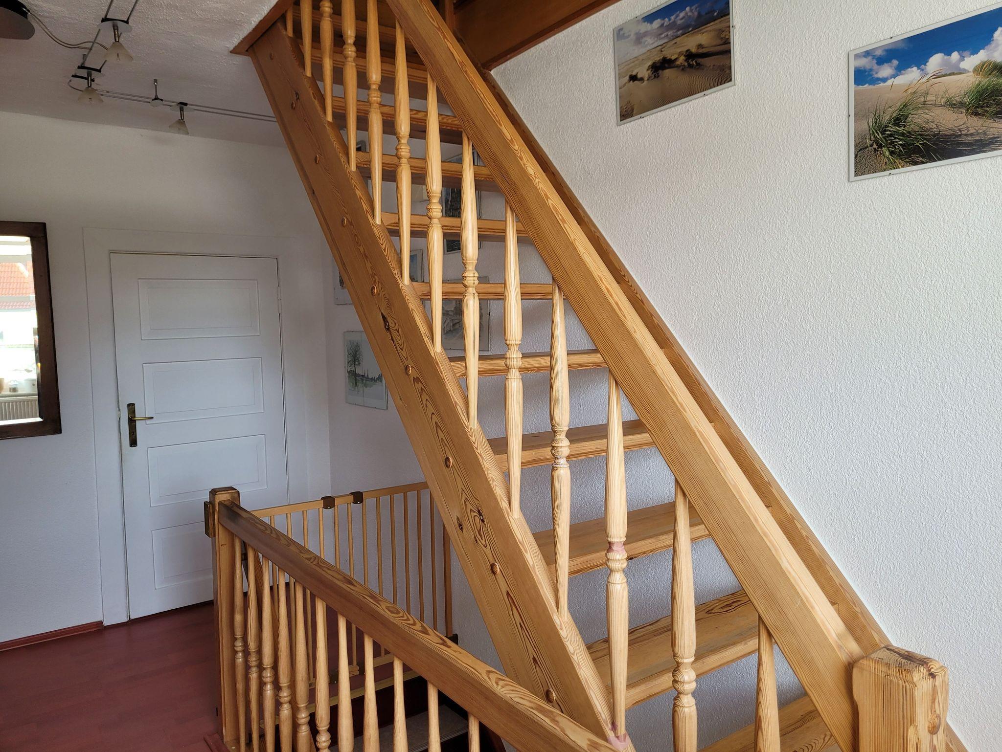 Die Ferienwohnung verfügt über 2 Etagen (1. Etage + Dachgeschoss) und befindet sich in der 1.Etage eines Zweifamilienhauses. Sie umfasst neben einer offenen Küche und dem Bad, einen Essraum, einen kombinierten Wohn- Schlafraum sowie ein separates Schlafzimmer. Bei Bedarf kann ein zweites Schlafzimmer im Dachgeschoß genutzt werden. Die Vermieter wohnen im Erdgeschoss. Bitte beachten Sie die Treppen, siehe Fotos.