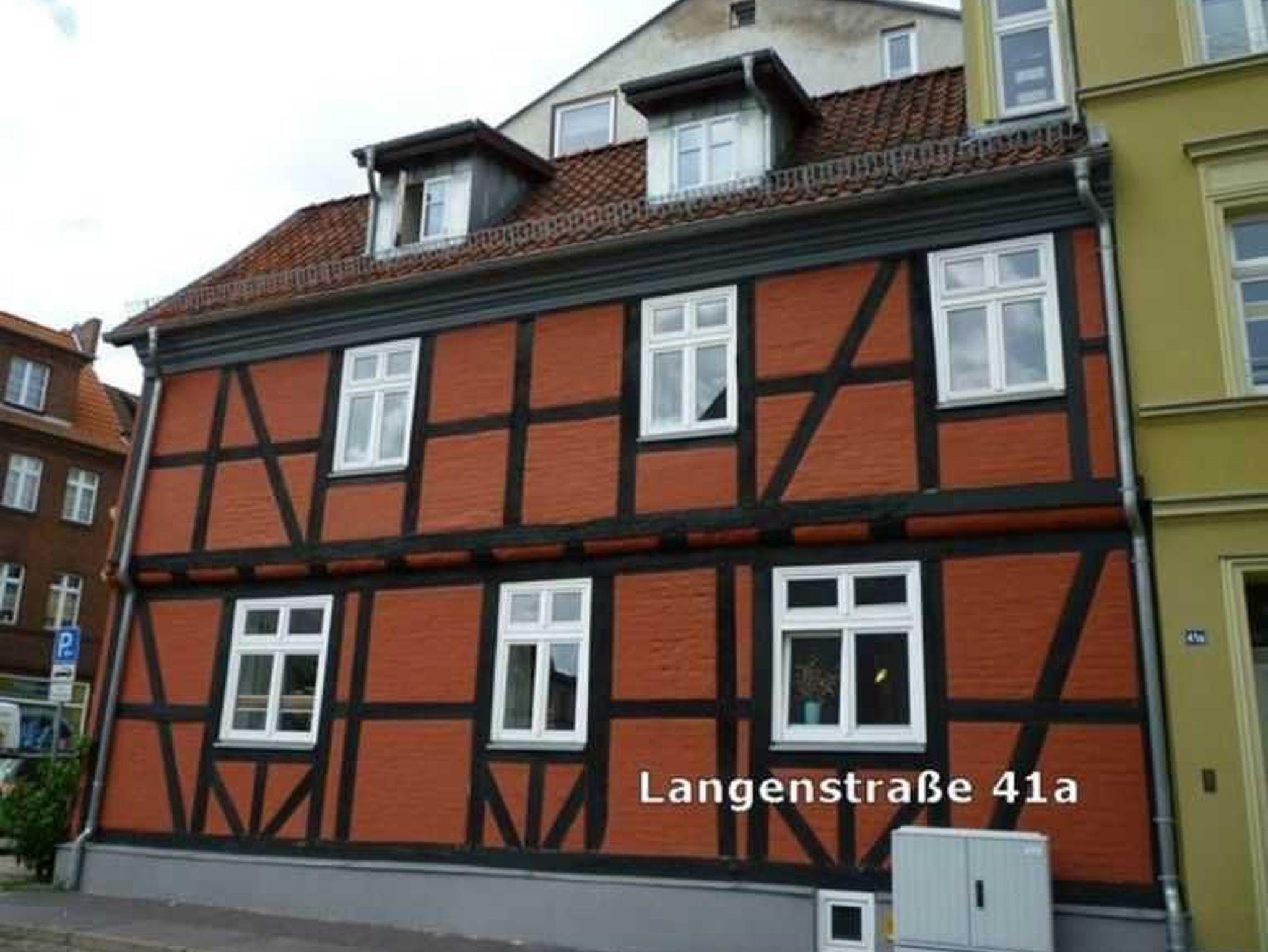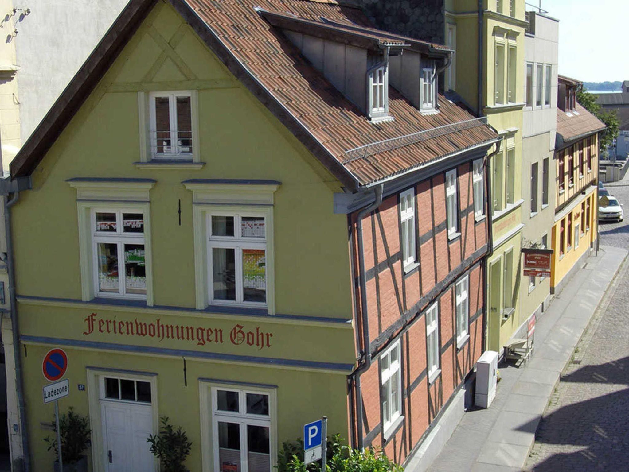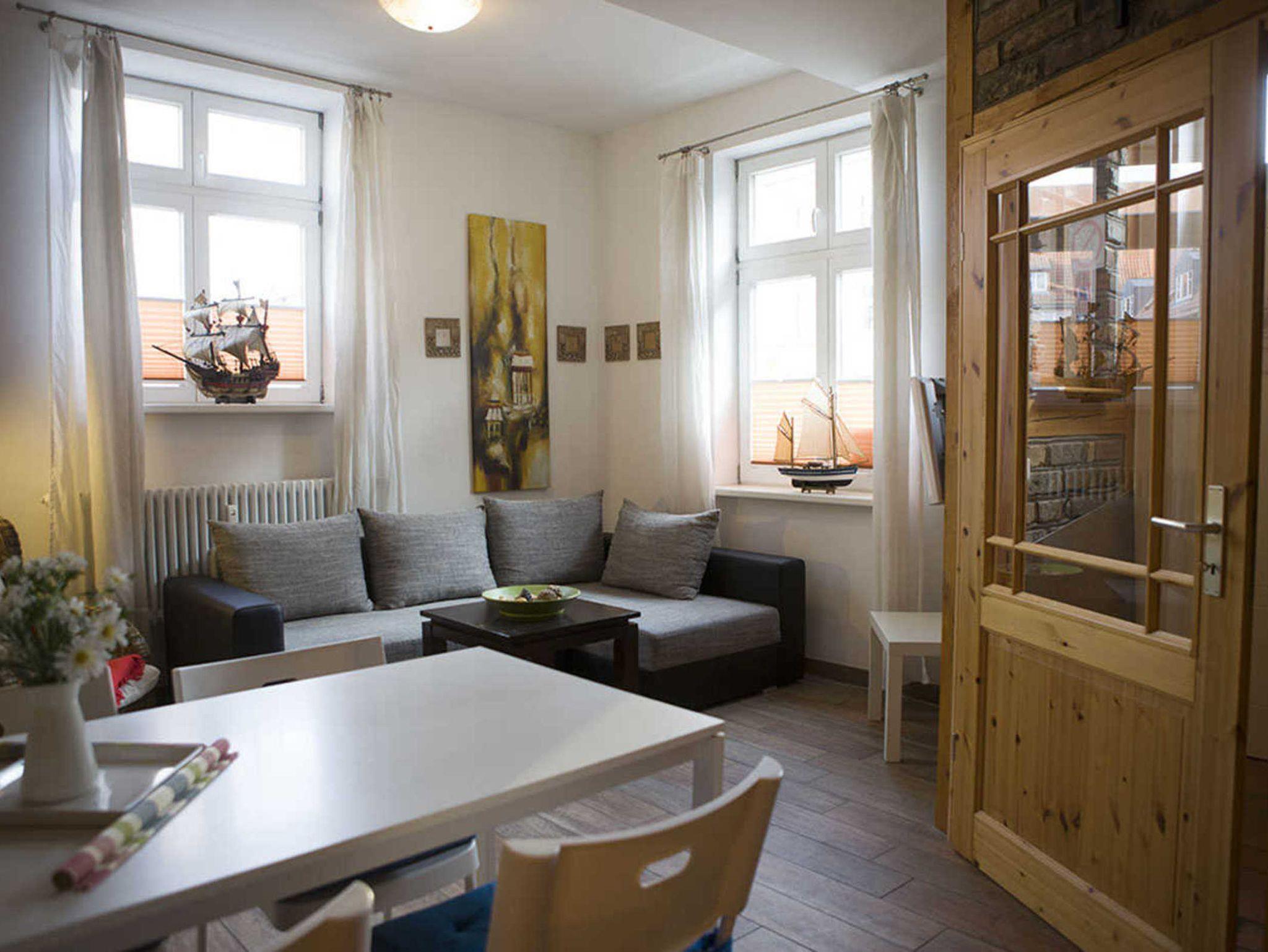 Unsere Ferienwohnung (ca. 45 m²) befindet sich in der Langenstr. 41a im 1. Obergeschoss in der Altstadt am Hafen. Sie verfügt über ein Wohnzimmer und ein extra Schlafzimmer mit Doppelbett. Die Aufbettung für die 3. und 4. Person befindet sich auf der Schlafcouch im Wohnzimmer. Das Bad ist gefliest mit Dusche und WC. Die separate Küche