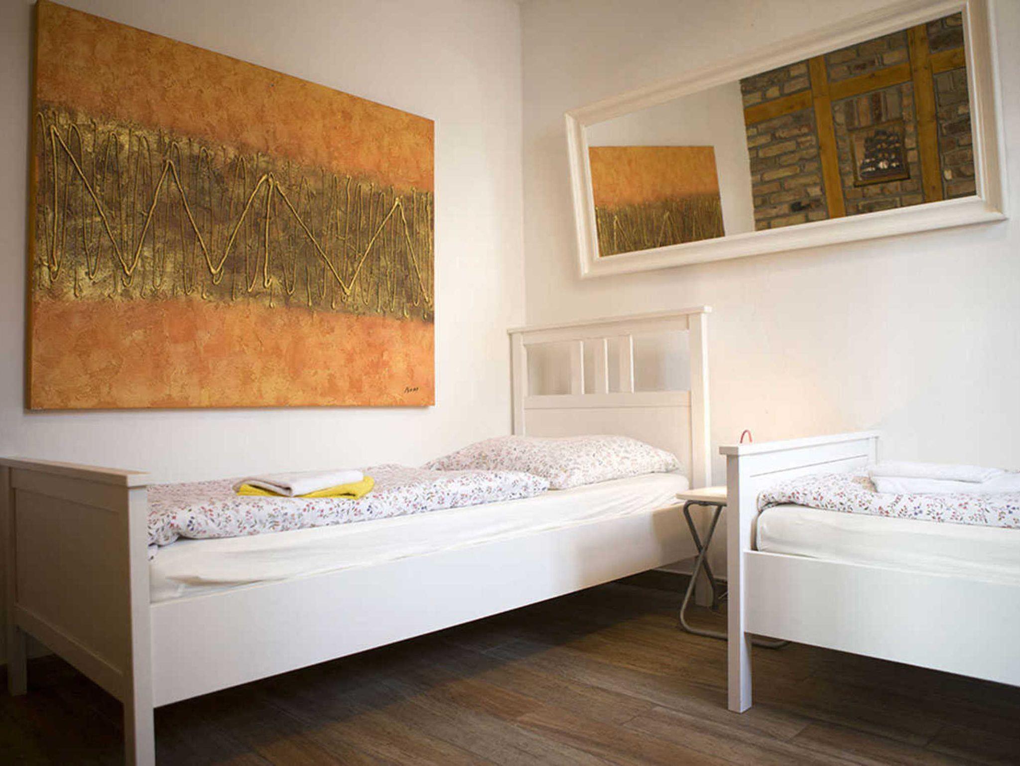 Die FeWo verfügt über eine offene Wohnküche mit Wohnbereich und einem Schlafzimmer mit 2 Einzelbetten. Das Bad ist innenliegend, gefliest und ebenerdig.