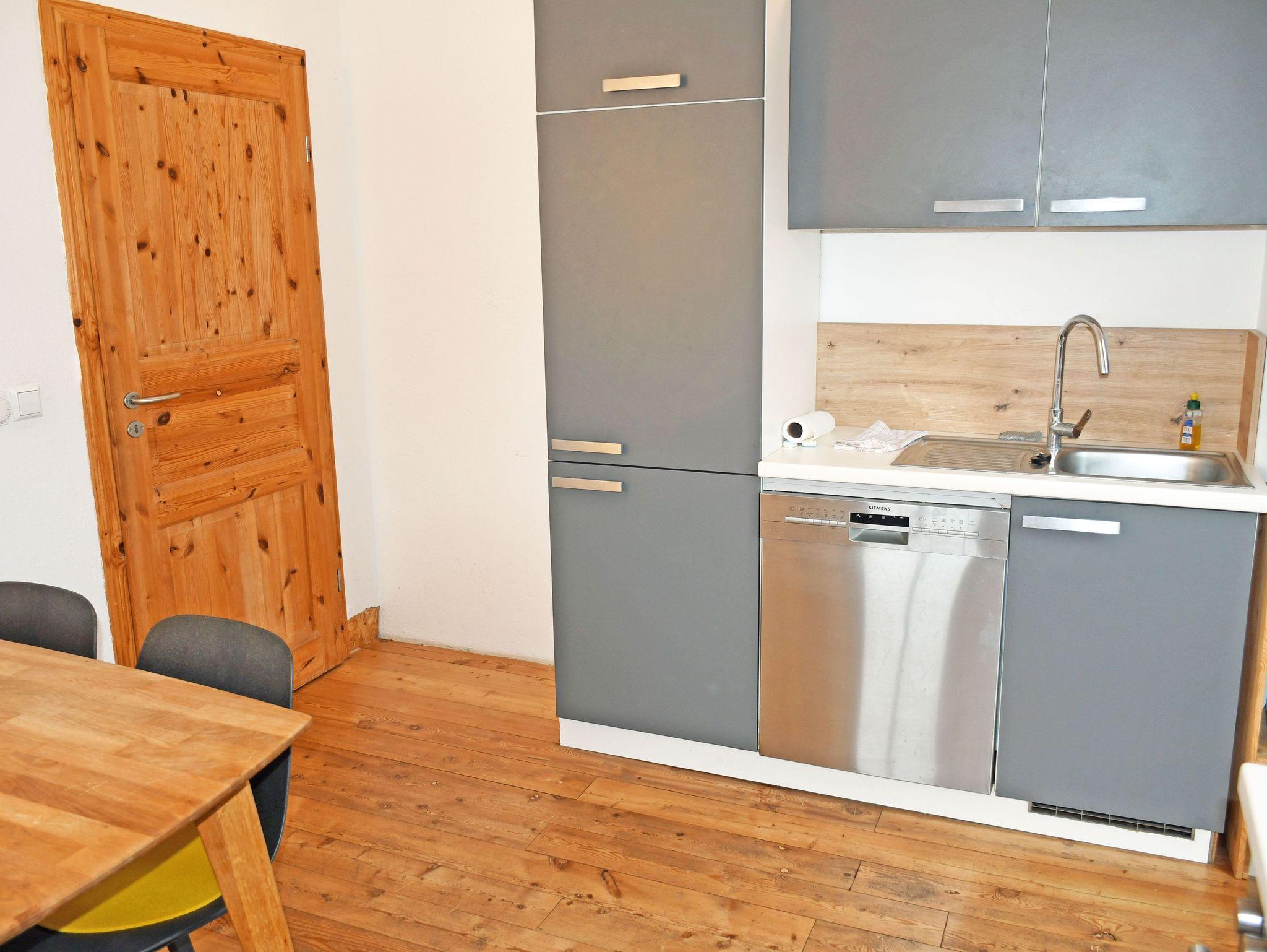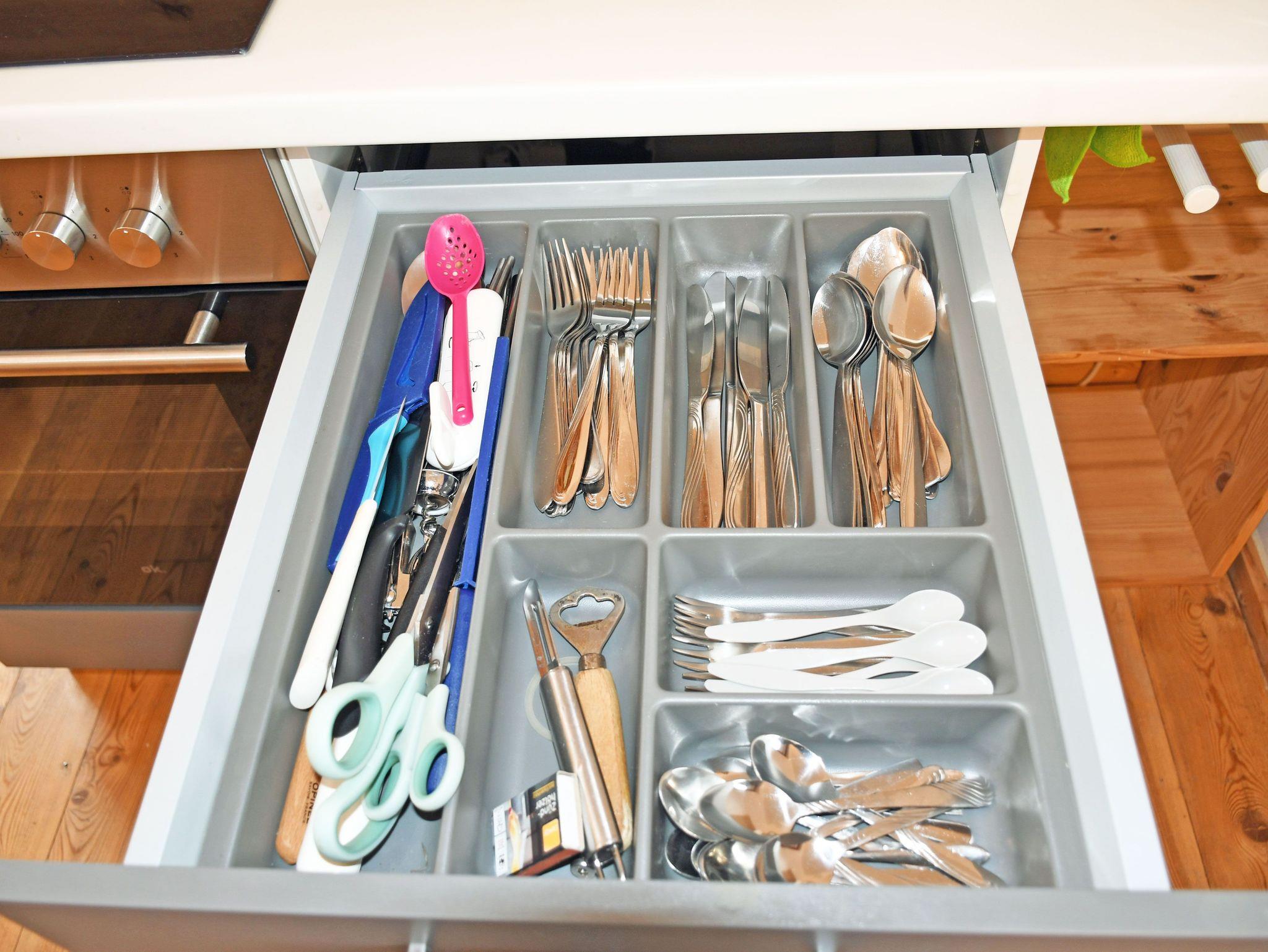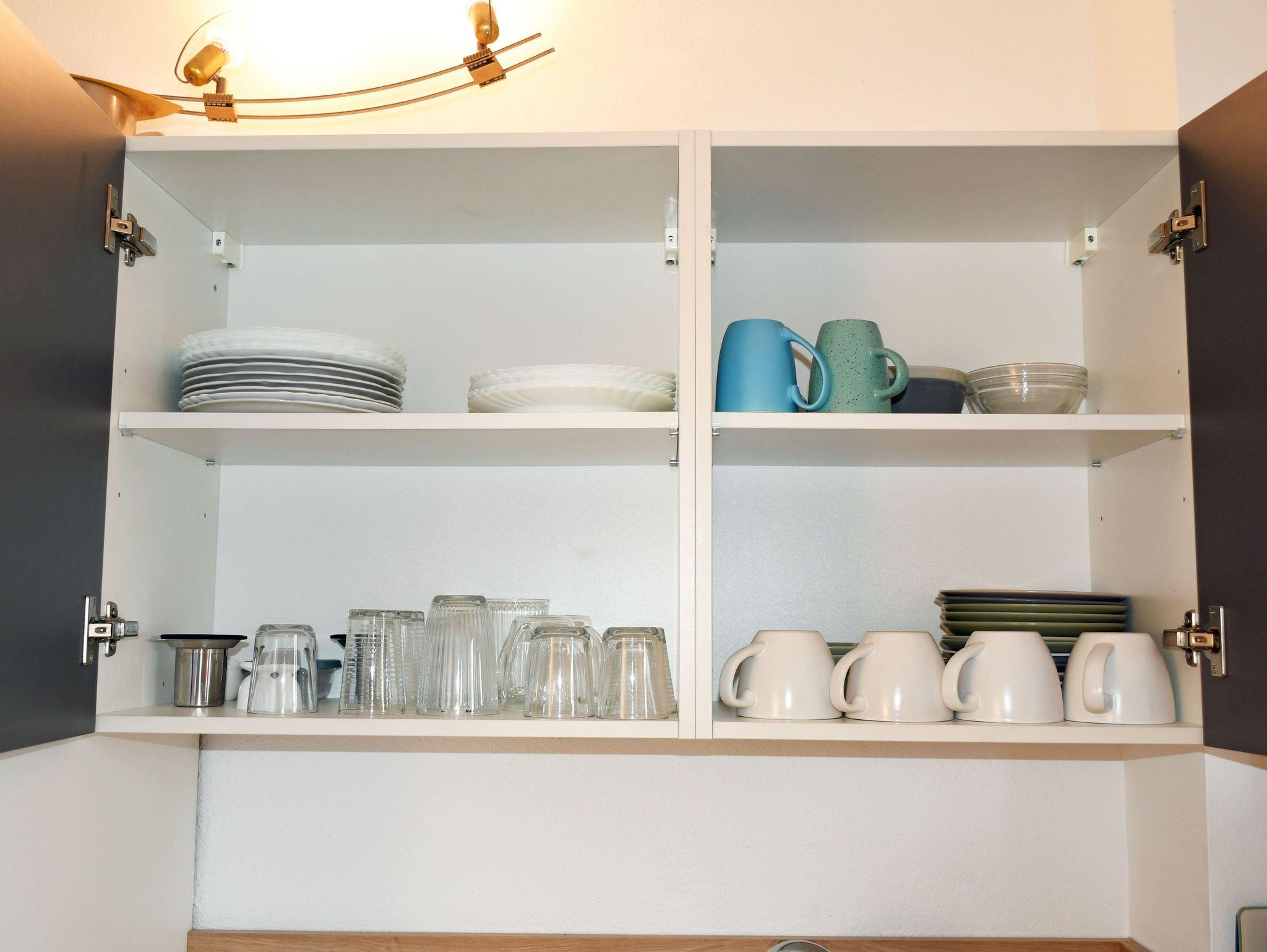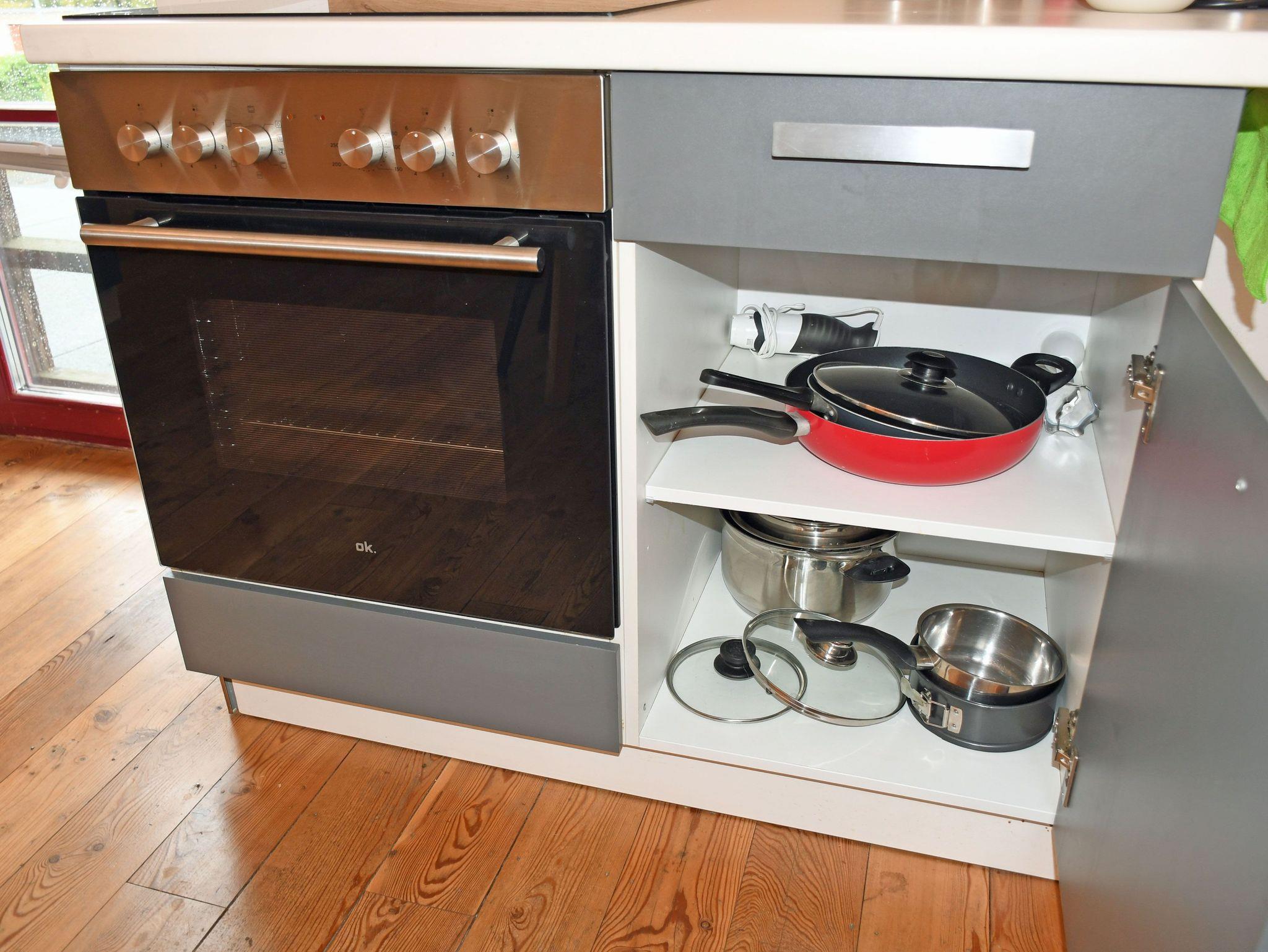 Die moderne separate Küche ist mit einem Ceranfeld-Herd, Backofen, Wasserkocher, Kaffeemaschine, Toaster und Kühlschrank mit Gefrierfach komplett ausgestattet. Hier steht auch ein Esstisch mit Sitzgelegenheiten.