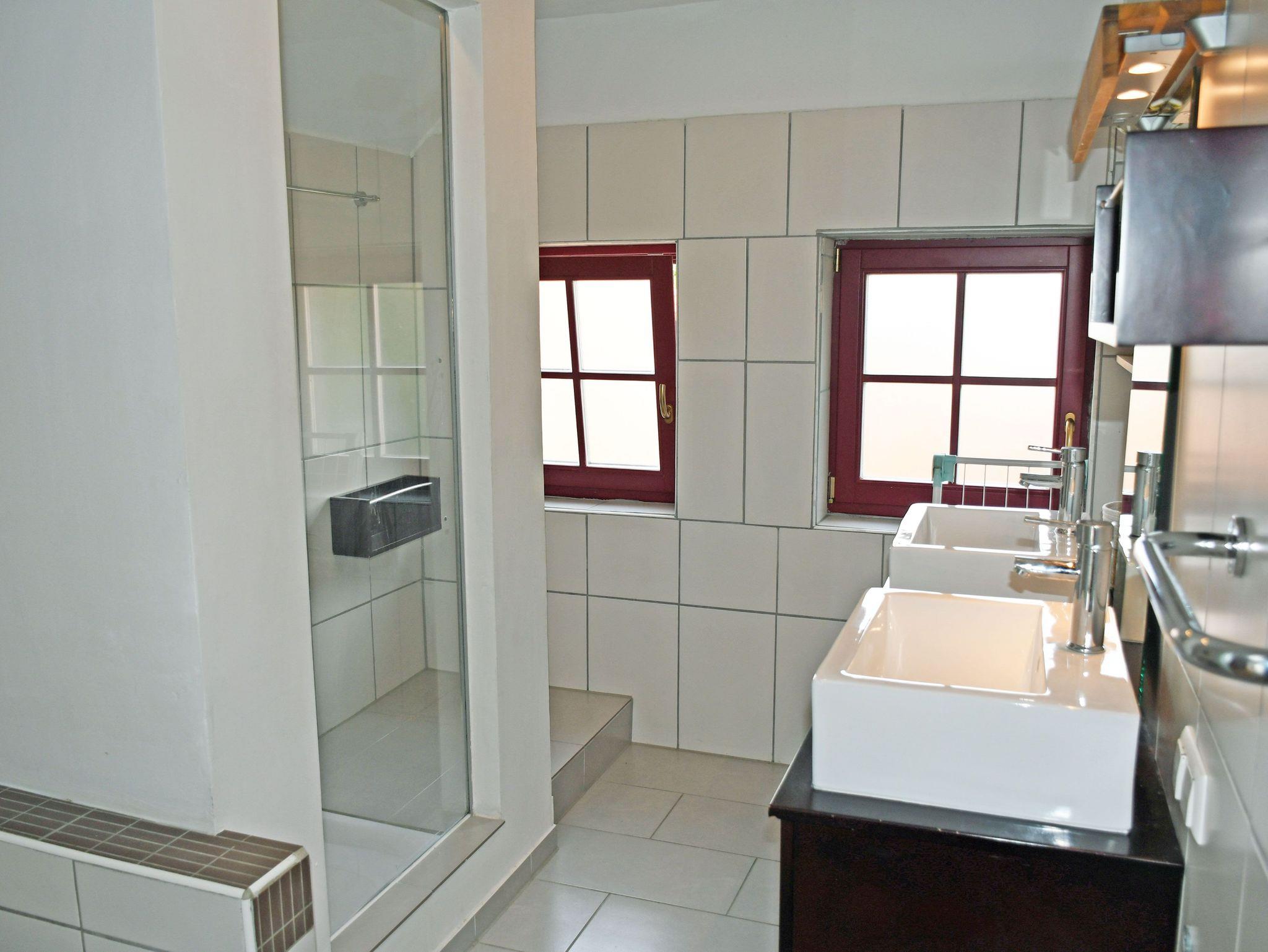 Das moderne Bad ist mit Dusche, Haartrockner, WC und Waschtisch ausgestattet, es hat Fenster und Tageslicht.