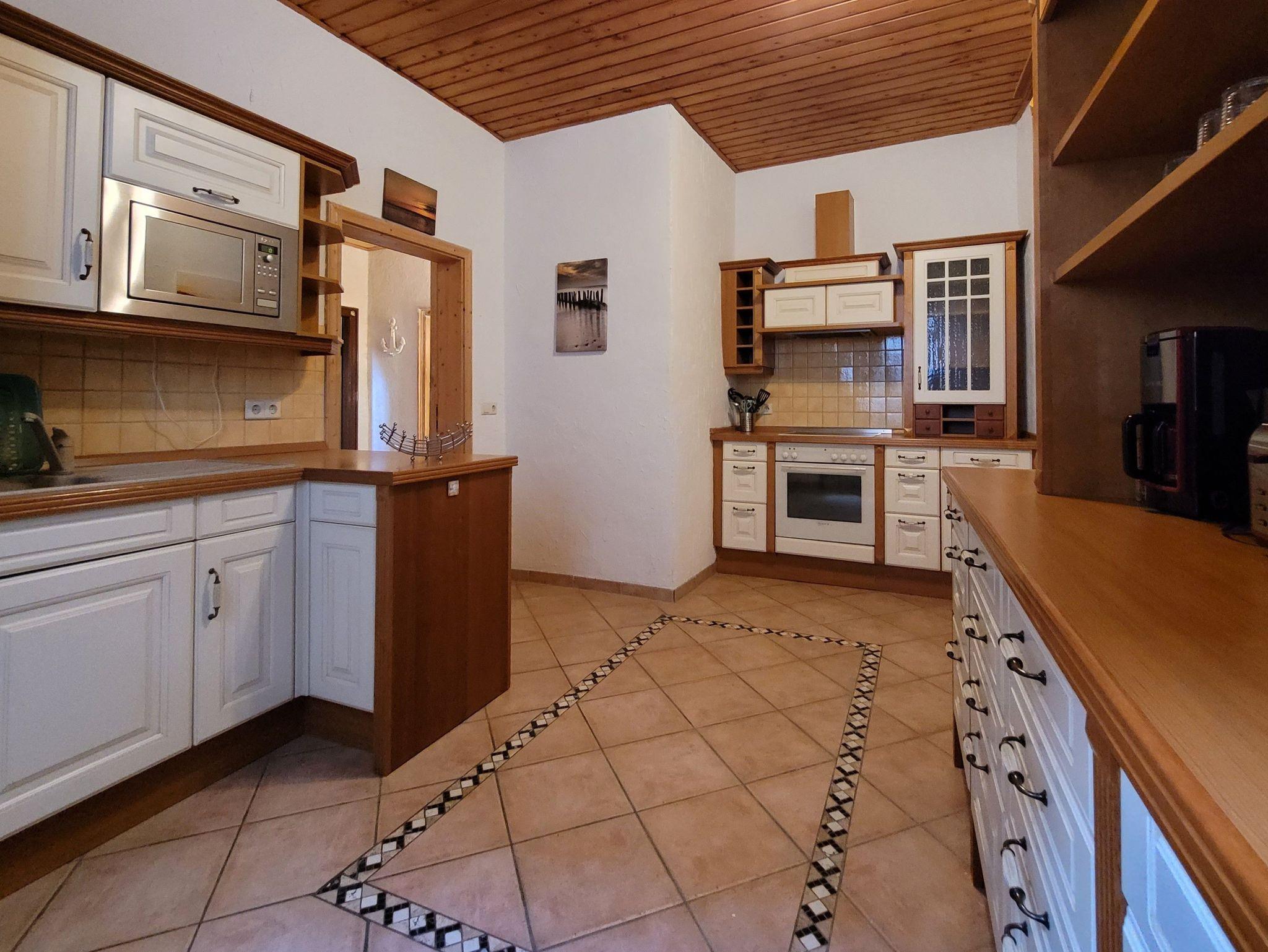 In der Küche sorgen ein Vierplattenherd mit Backofen und eine Mikrowelle für die Eigenversorgung. Ein Kühlschrank mit Tiefkühler sorgt für Frische - ein Toaster, ein Wasserkocher sowie eine Kaffeemaschine für ein leckeres Frühstück.