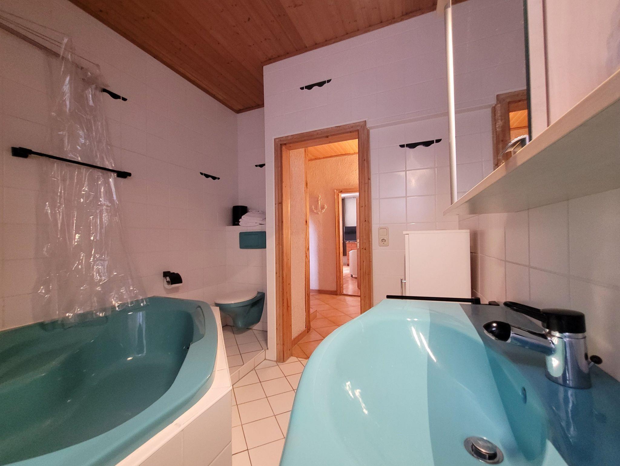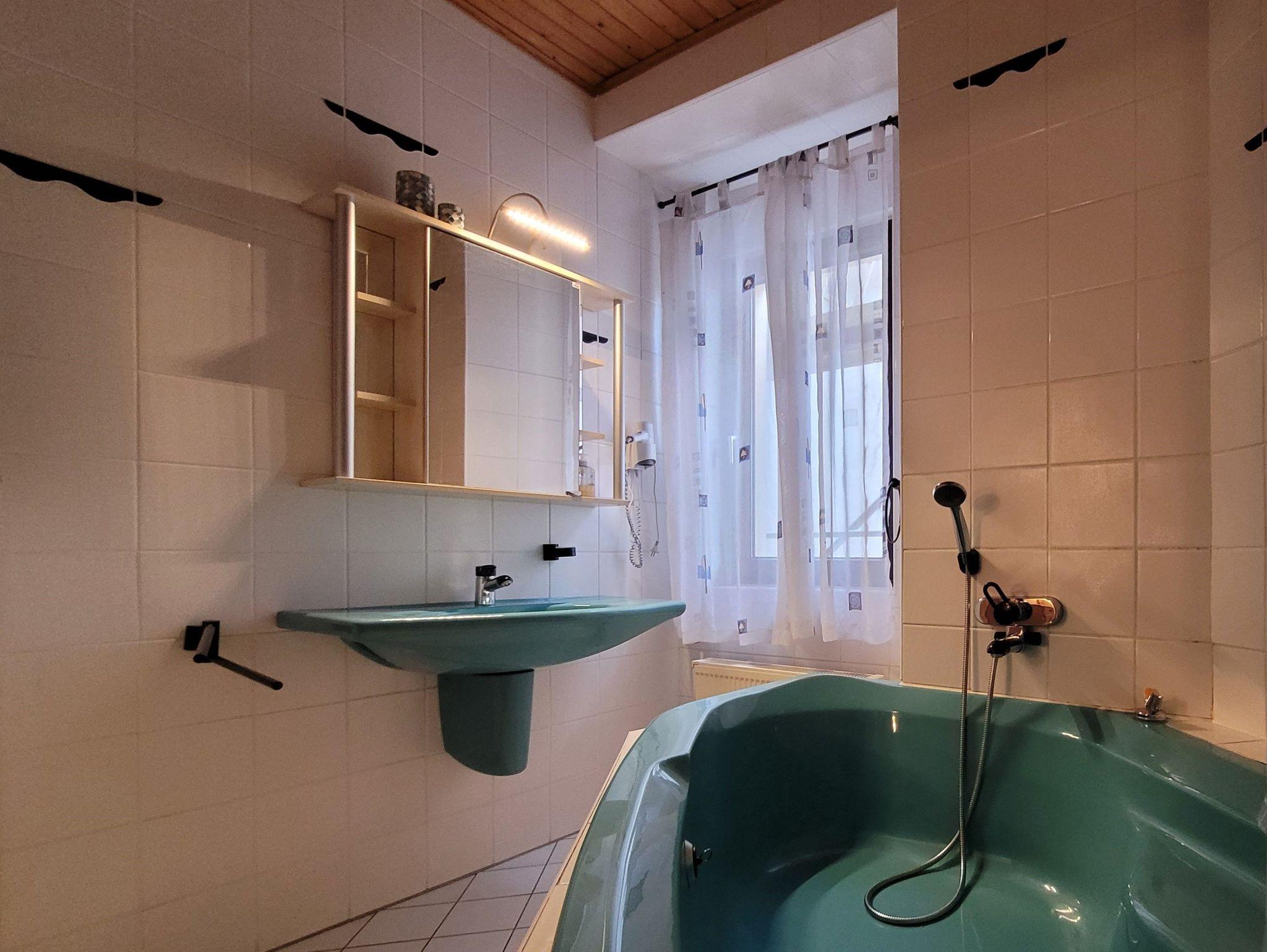 Die Wohnung verfügt über ein Bad mit Badewanne, integrierter Dusche und ein WC.