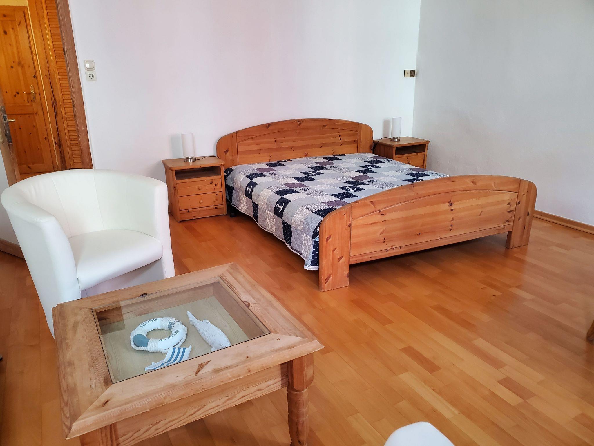 Die Wohnung 2, Oberdeck backbord, befindet sich im 1. Obergeschoss links und hat ca. 70 qm, mit 1 Schlafzimmer mit Doppelbett und einem Wohnzimmer mit vollwertigem Doppelbett plus einer gemütlichen Sitzgarnitur in Form von einer großen Couch mit 2 Sesseln sowie einem gemütlichen runden Esstisch mit 4 Stühlen.