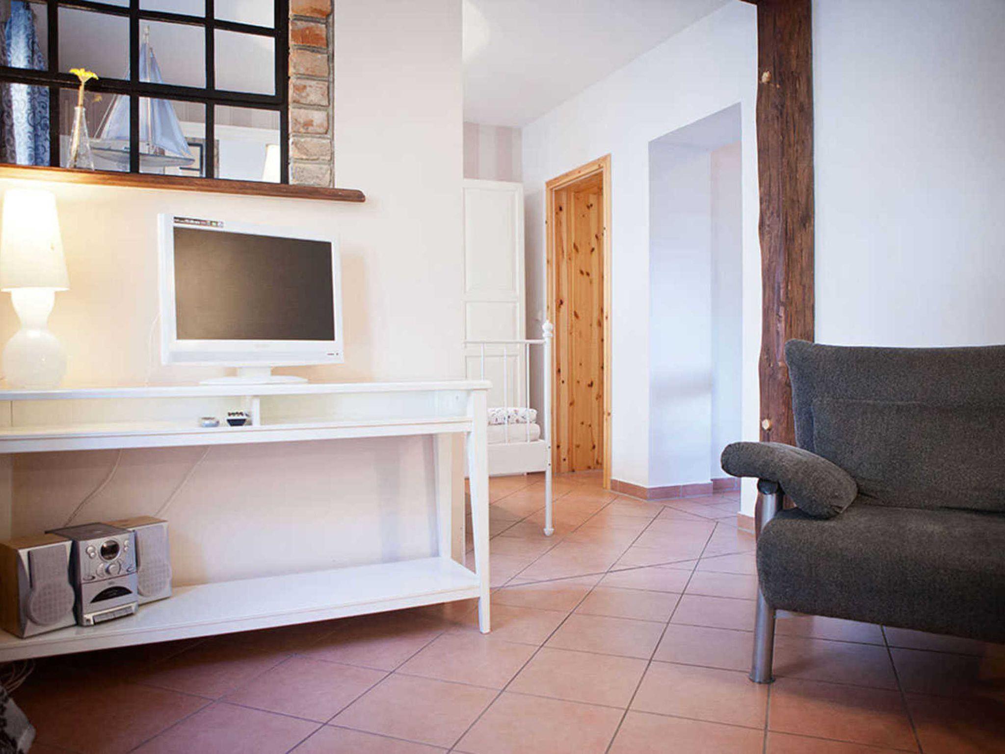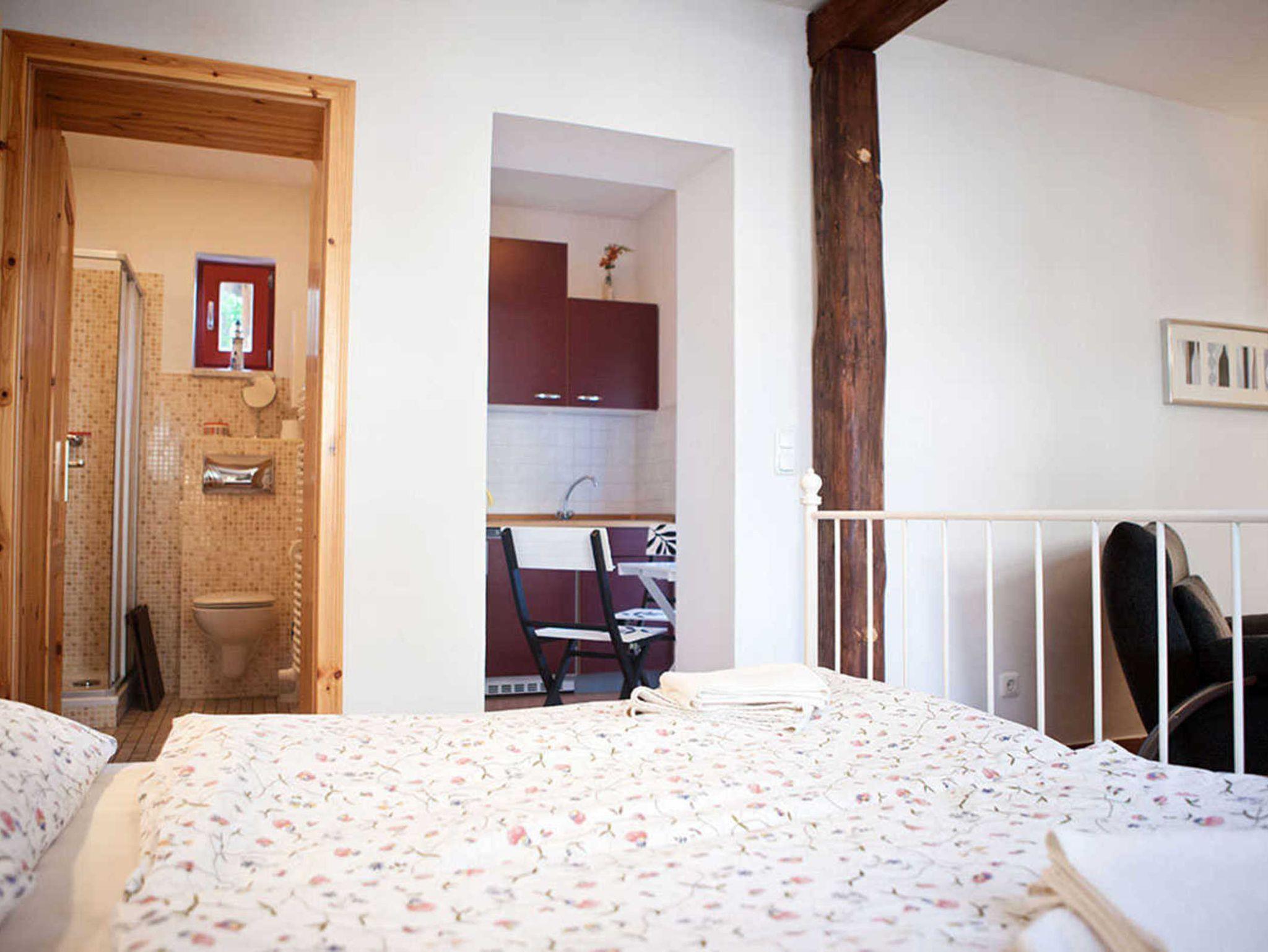 Sie verfügt über einen kombinierten Wohn-/ Schlafraum, mit kl. Couch und offener Küche.